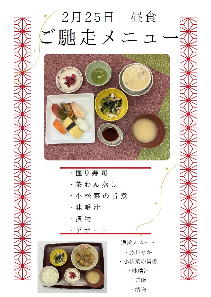 2月25日にごちそうメニューとして「握り寿司」が振舞われます(*'ω' *)