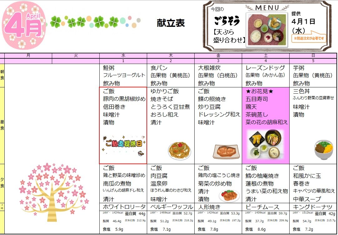 4月1日から5日までの献立をご紹介いたします('ω')ノ