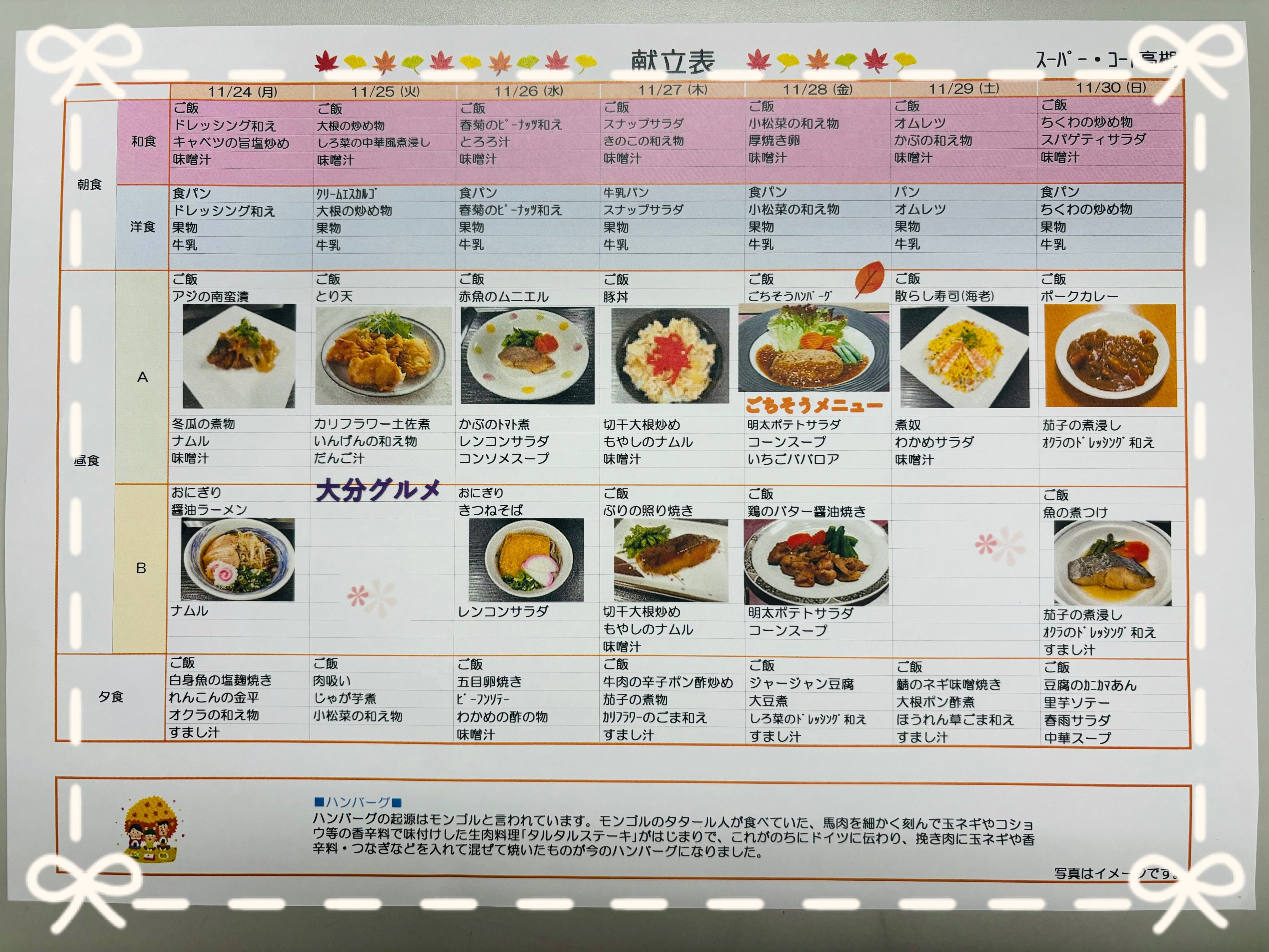 11/3(月)~11/16(日)の献立をご紹介しますね(^^♪