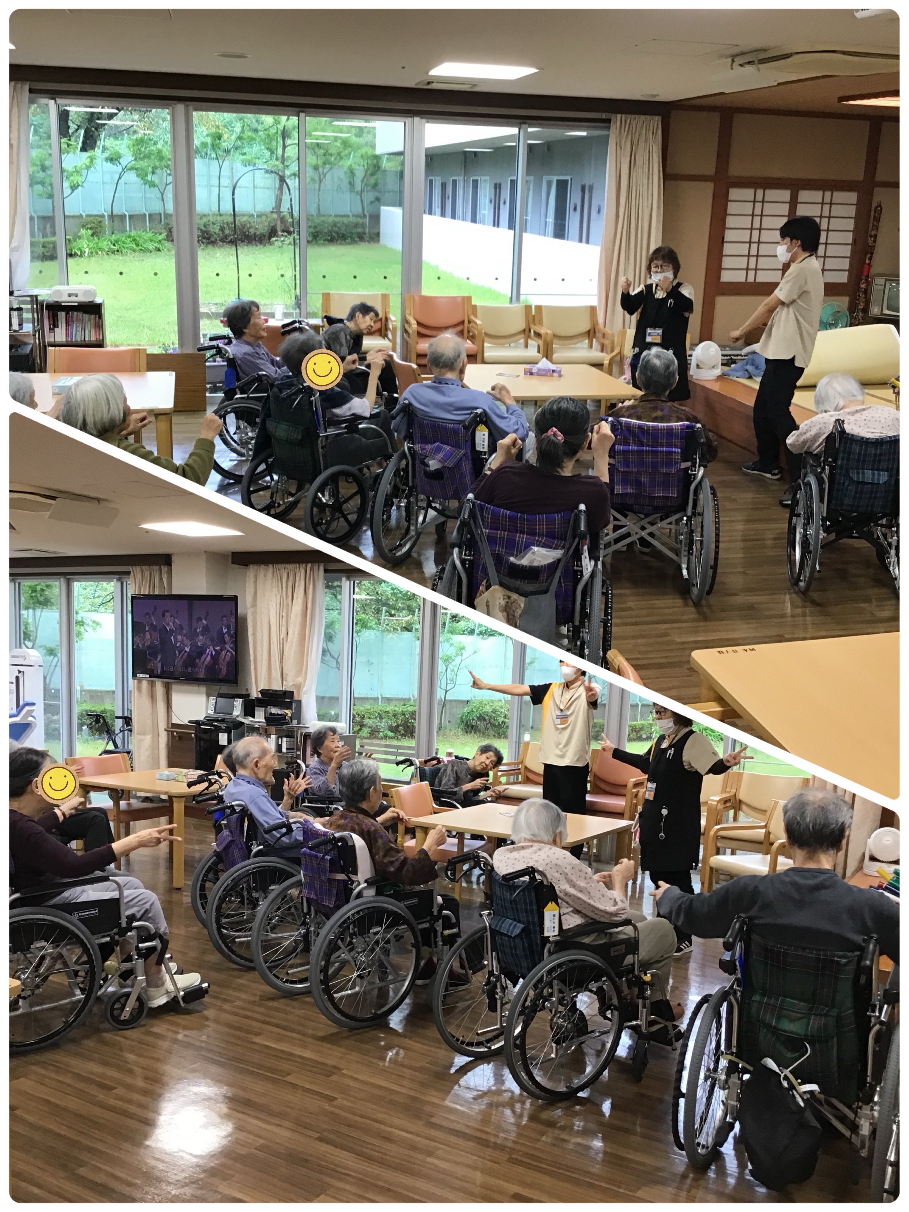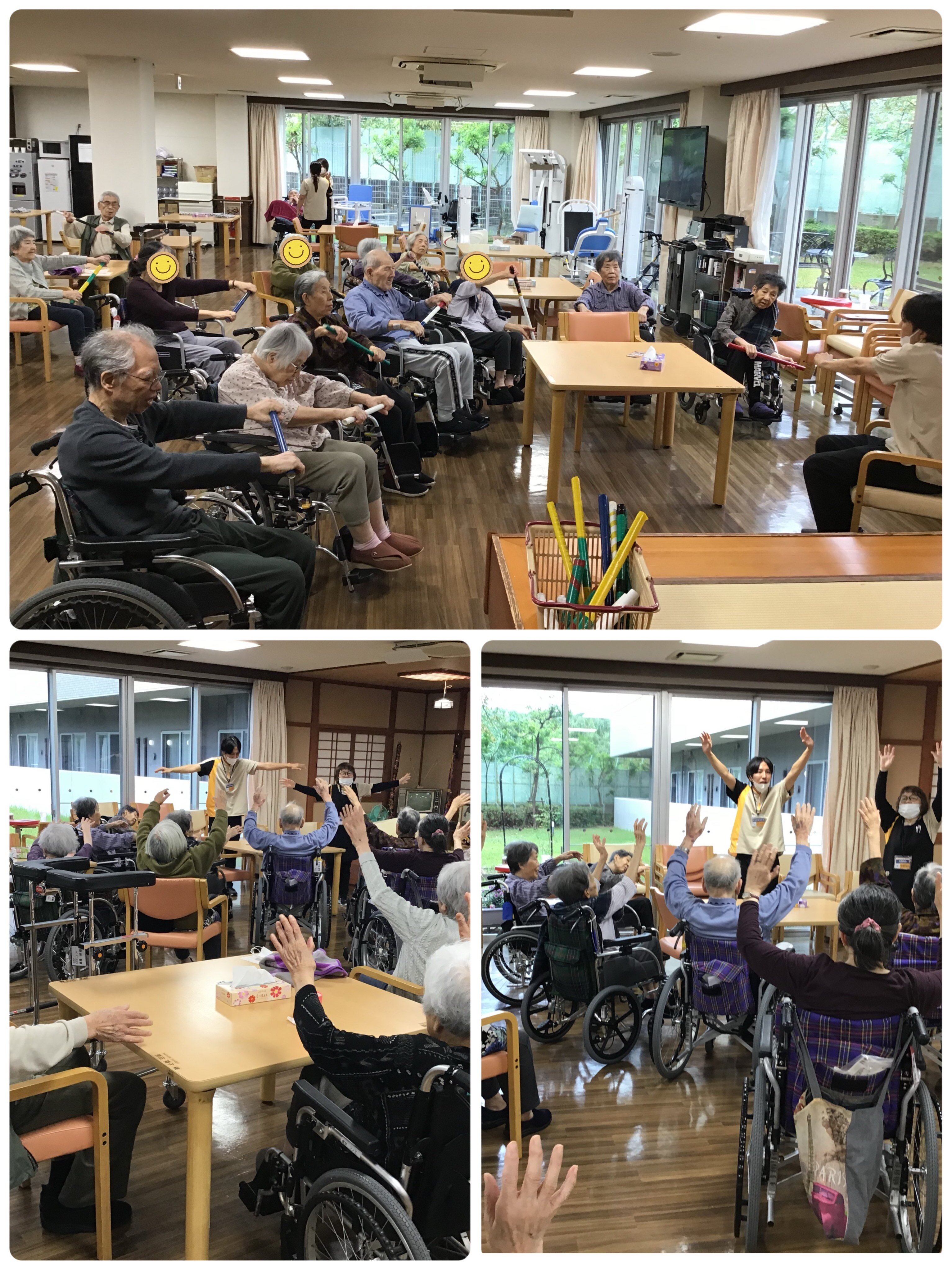 この日は、機能訓練指導員と看護師がご入居者の皆様と一緒に体操を行いました。