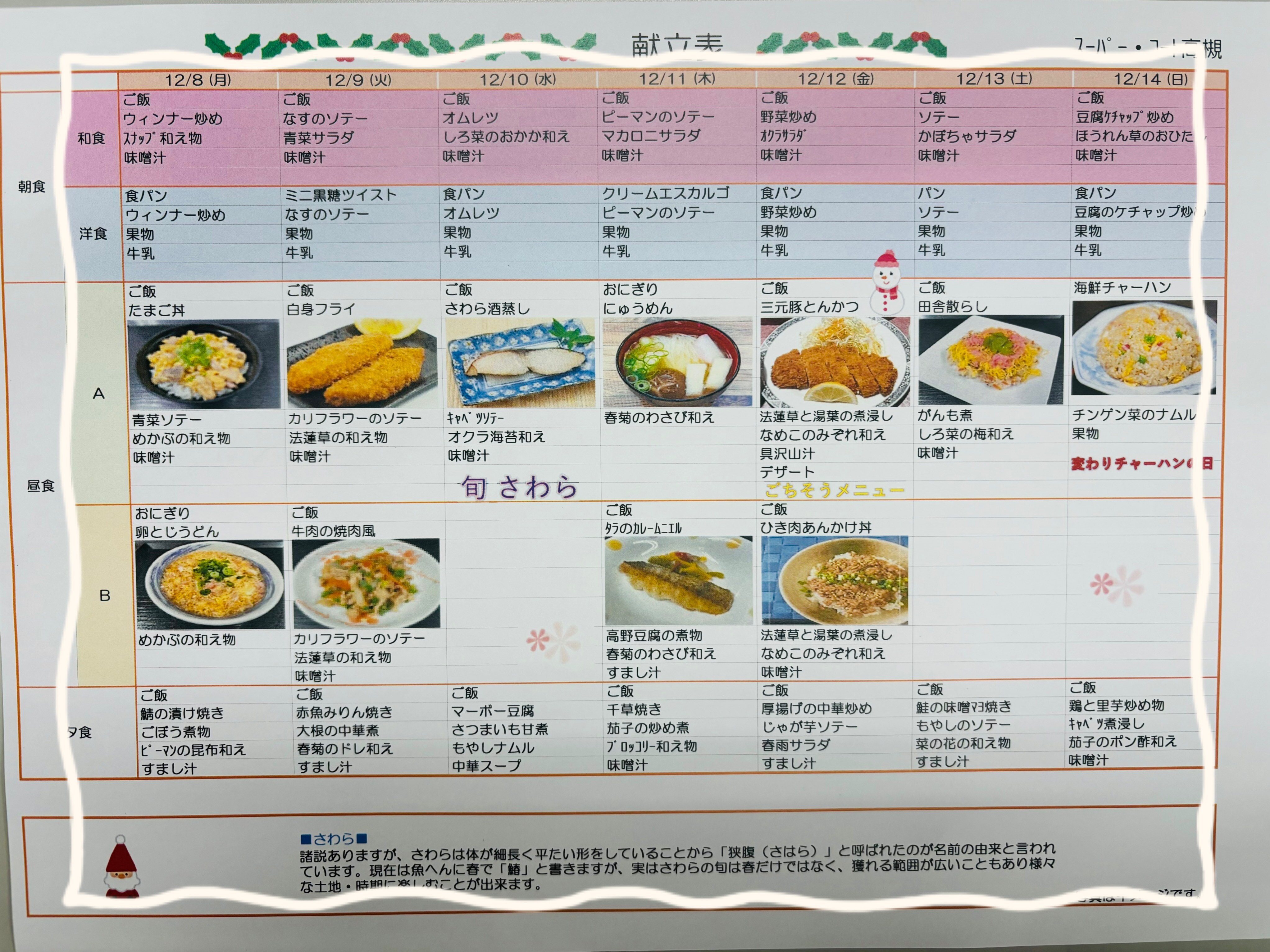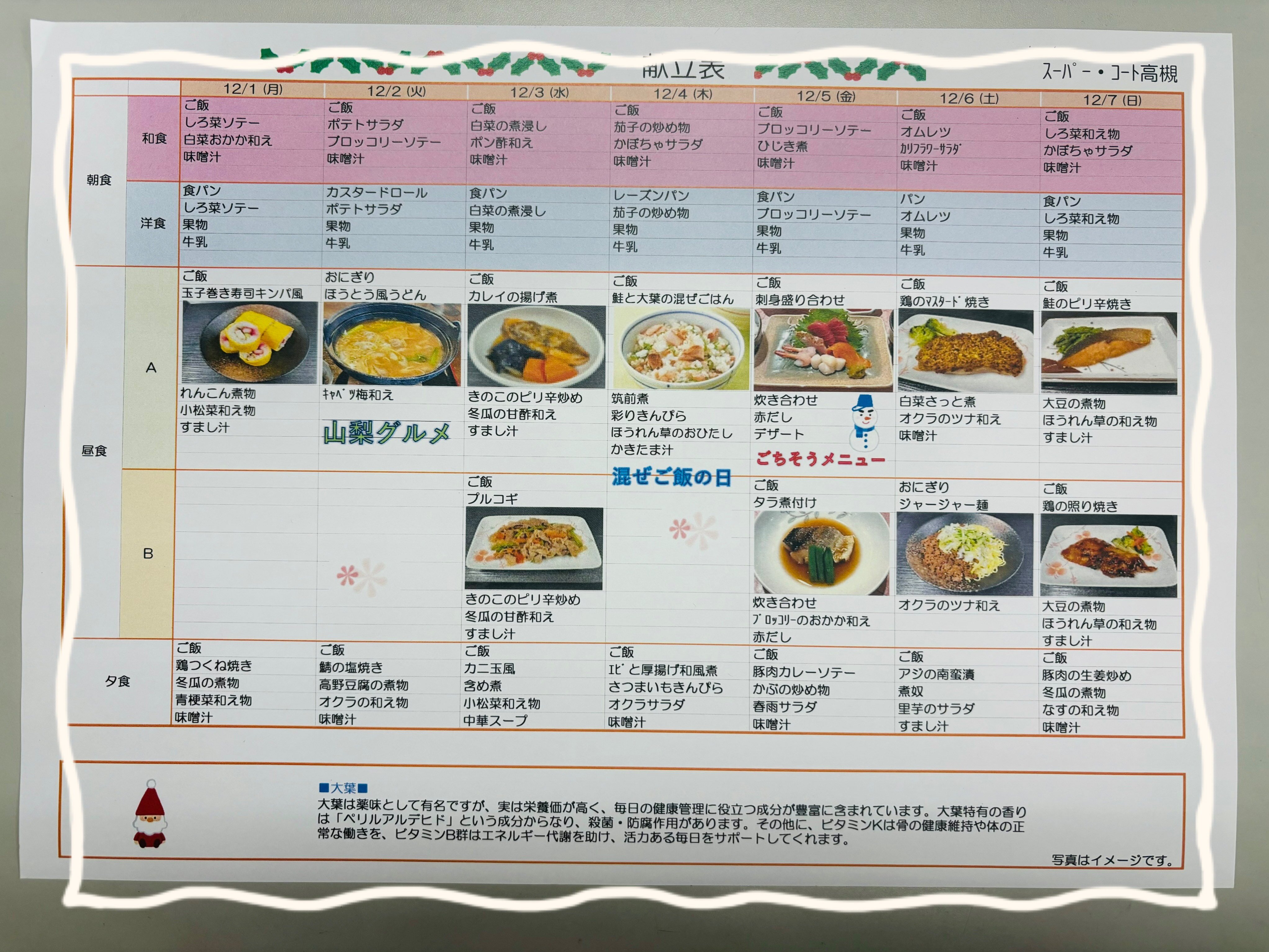 今回は12/1(月)~12/14(日)の献立をご紹介したいと思います(^O^)