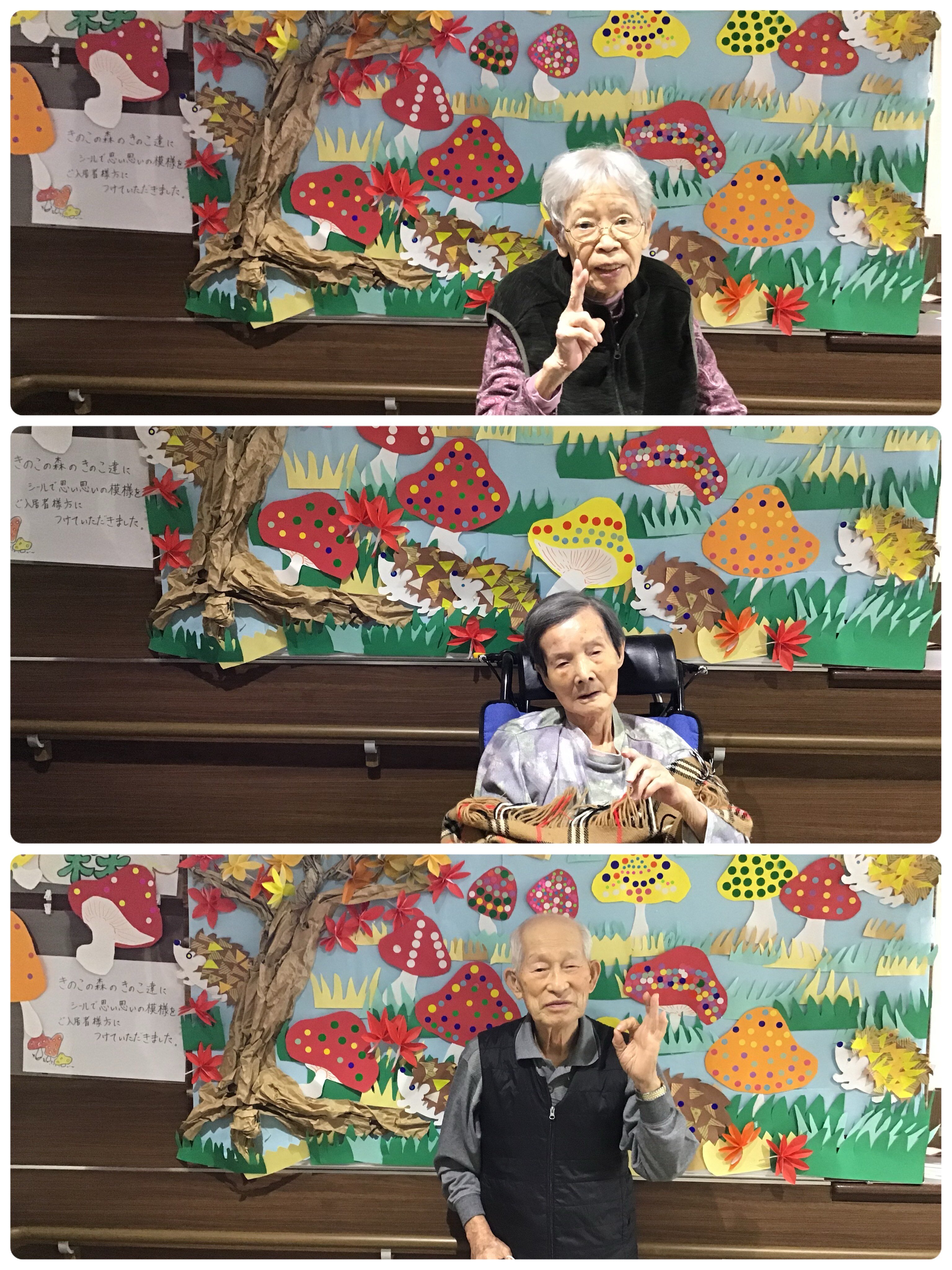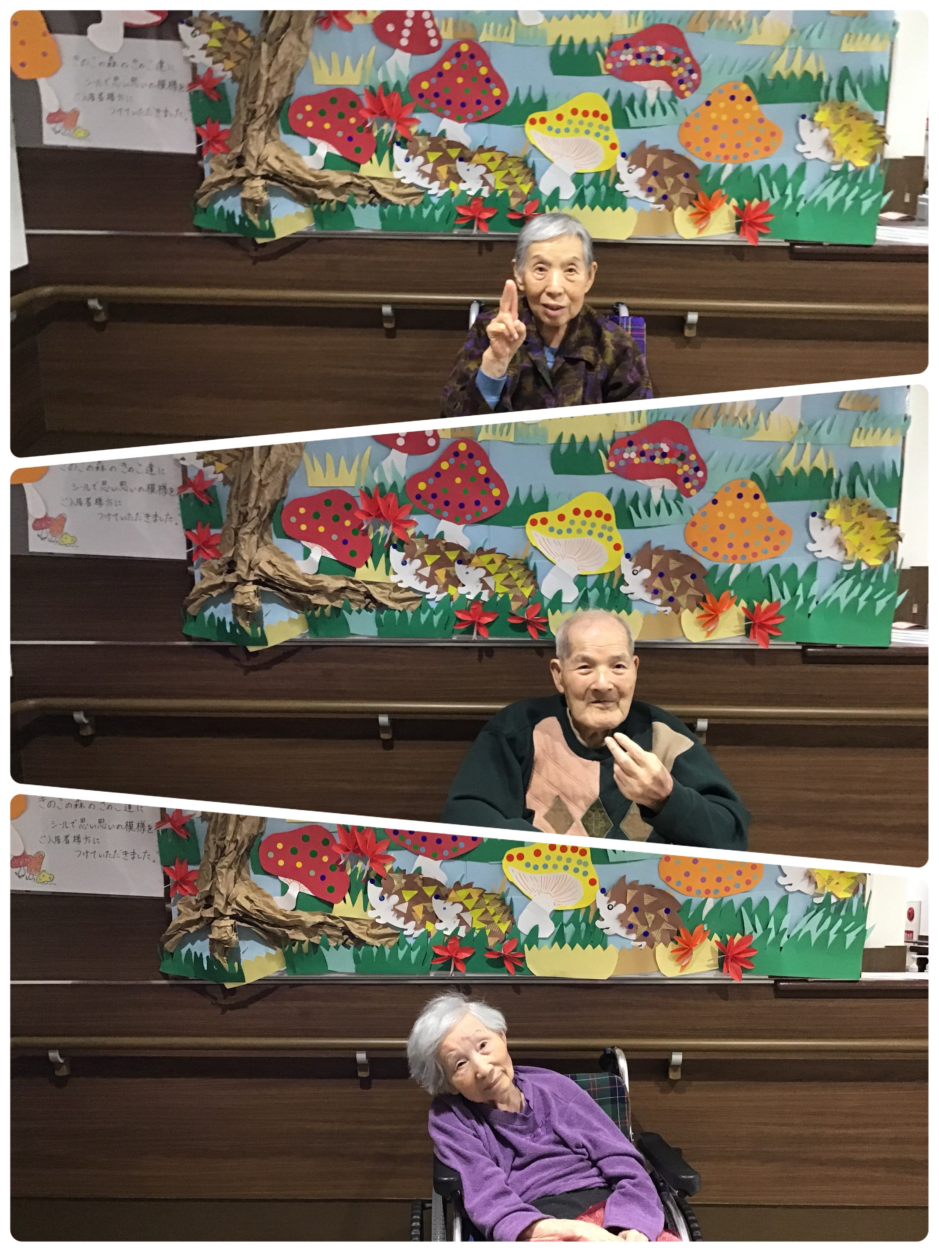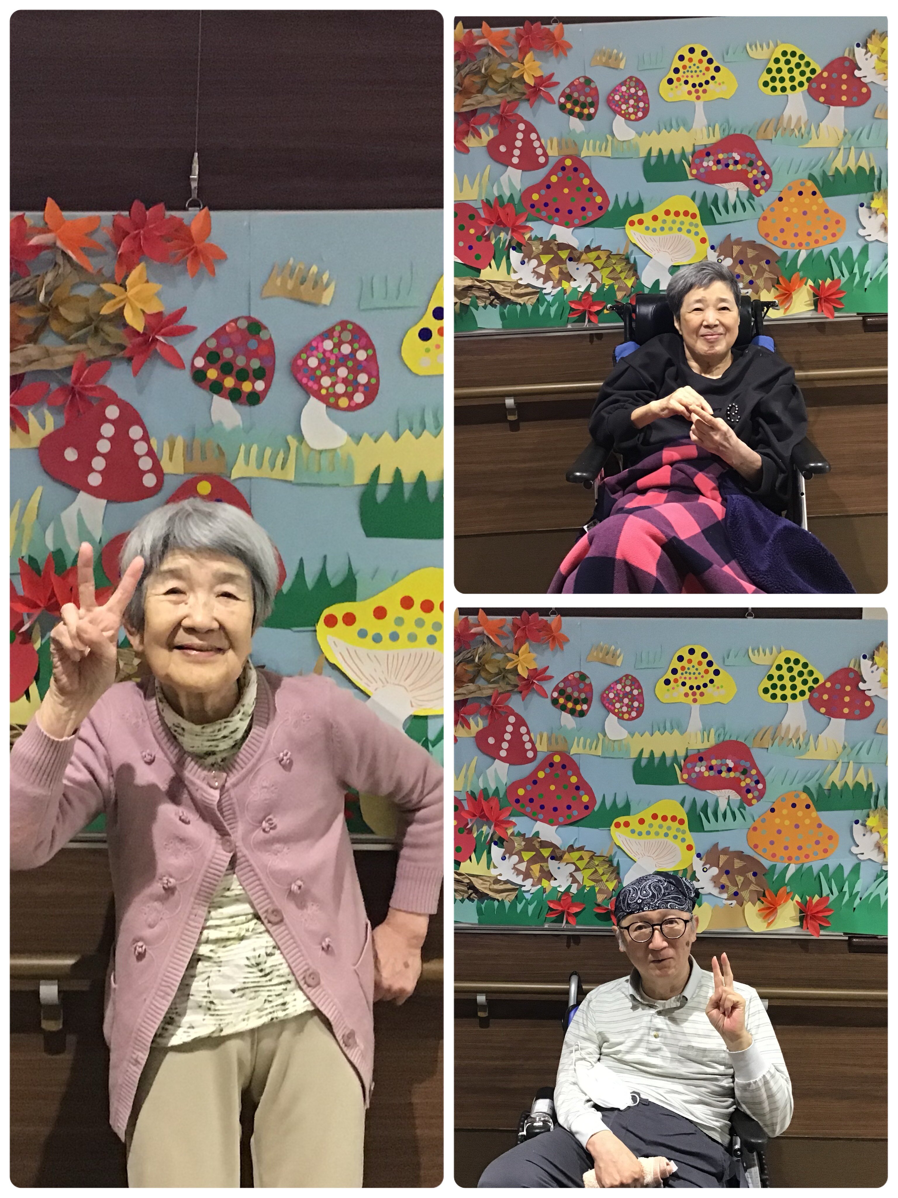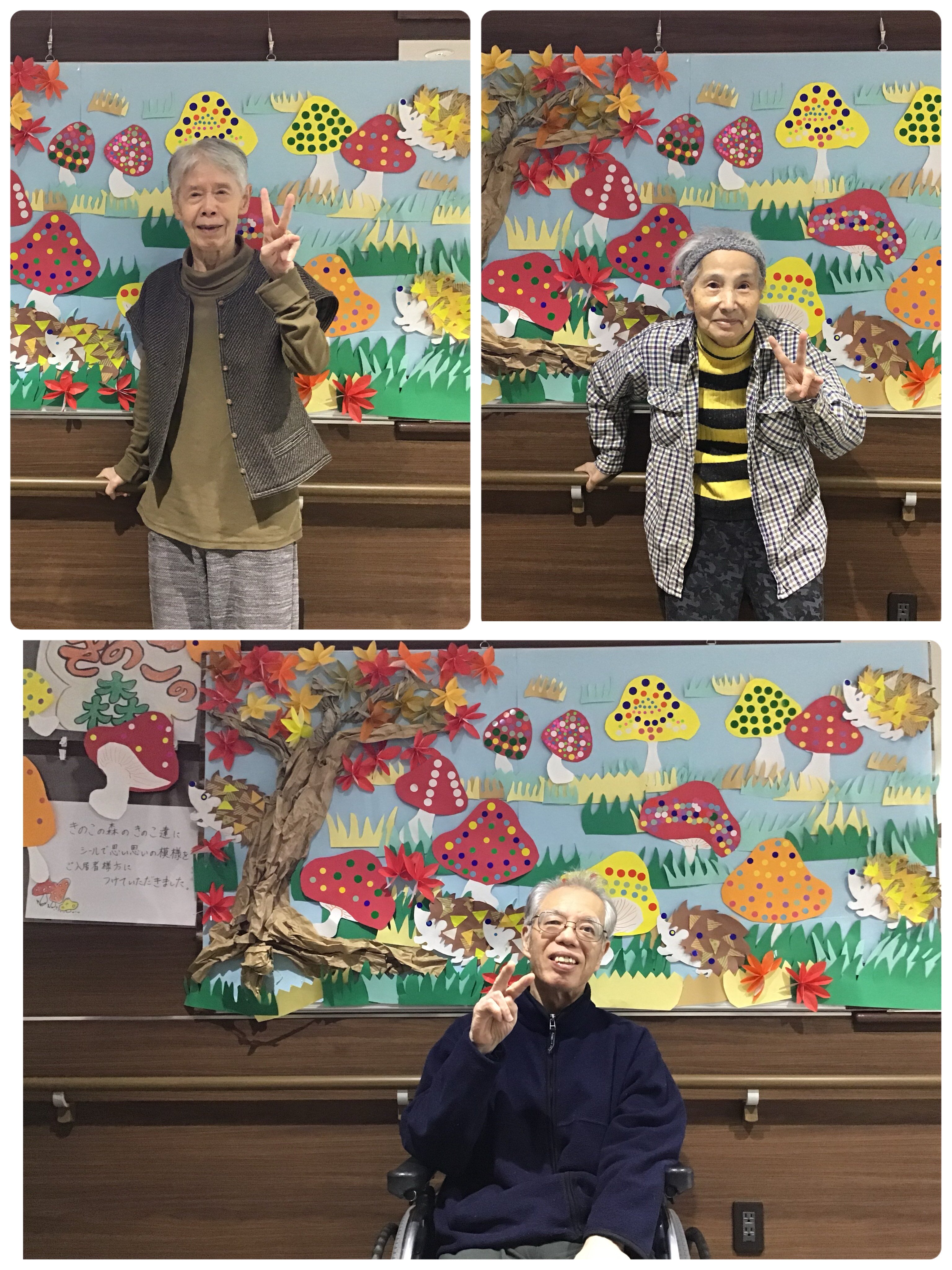 11月にご入居者の皆様が制作した「きのこの森」の前で写真撮影をいたしました(^O^)