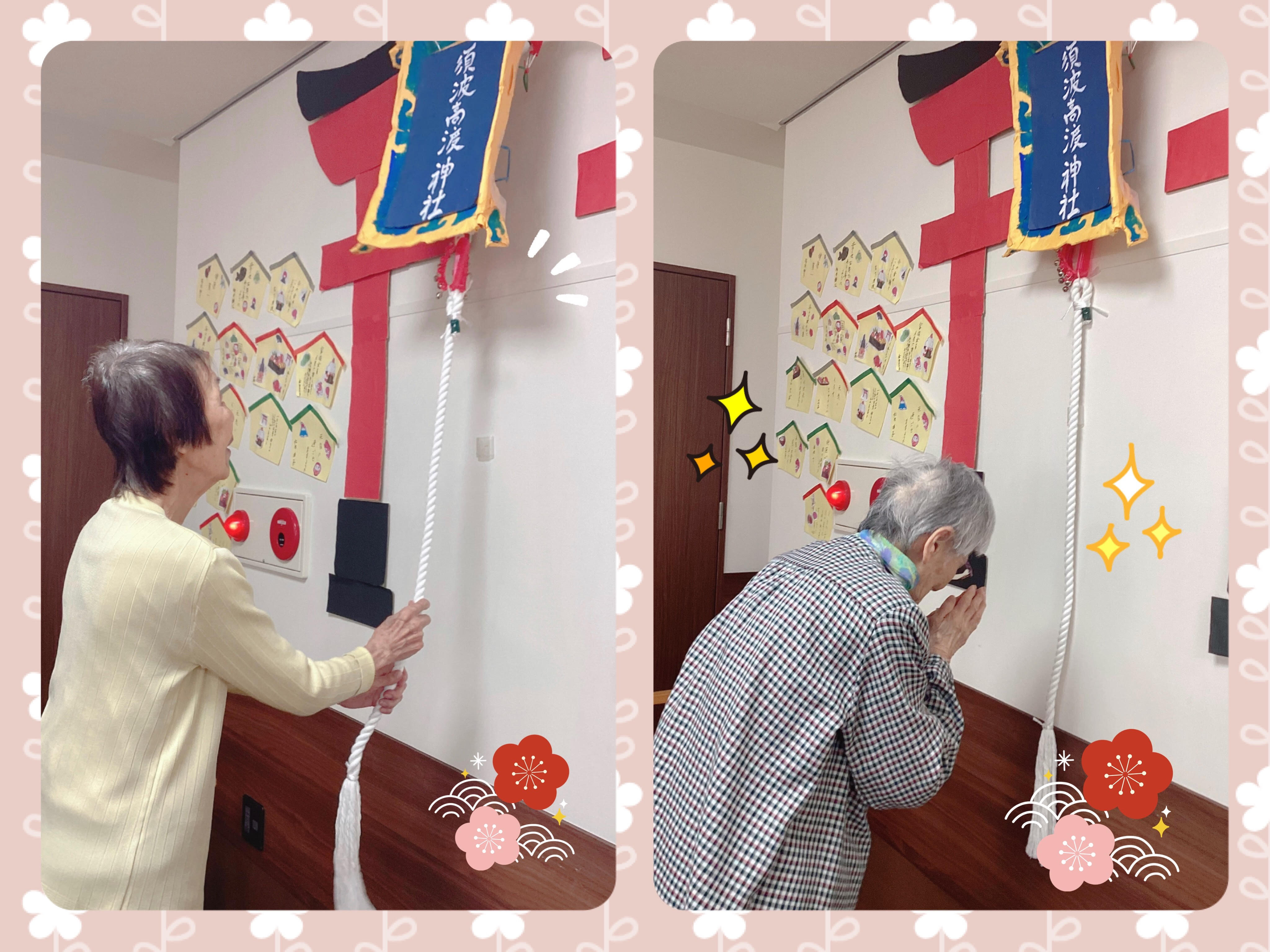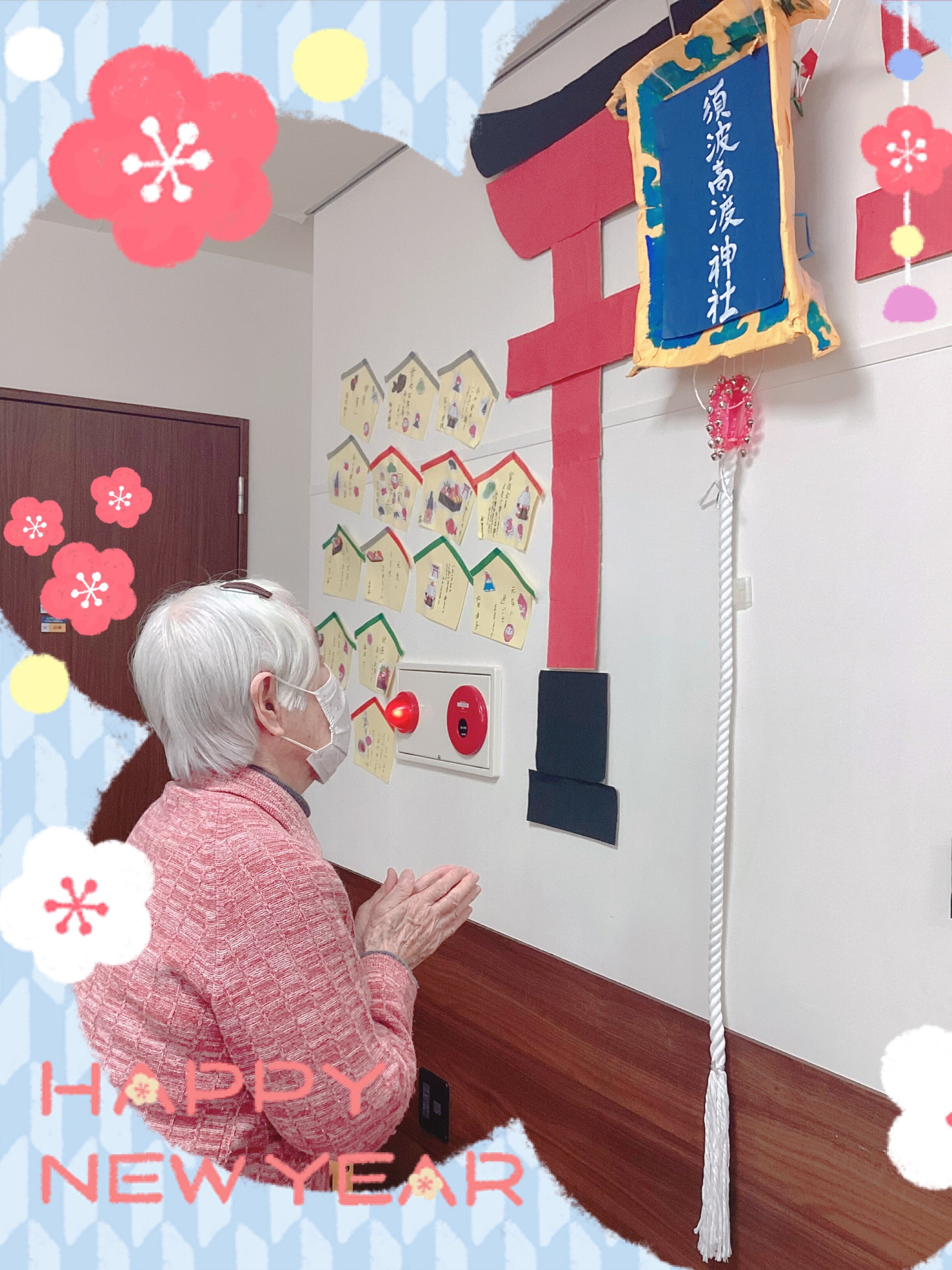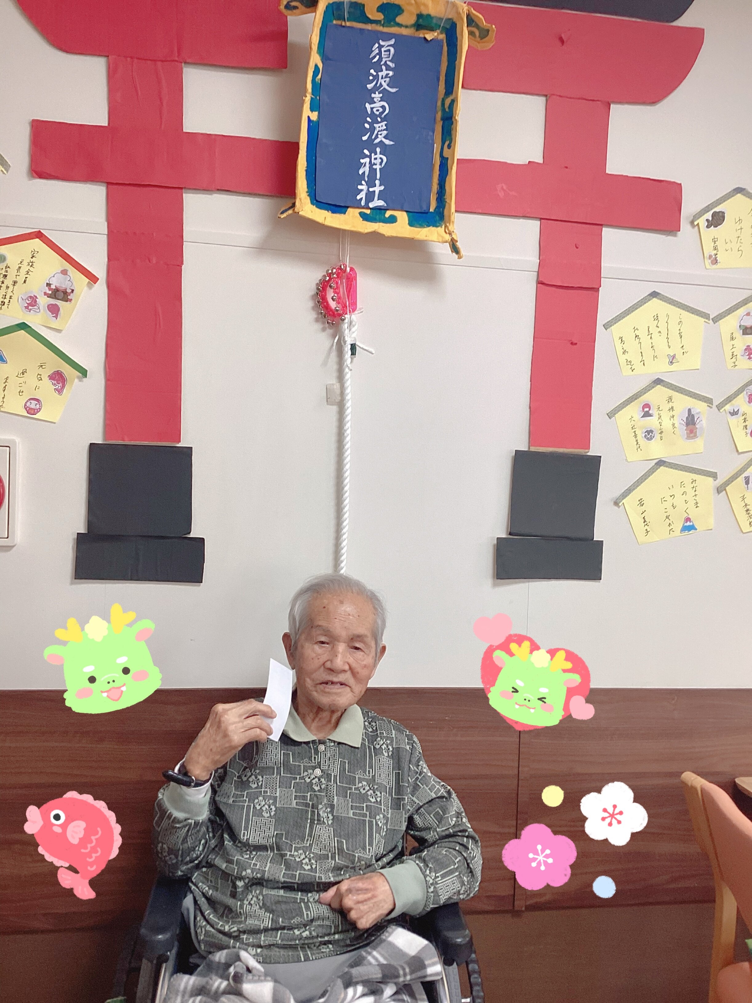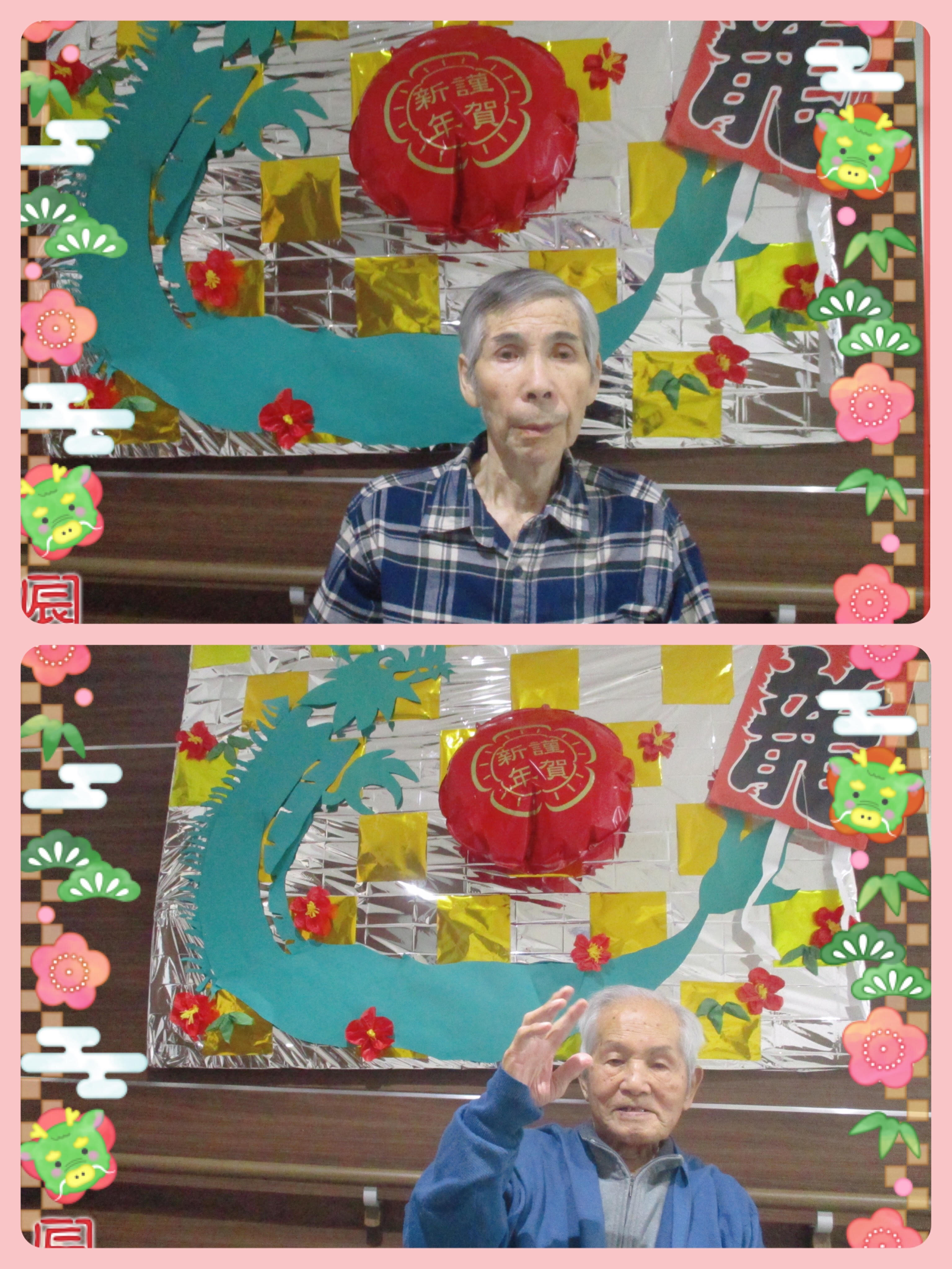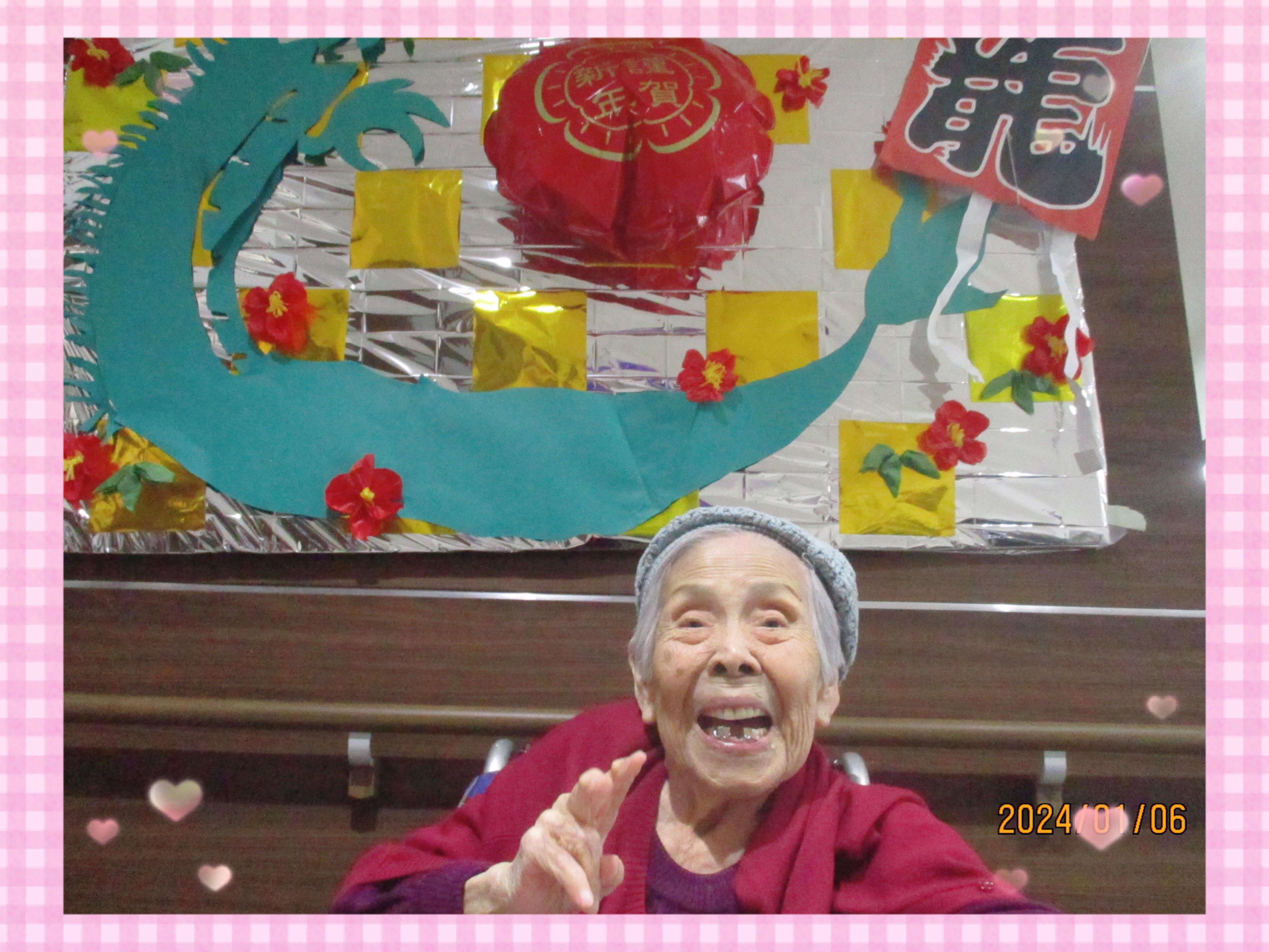 本日は1月の壁面と、壁面の前で撮ったご入居者のみなさまの写真をいくつかお届けします♬