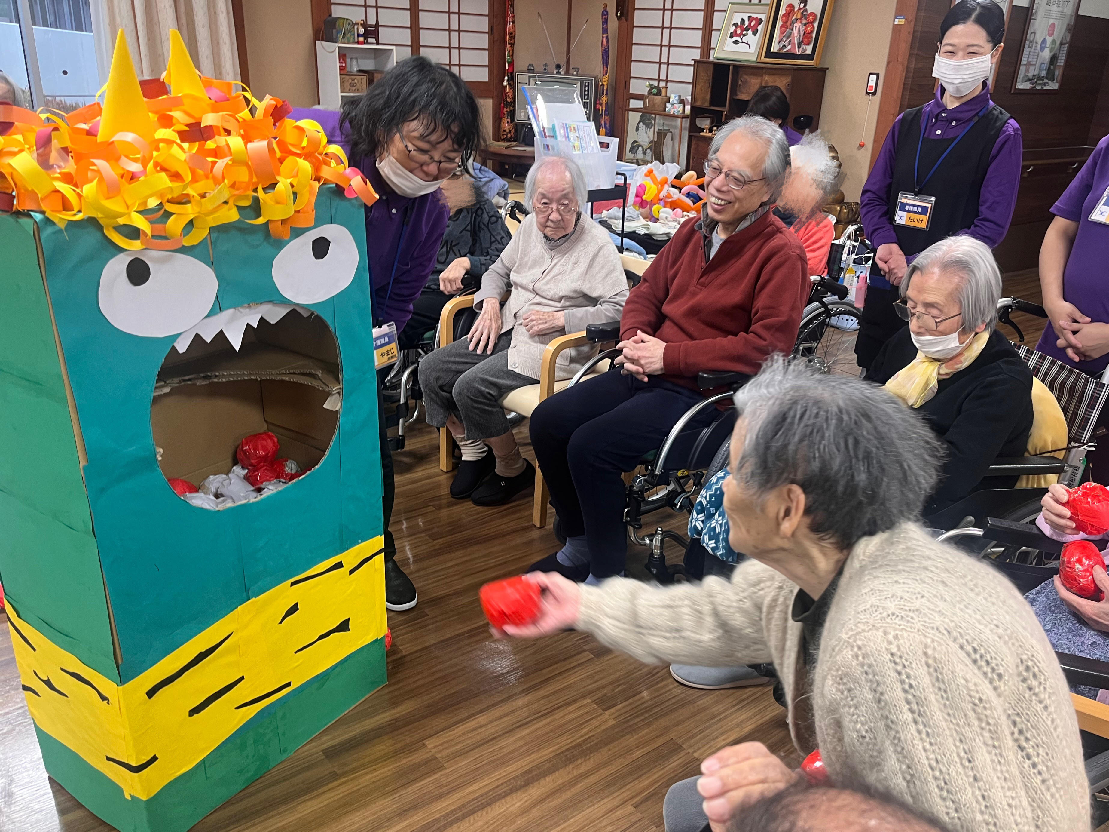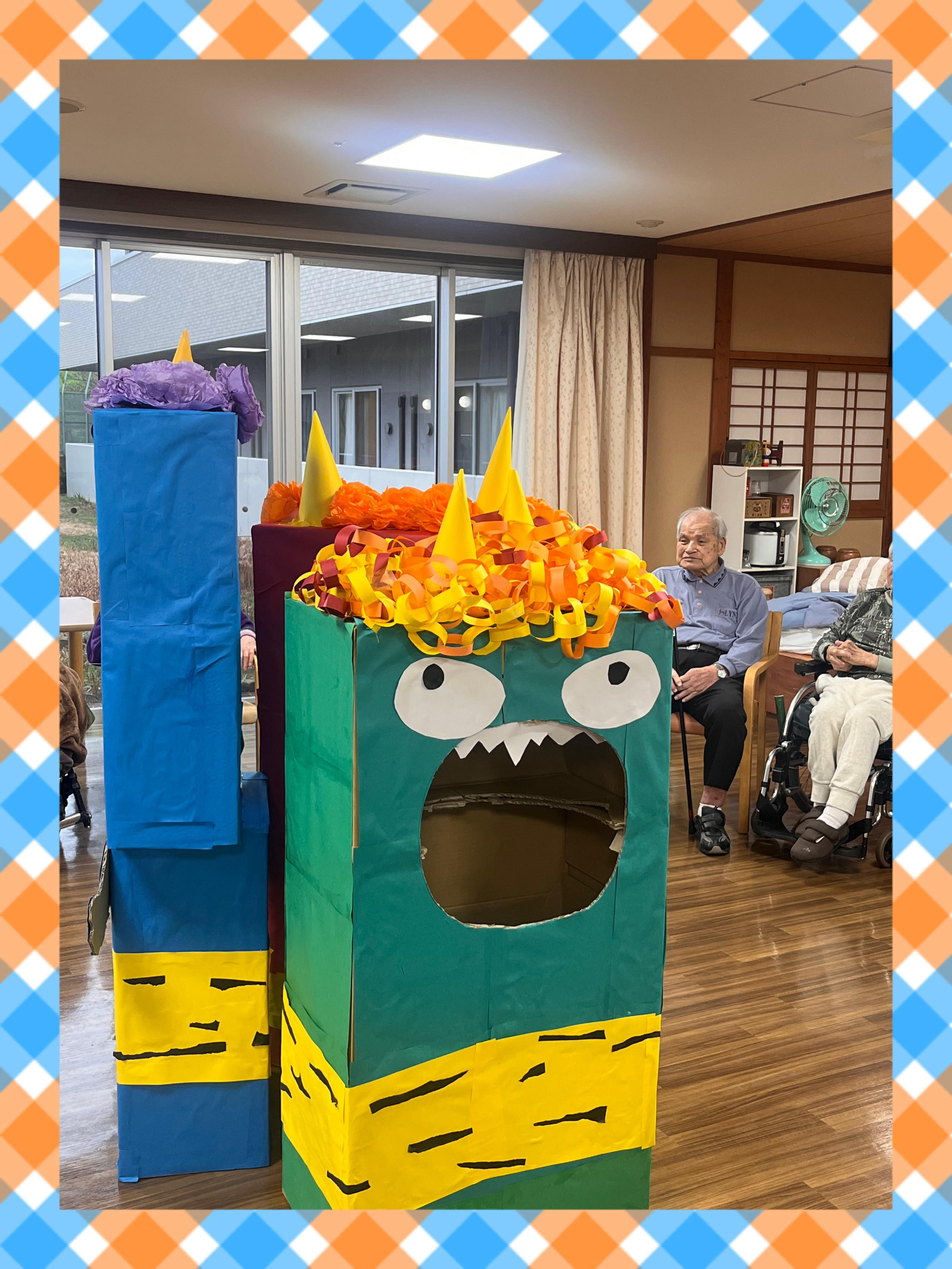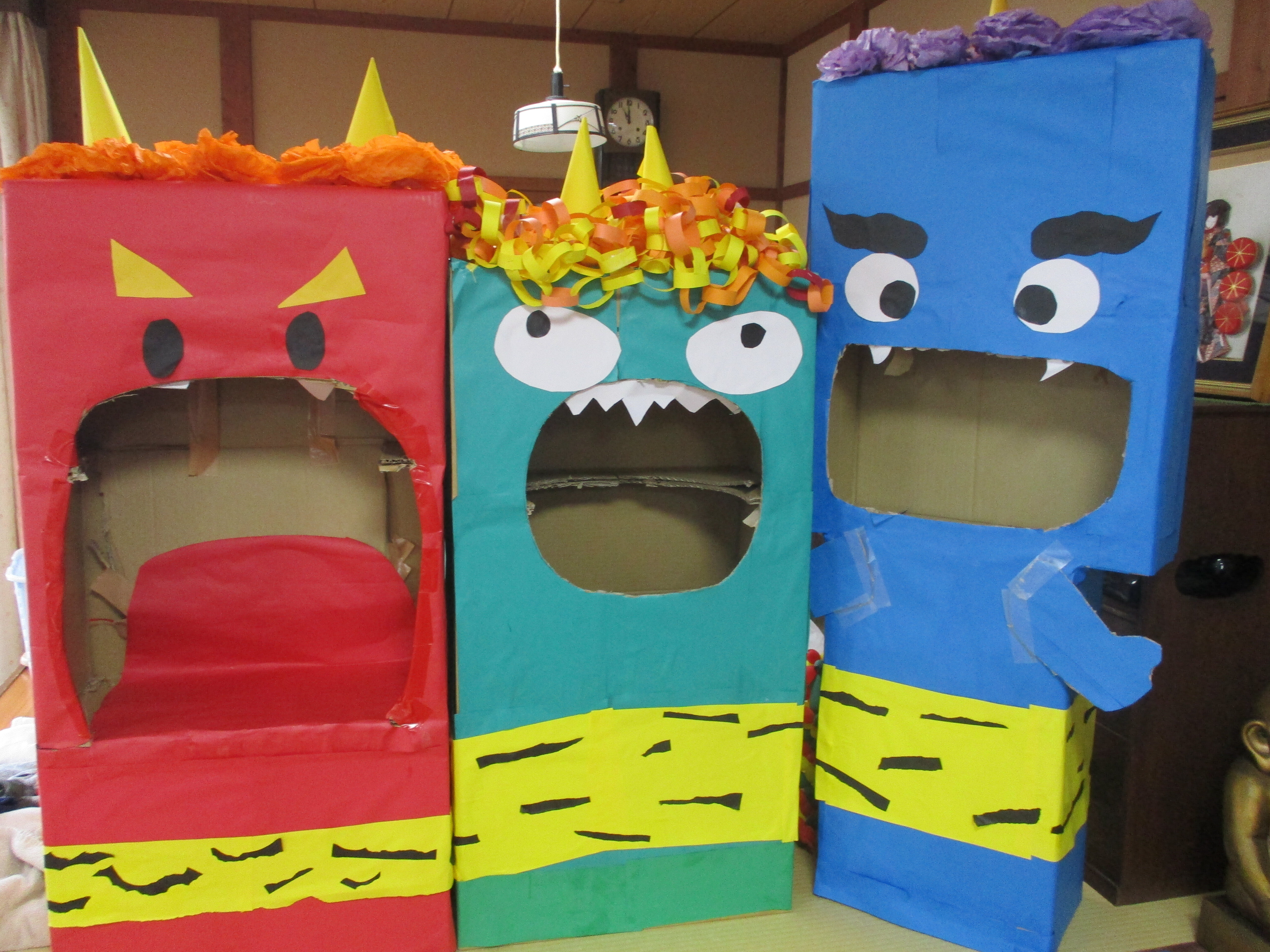 今年は職員が鬼に扮する豆まきではなく段ボールで作った赤鬼・緑鬼・青鬼の鬼退治を行なっていただきました!!