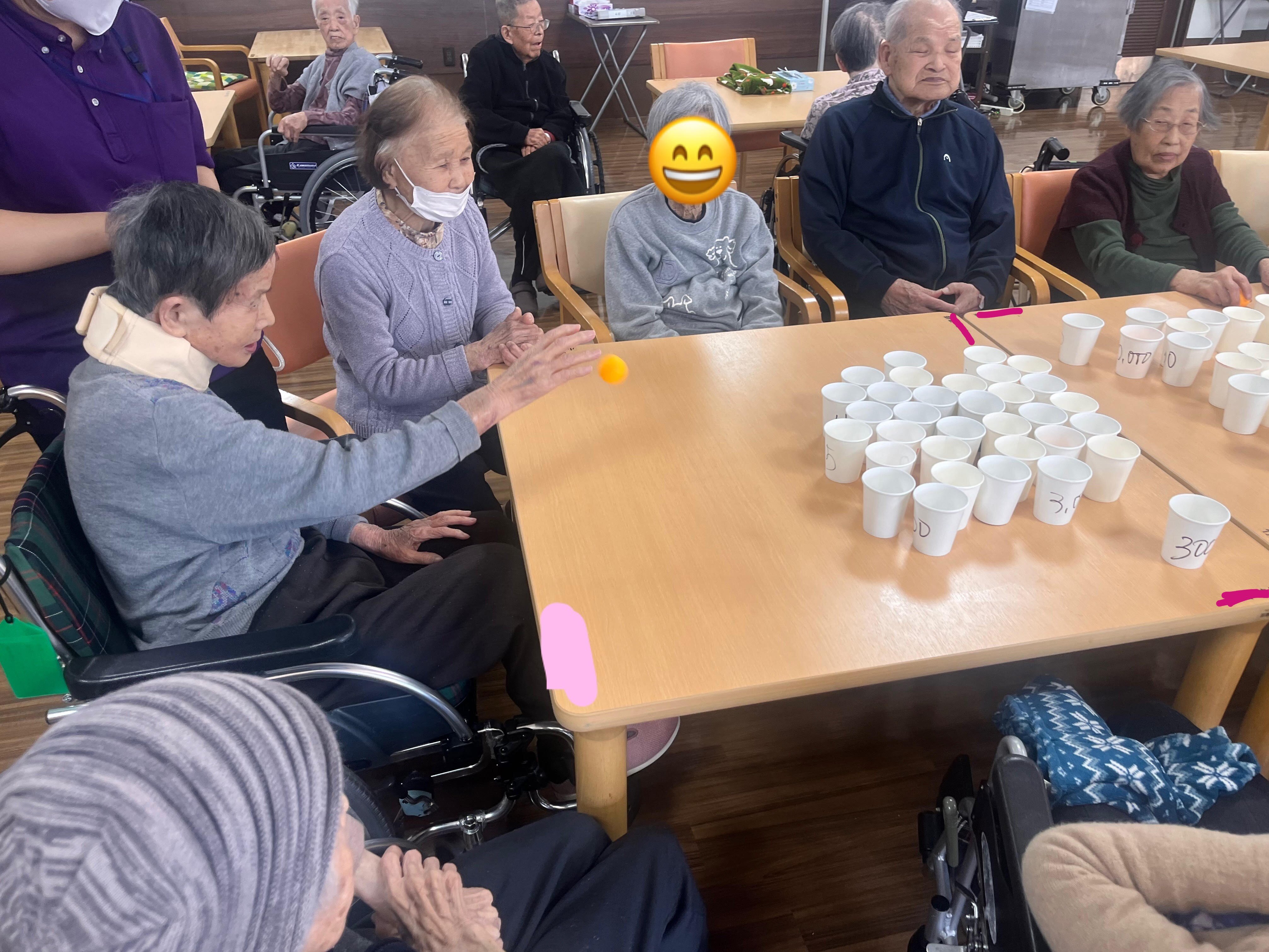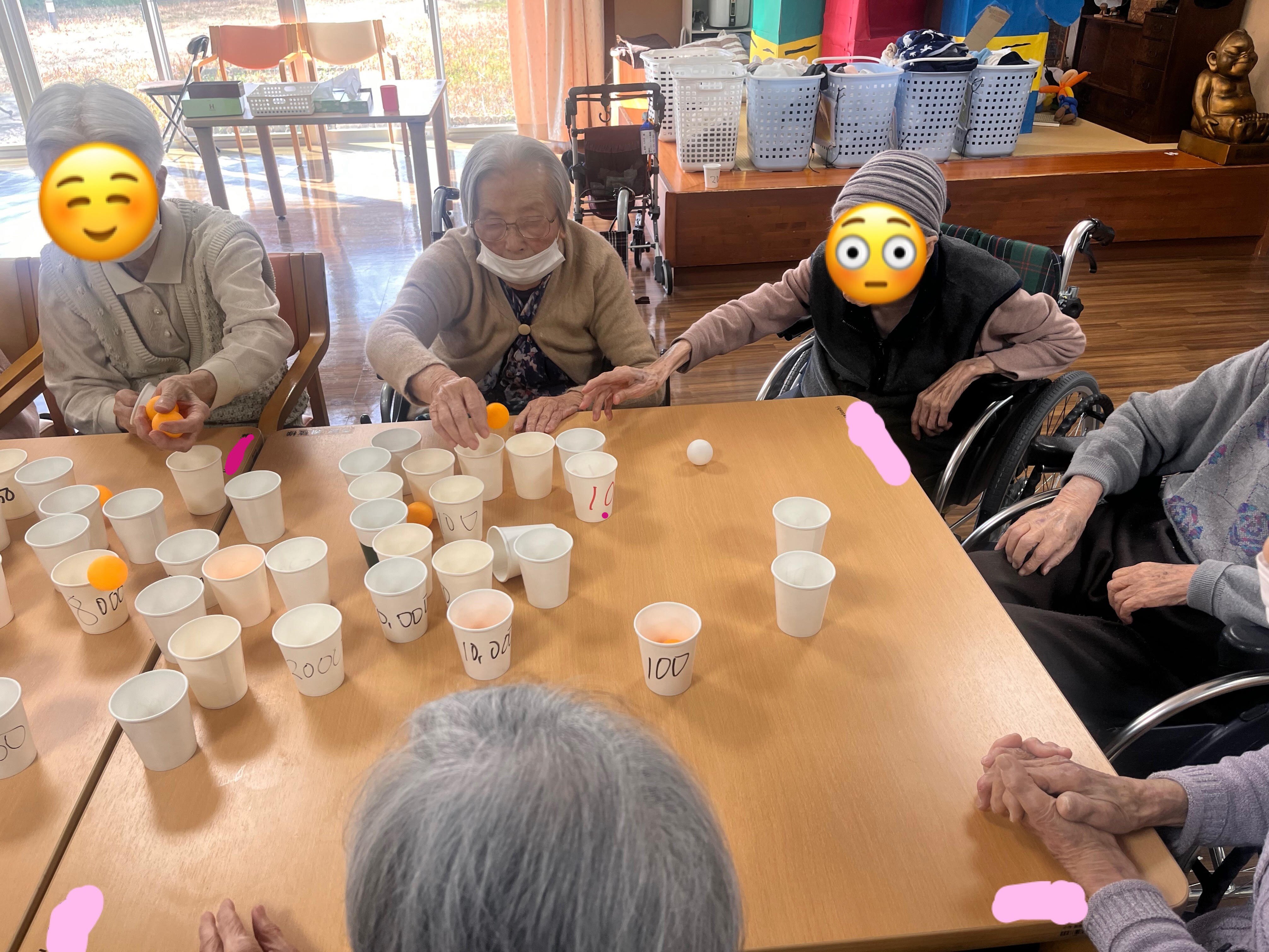 点数の書いた紙コップにピンポン玉をワンバウンドさせて入れるゲームです☆彡