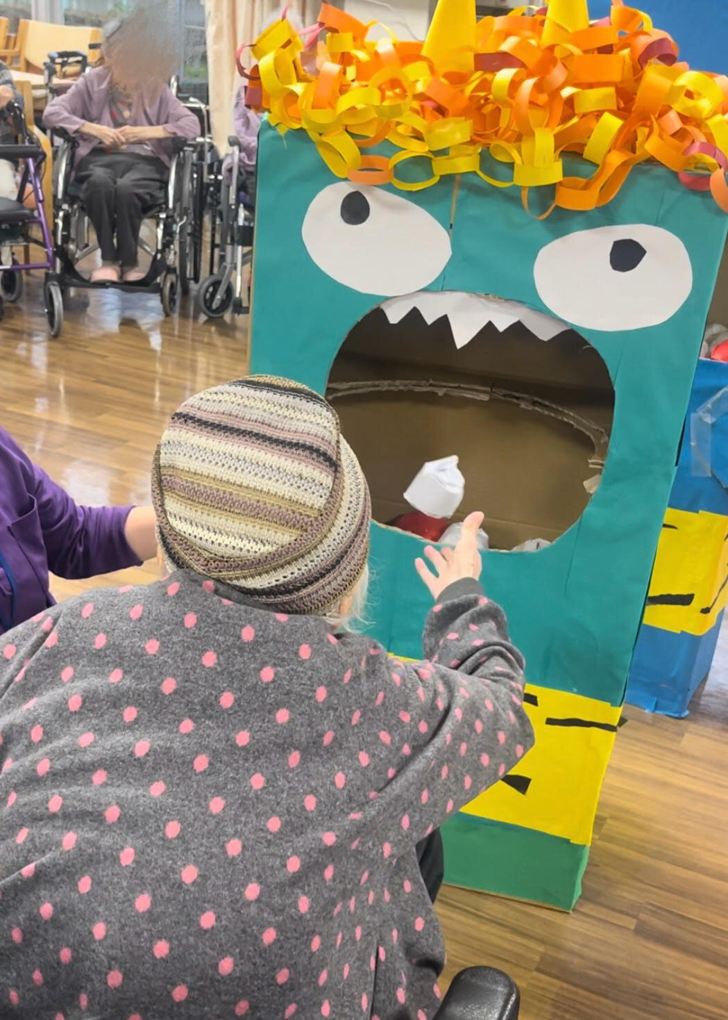 意外と口に紙玉を入れるのが難しくて周りのご入居者も「頑張れ~!」や入らないと「あー!」と思わず声が漏れて