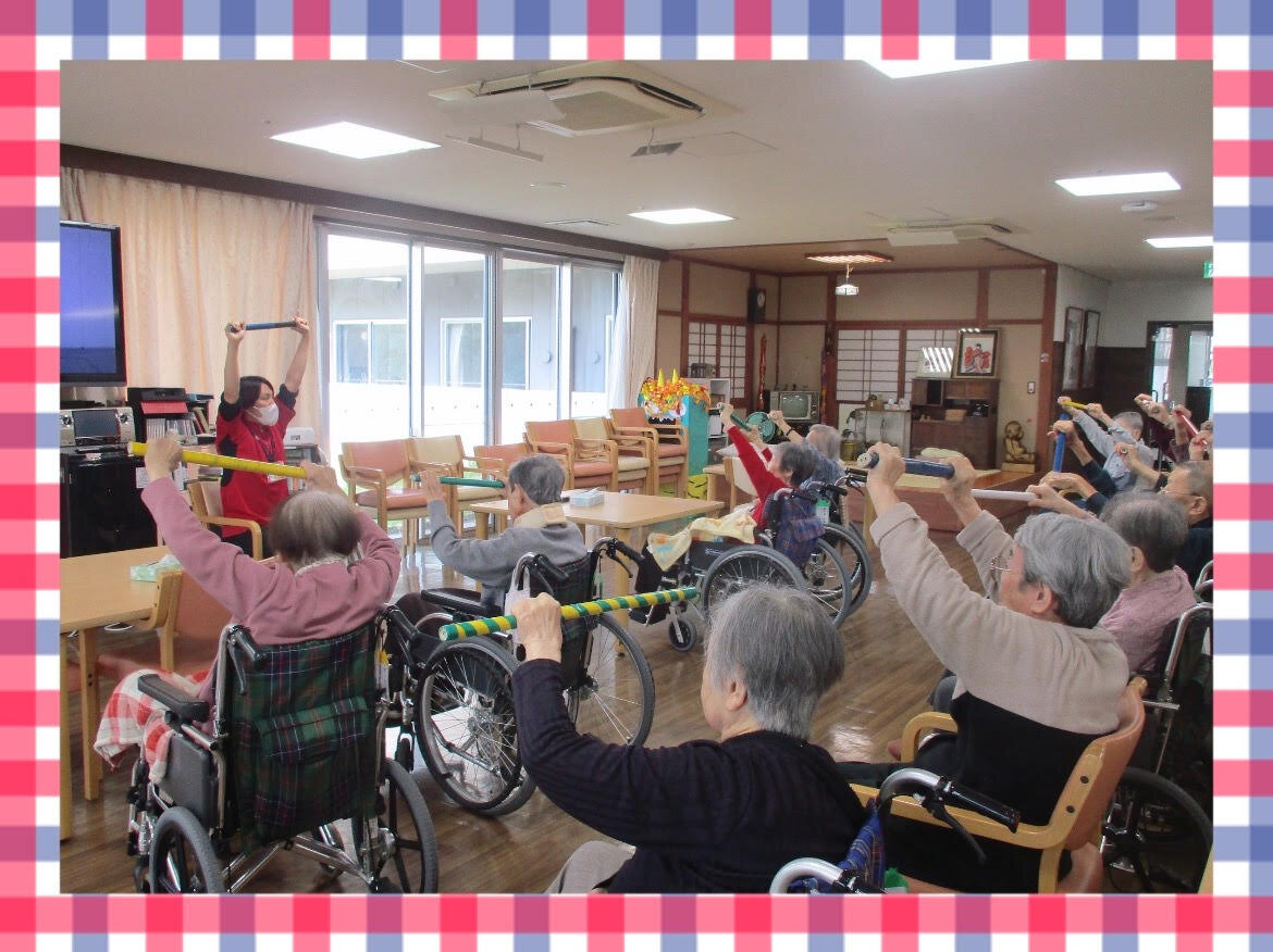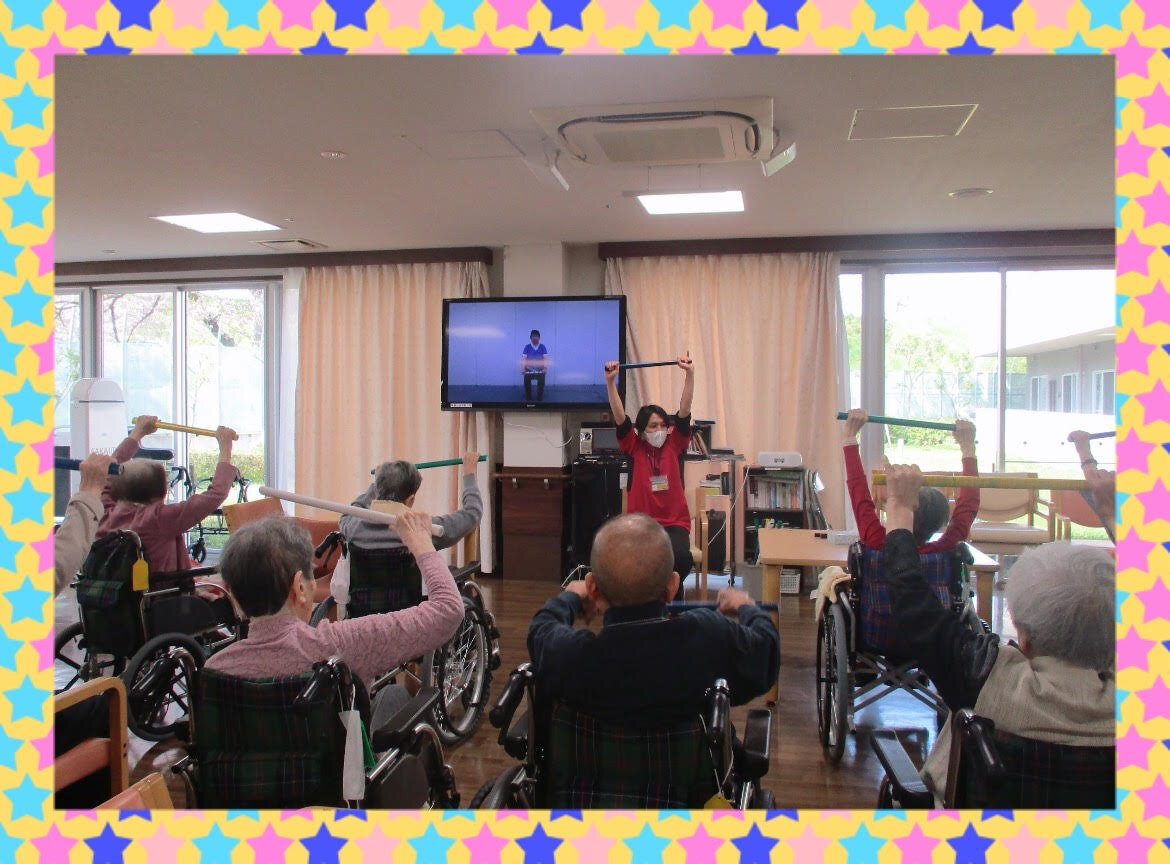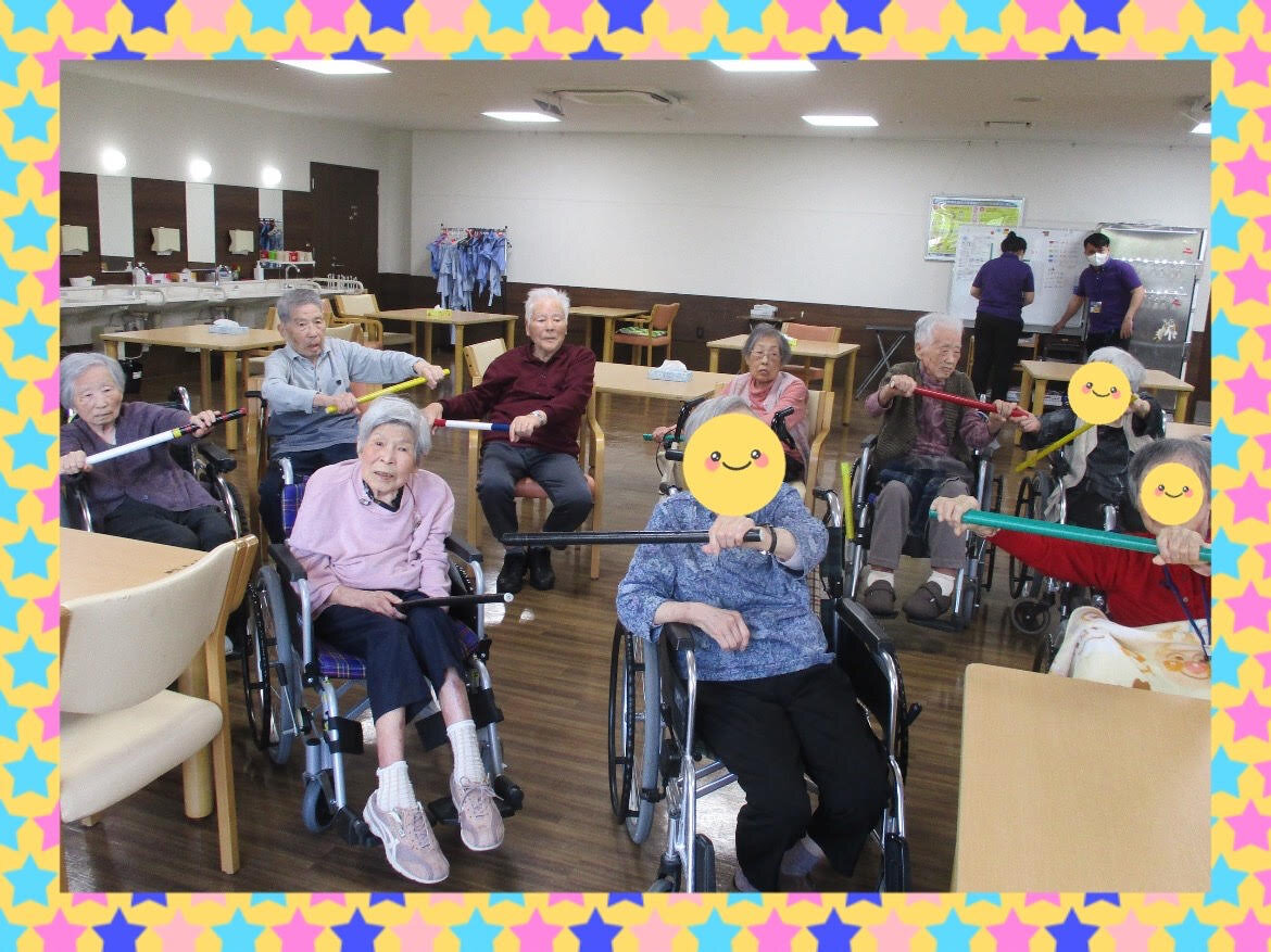 この日は朝から食堂で見守り中のご入居者のみなさまは機能訓練士とともに棒体操!!