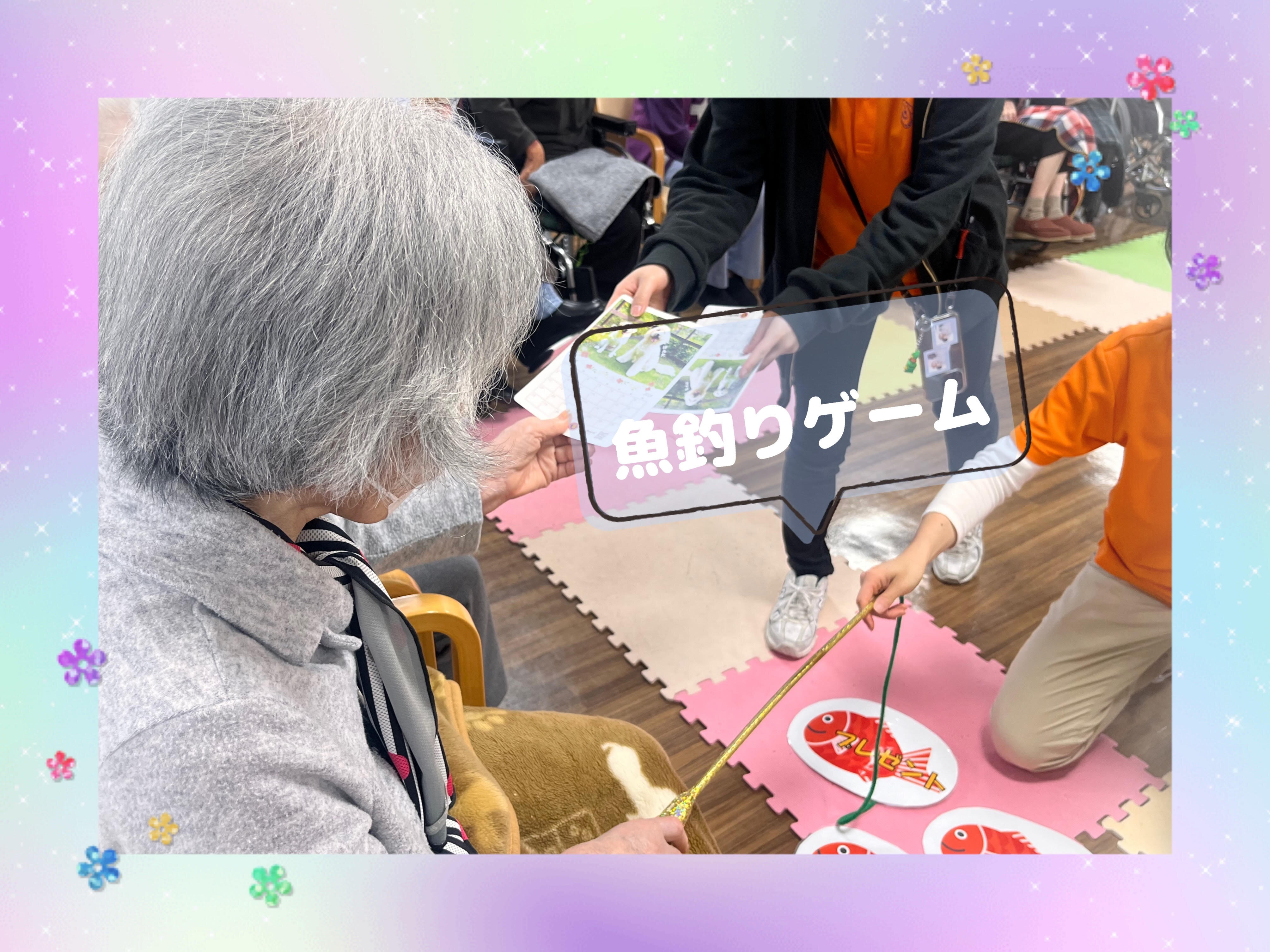 ご入居者が釣竿をもって「おかし」・「だっこ」・「プレゼント」と書かれたおさかなのカードを釣り上げて