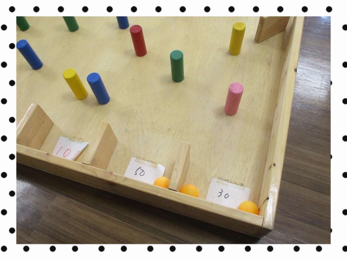 ピンポン玉を投げて入ったところによって30点・50点・100点と得点が入ります!(0点も!(笑))