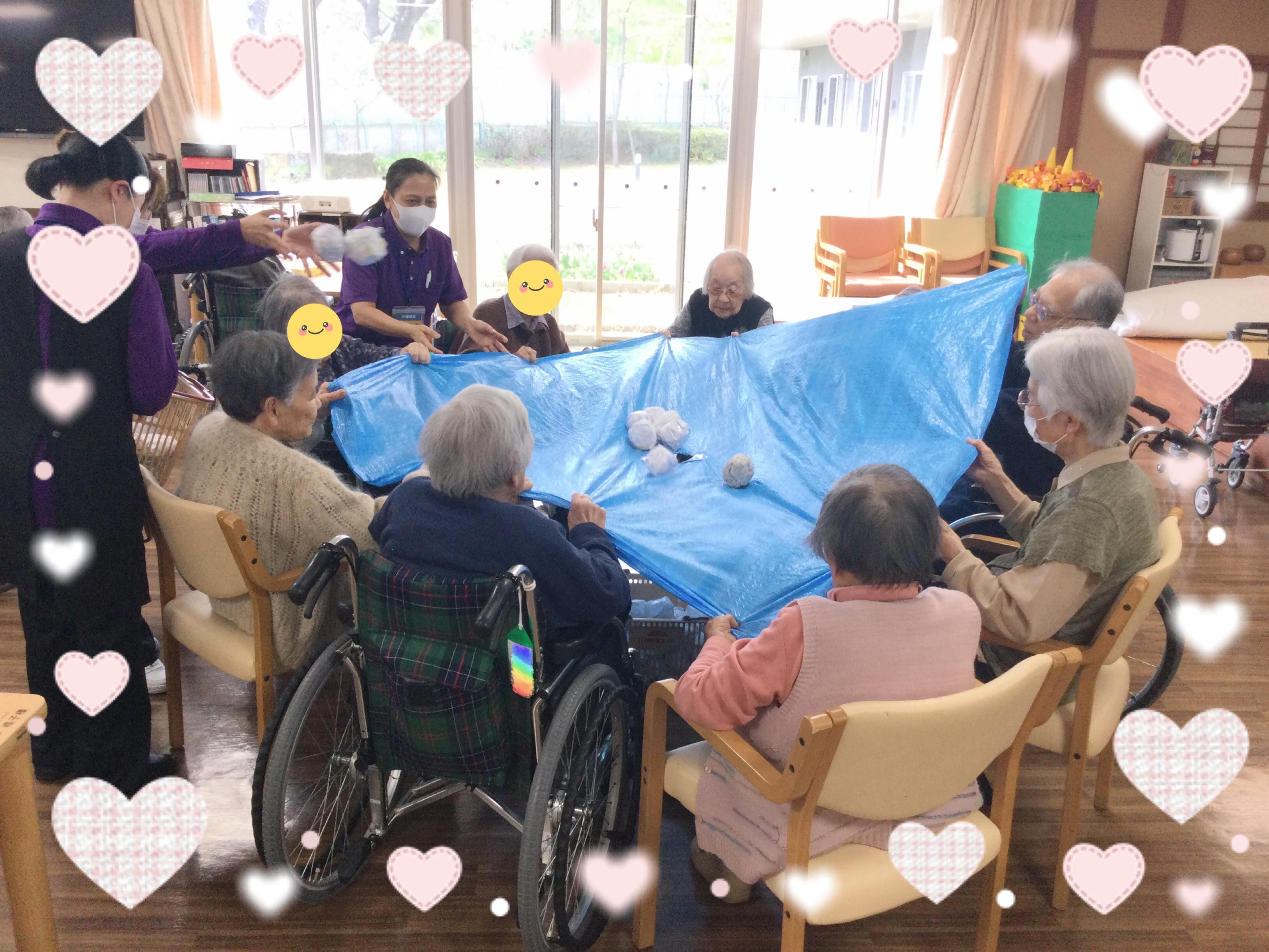真ん中に穴の開いたブルーシートをみんなで持って投げ込まれた紙玉たちをいかに早くその穴に落とせるかのゲームです!