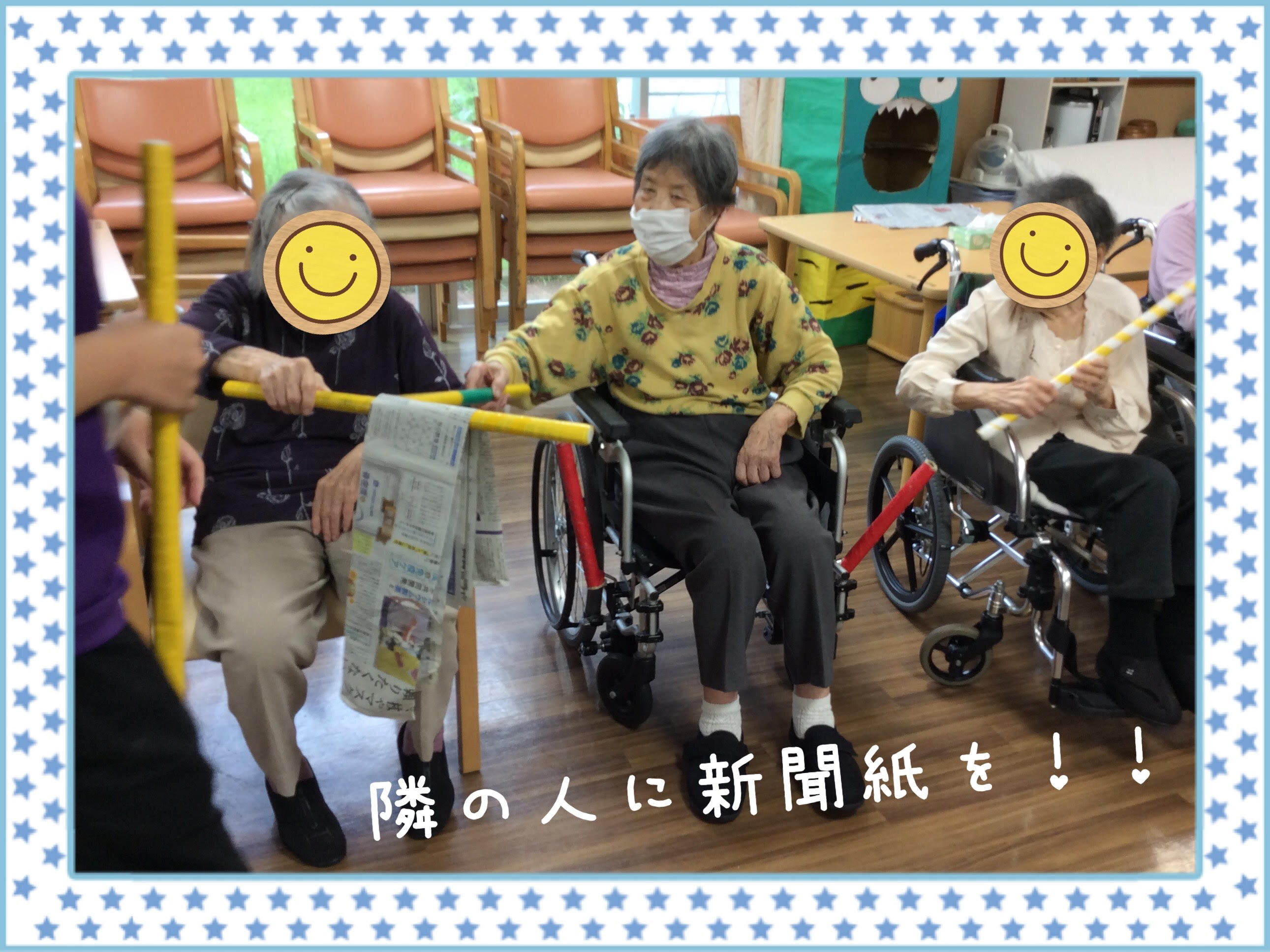 棒を持って手を使わず新聞紙をとなりの人に繋いでいくゲームです♬