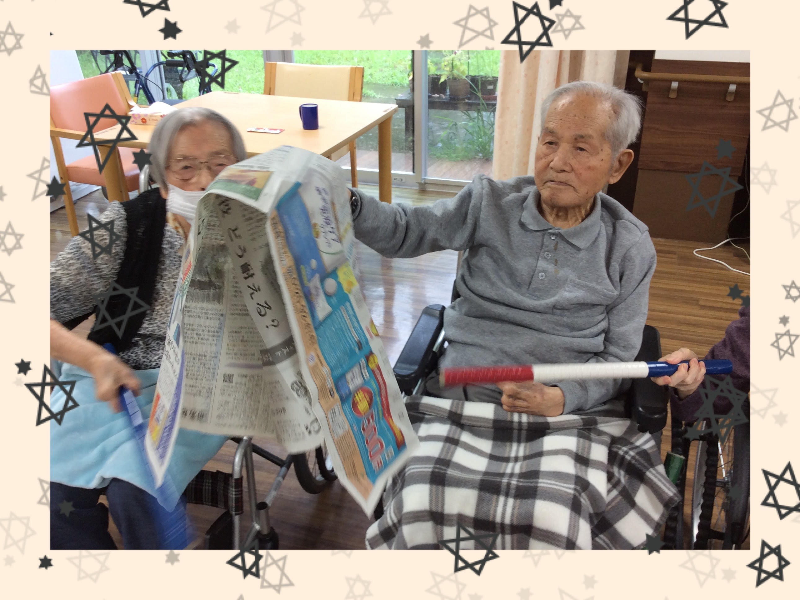 この日は新聞紙でしたが、輪投げの輪っかや紙コップバージョンの日もあります(笑)