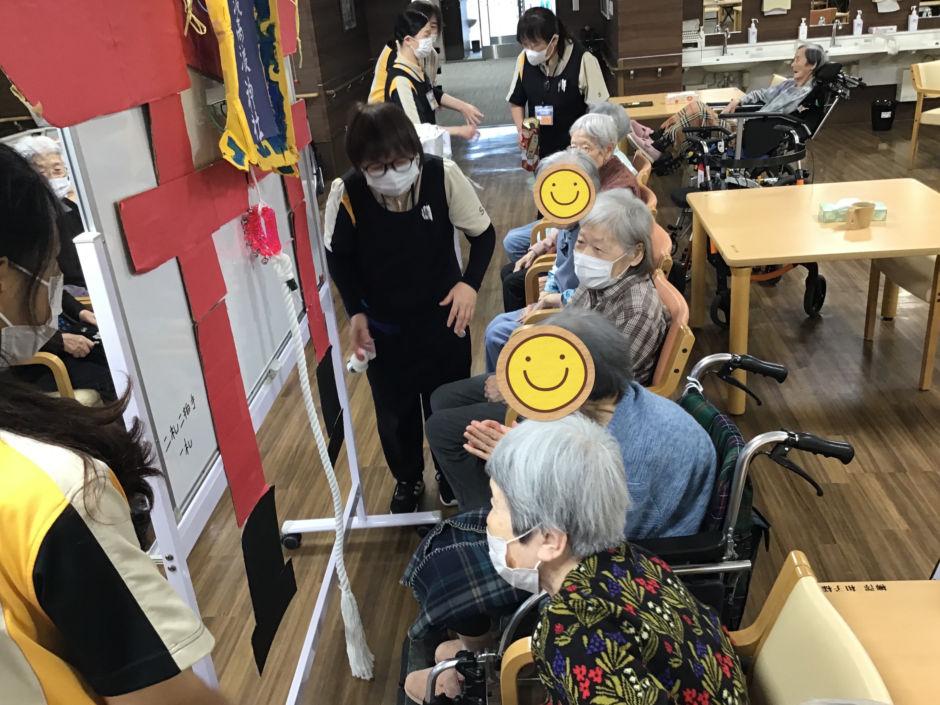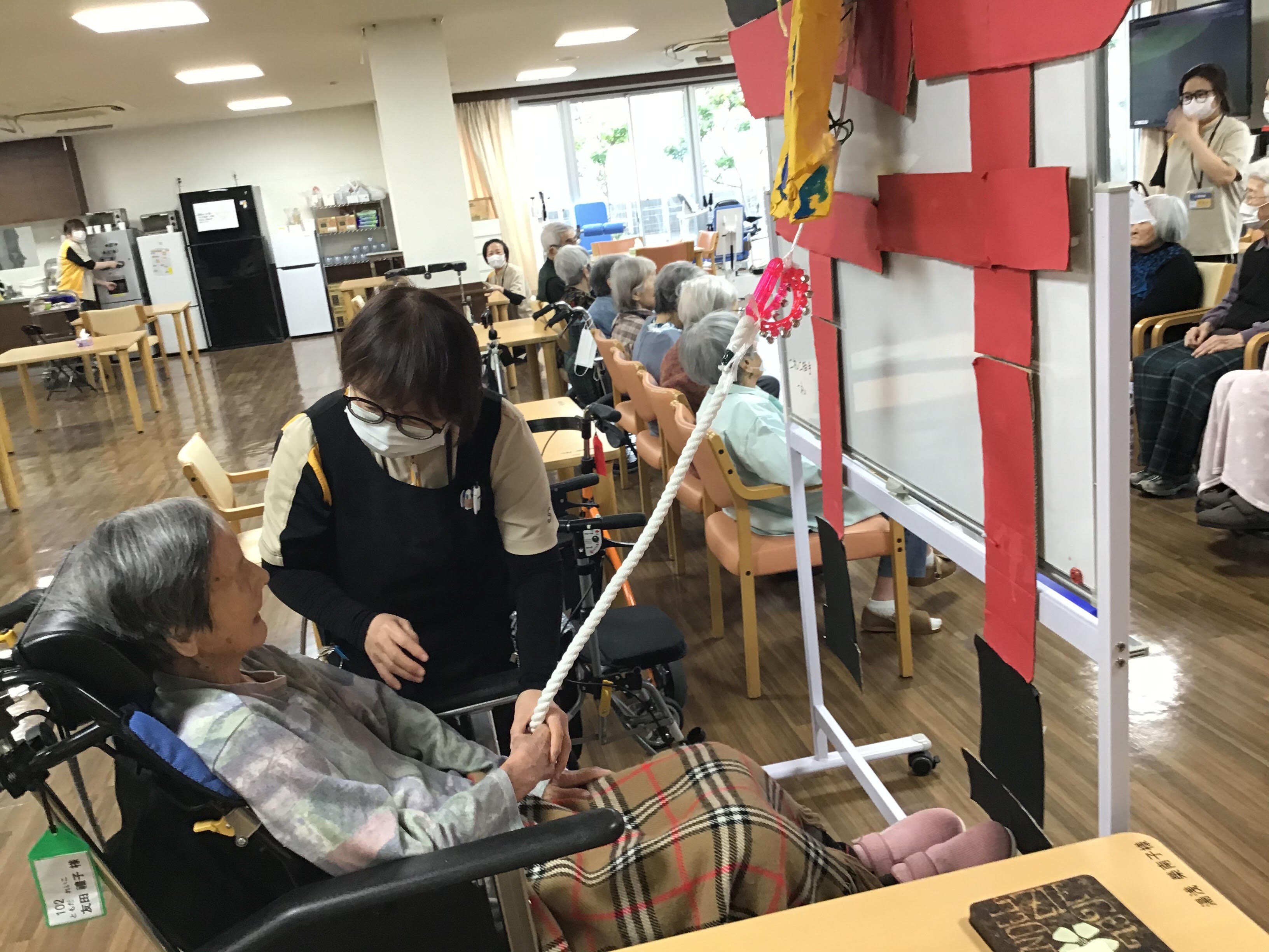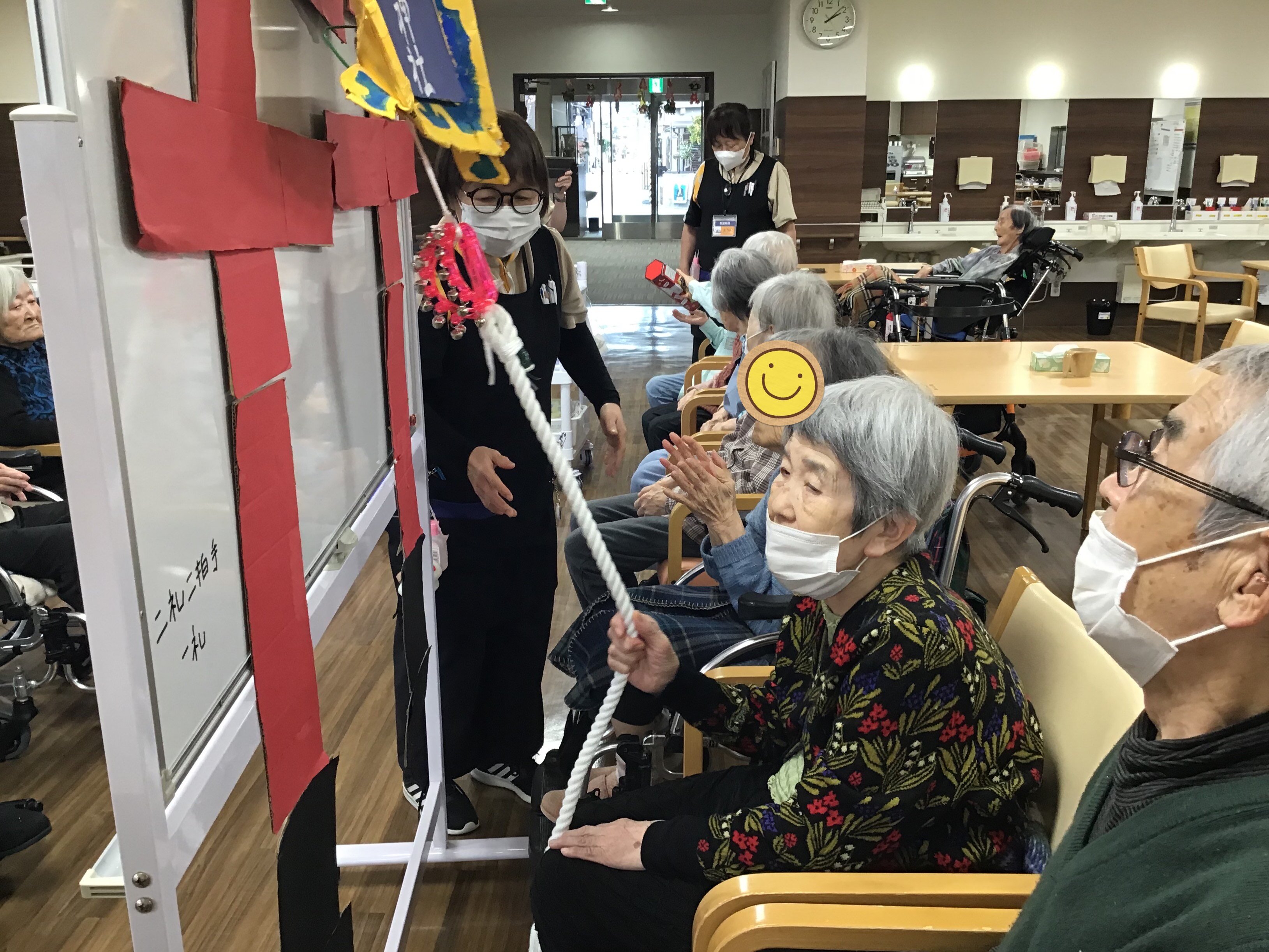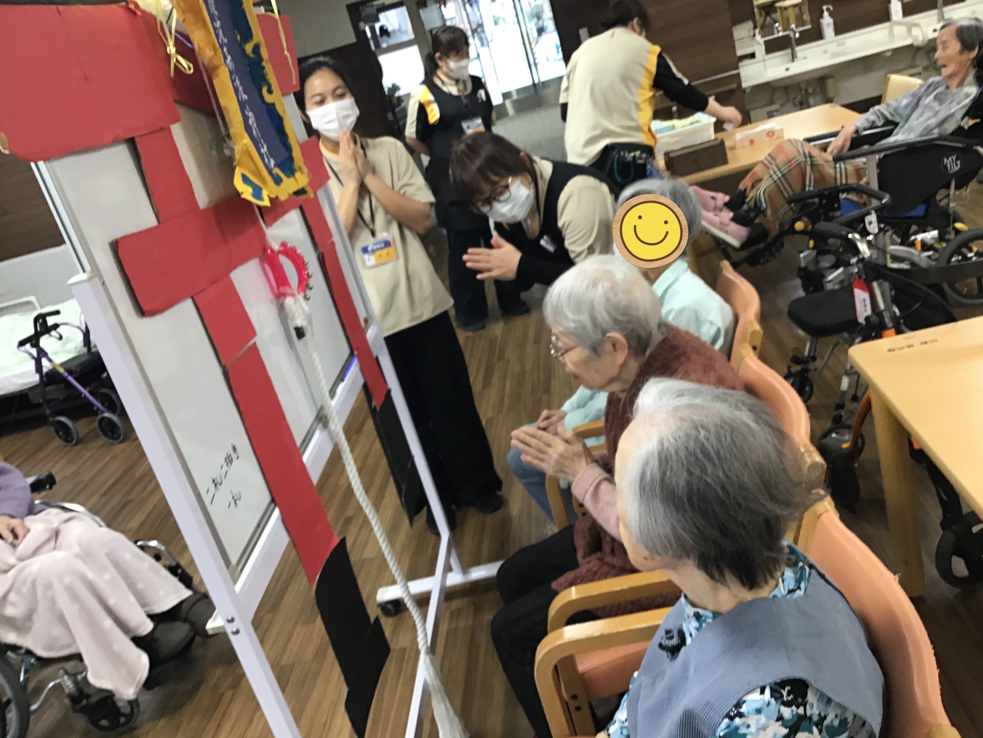 食堂入り口に設置したんですが、元旦のレクは食堂の中に移動して
