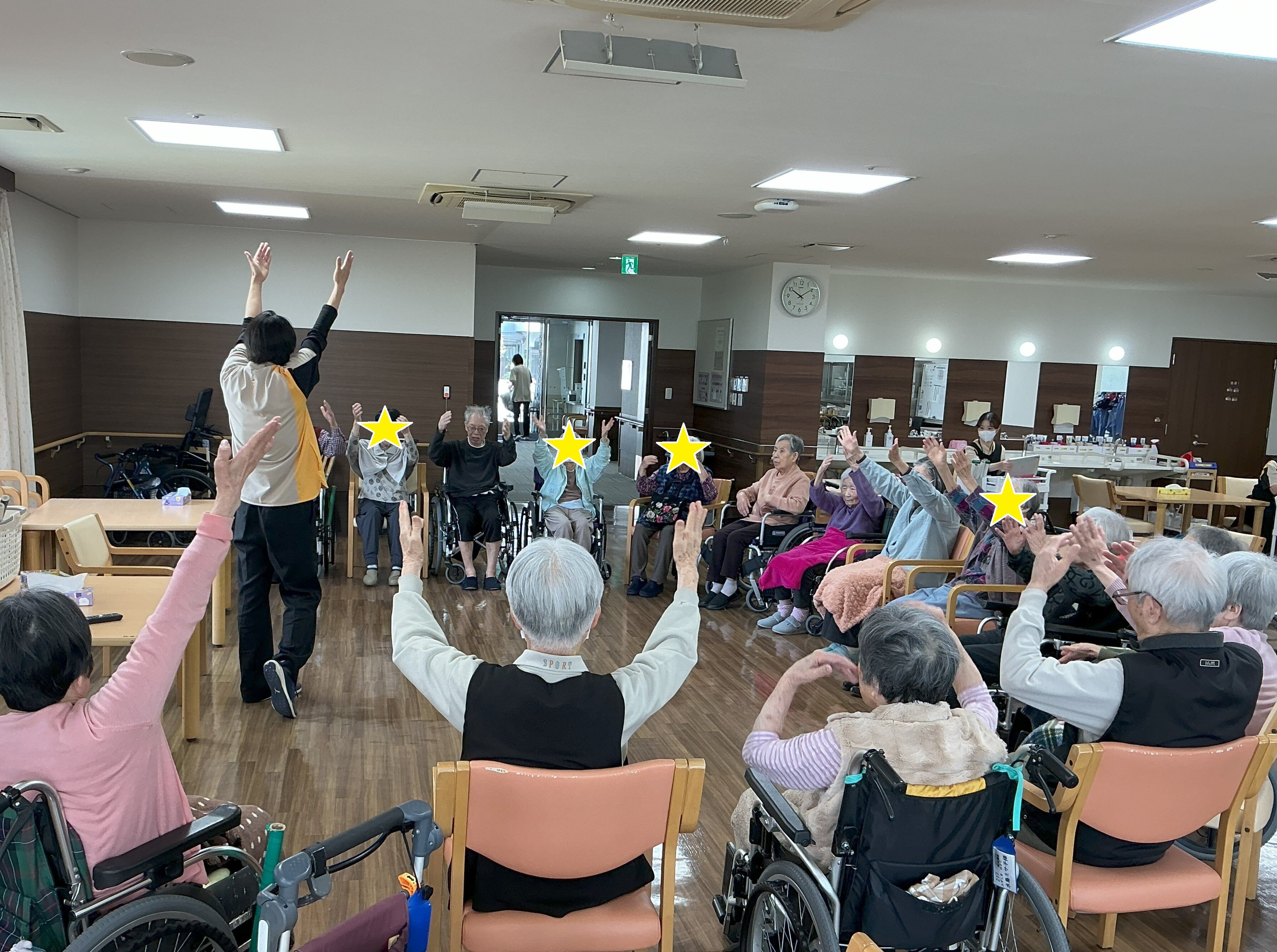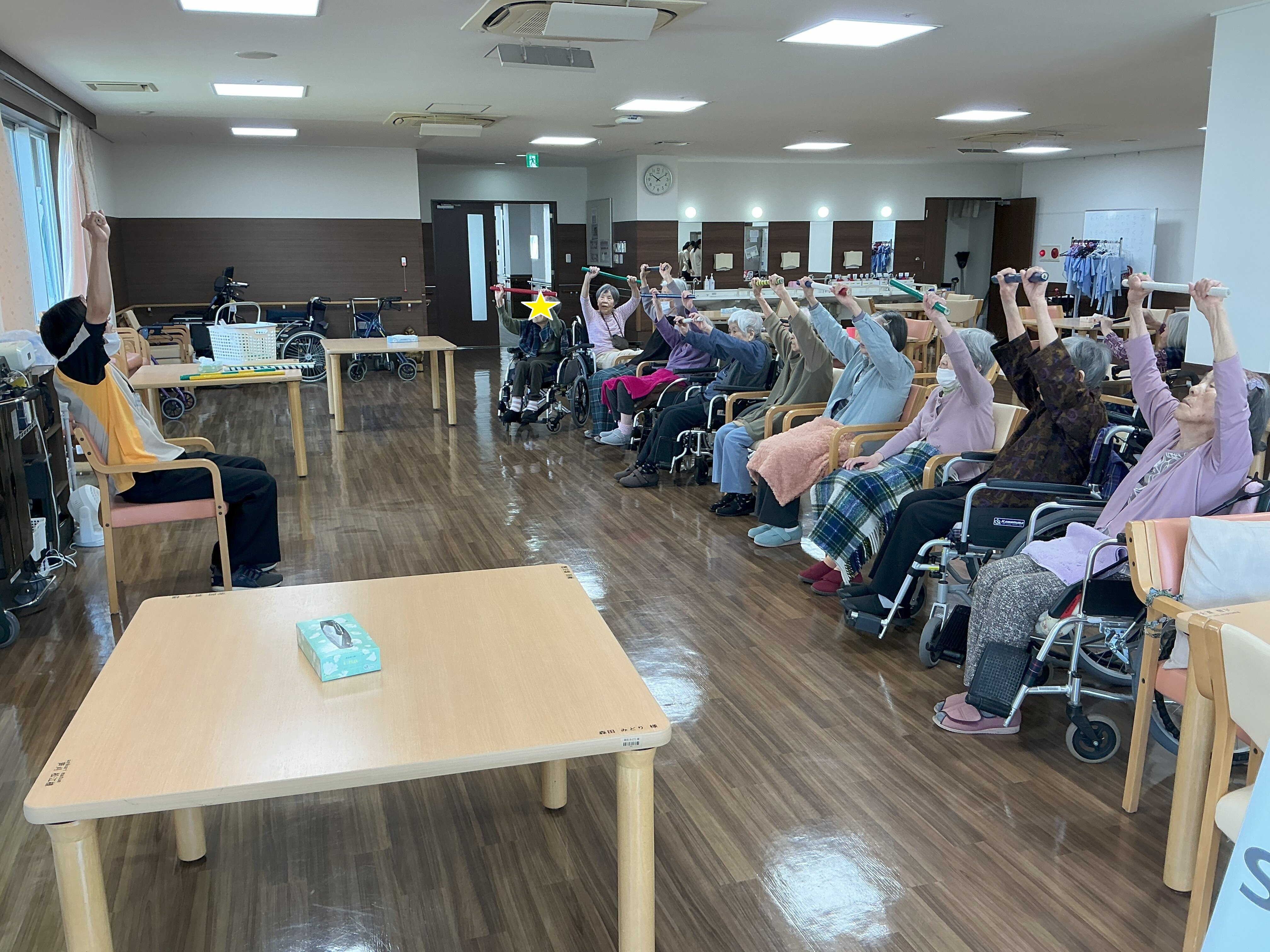 動画では、ご入居者のみなさまがリズムに合わせて元気に1、2、3...と声を出しながら、手を上げたり足を動かしたりして、一生懸命、そして楽しそうに体操に取り組まれています(*´▽`*)