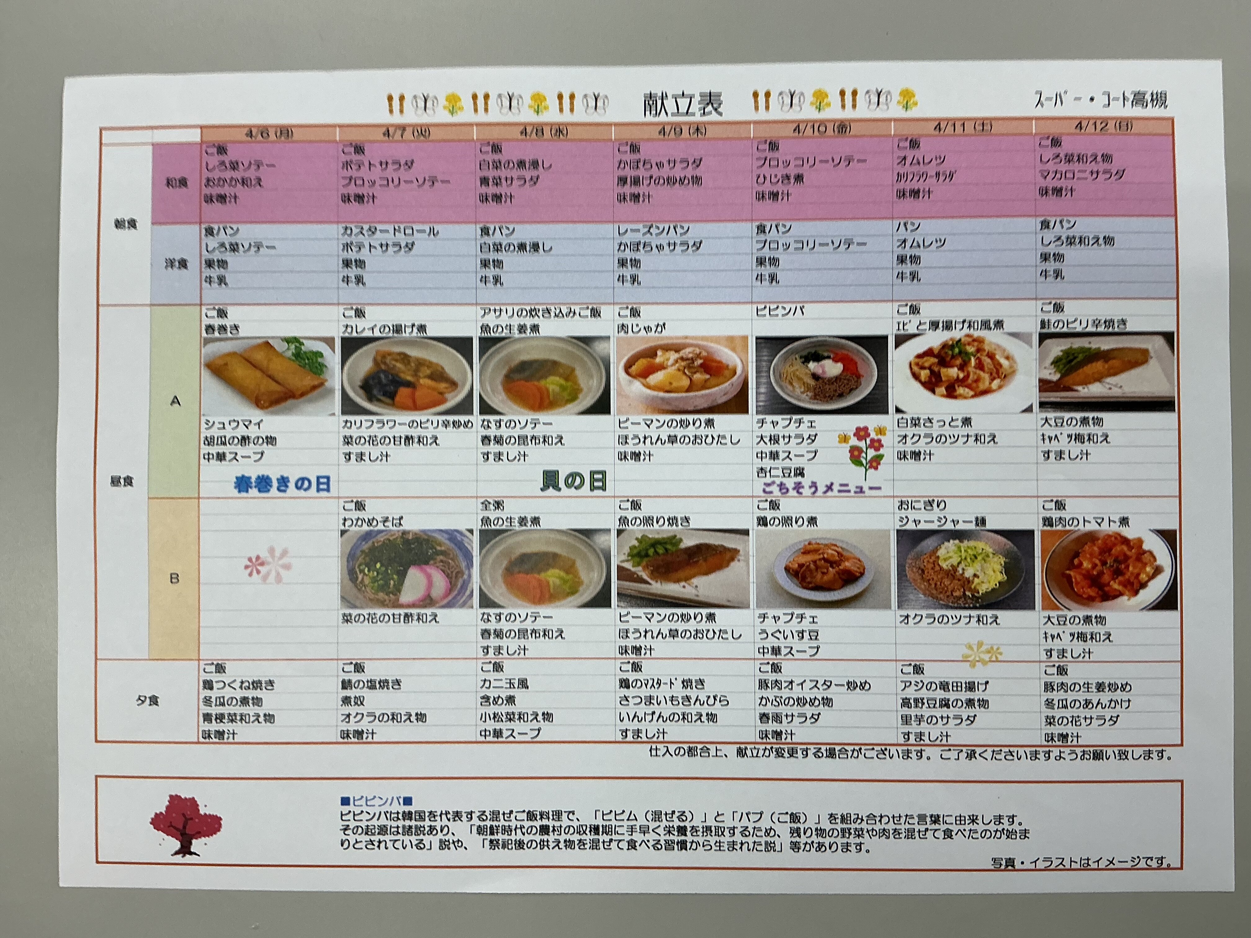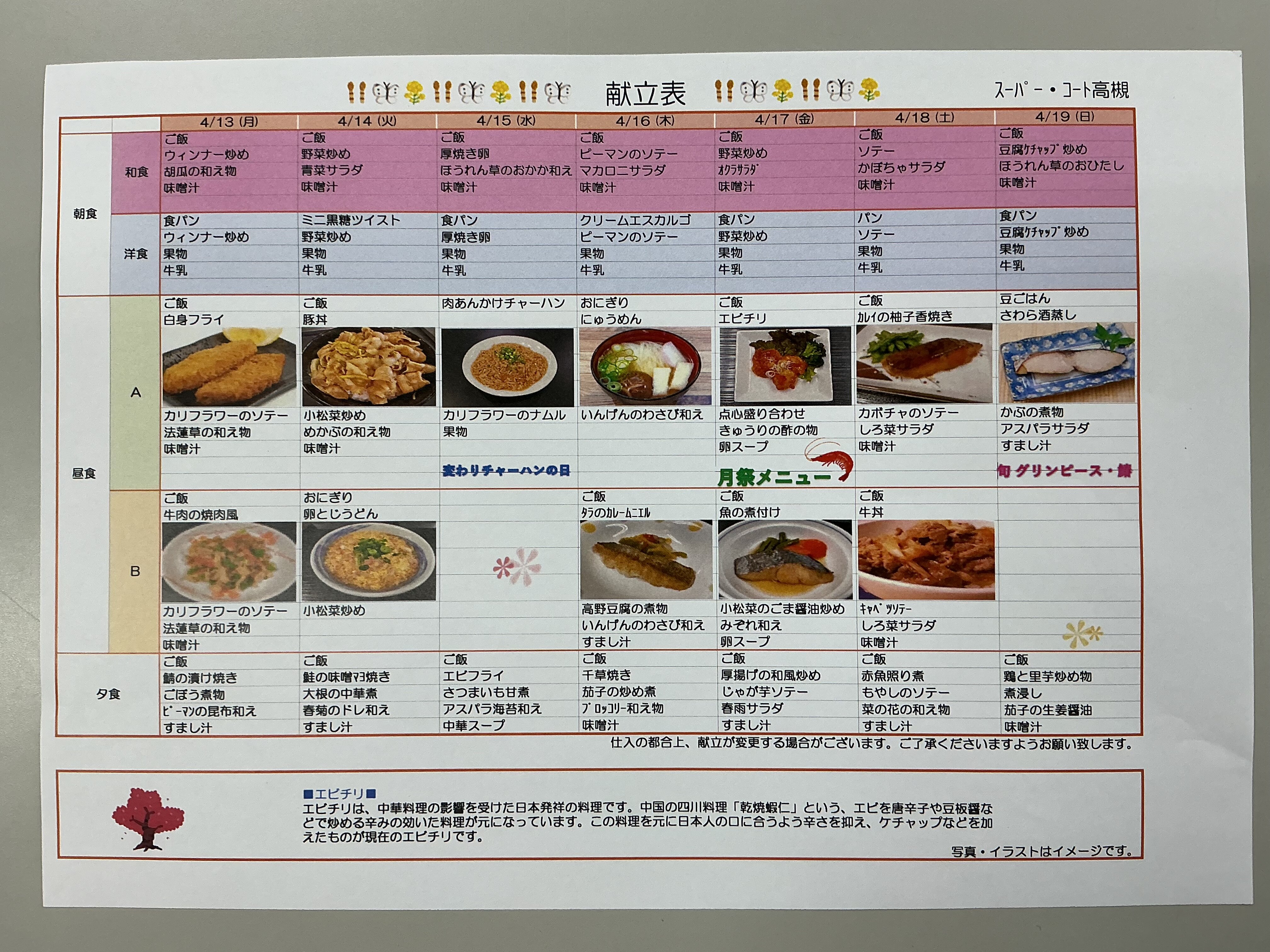 本日は、4/6(月)~4/19(日)までの献立表をご紹介しますね\(^o^)/