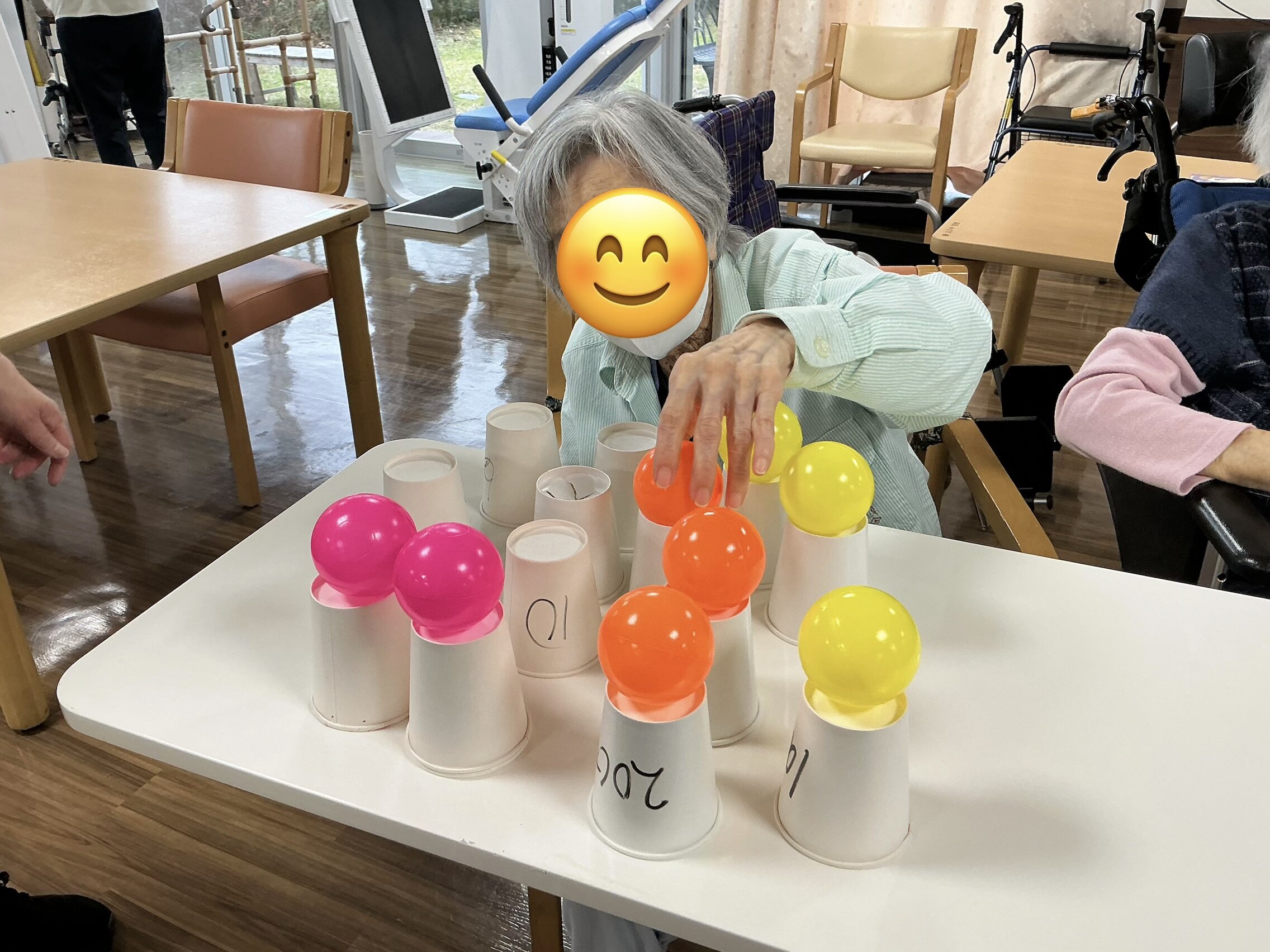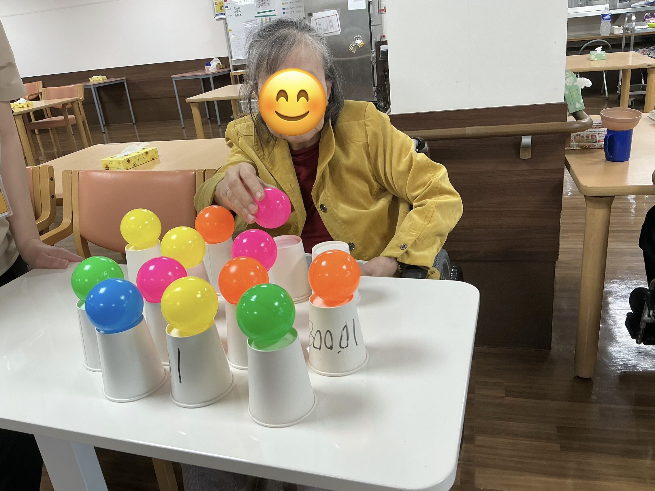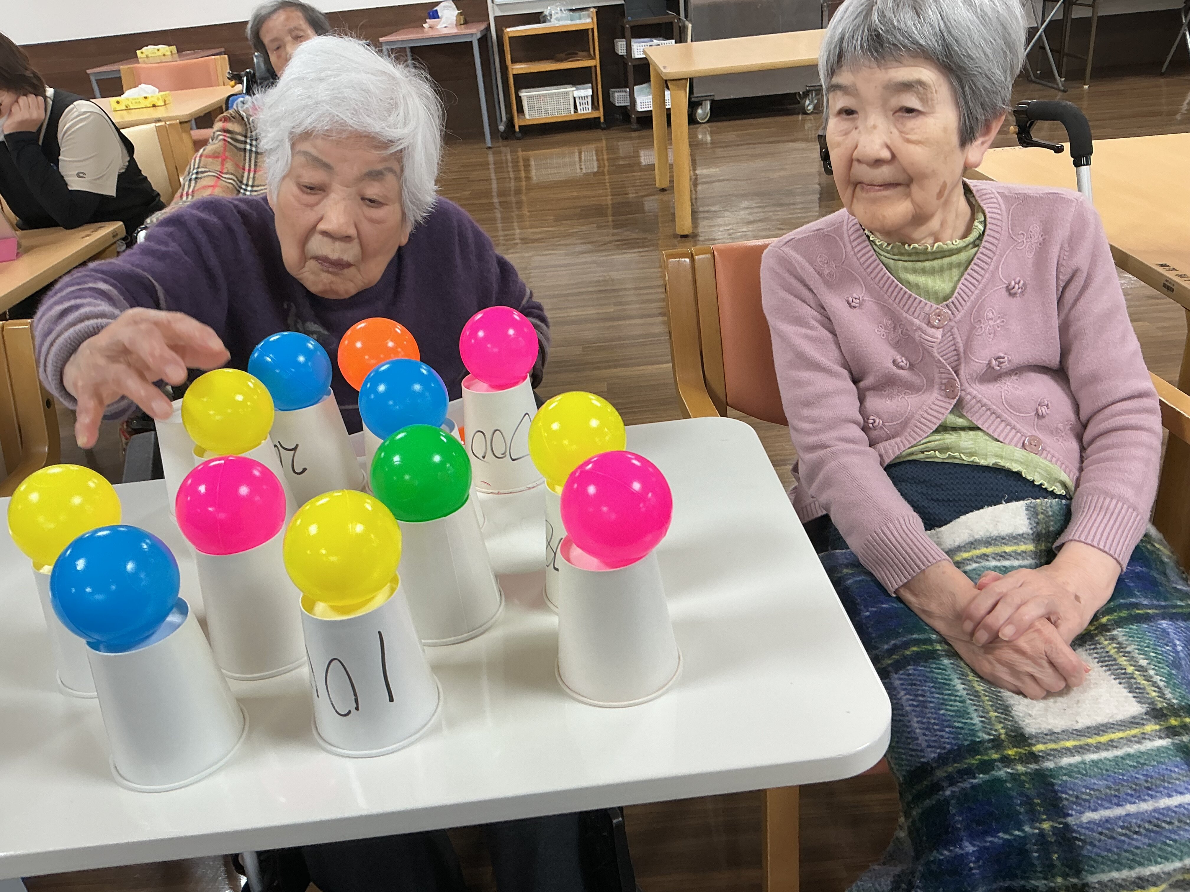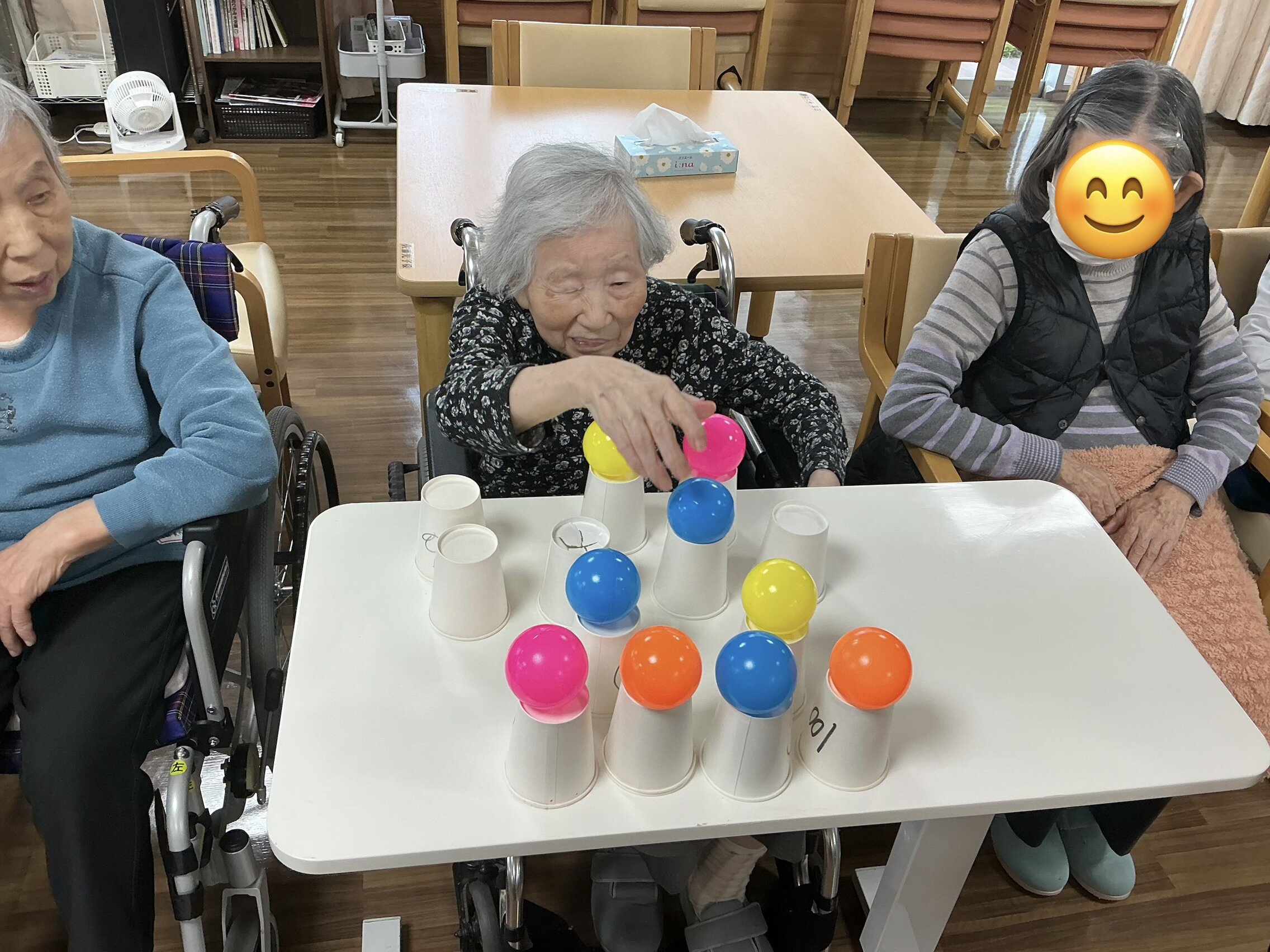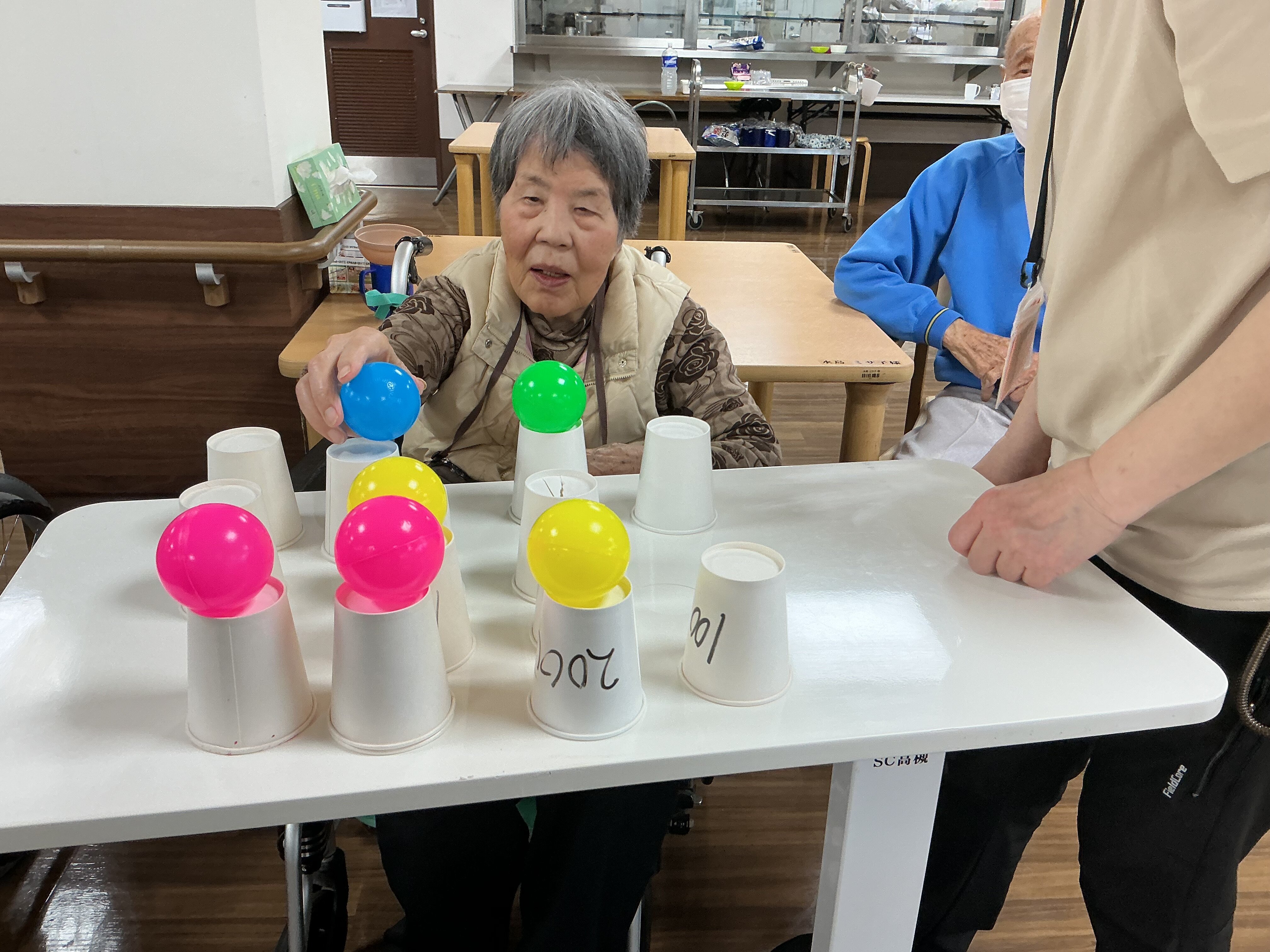 この日は、紙コップを裏返しボールの色を合わせて置いていき、次の方に回していくレクリエーションを行ないました♬