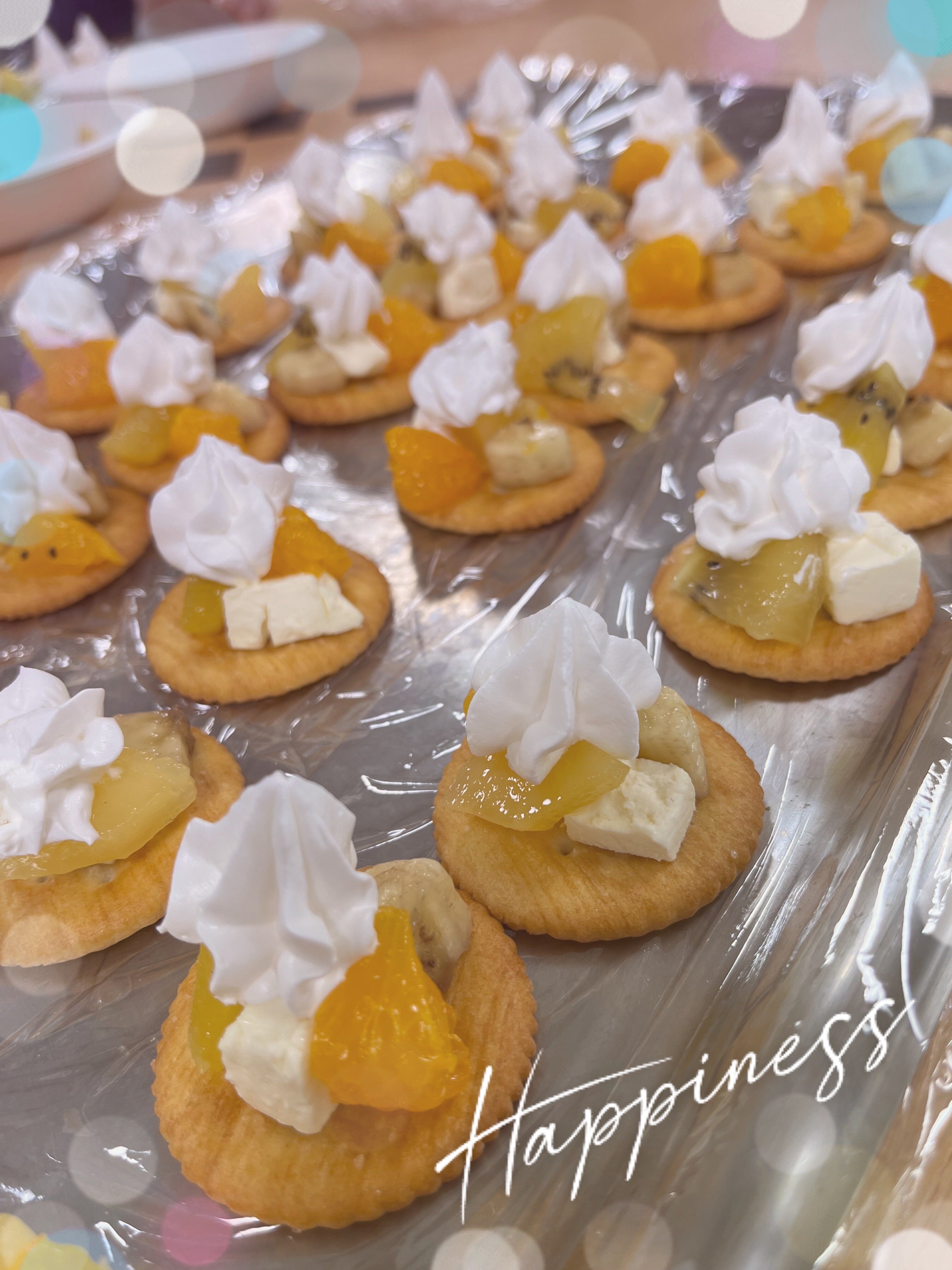 クラッカーの上に刻んだフルーツとクリームチーズ、