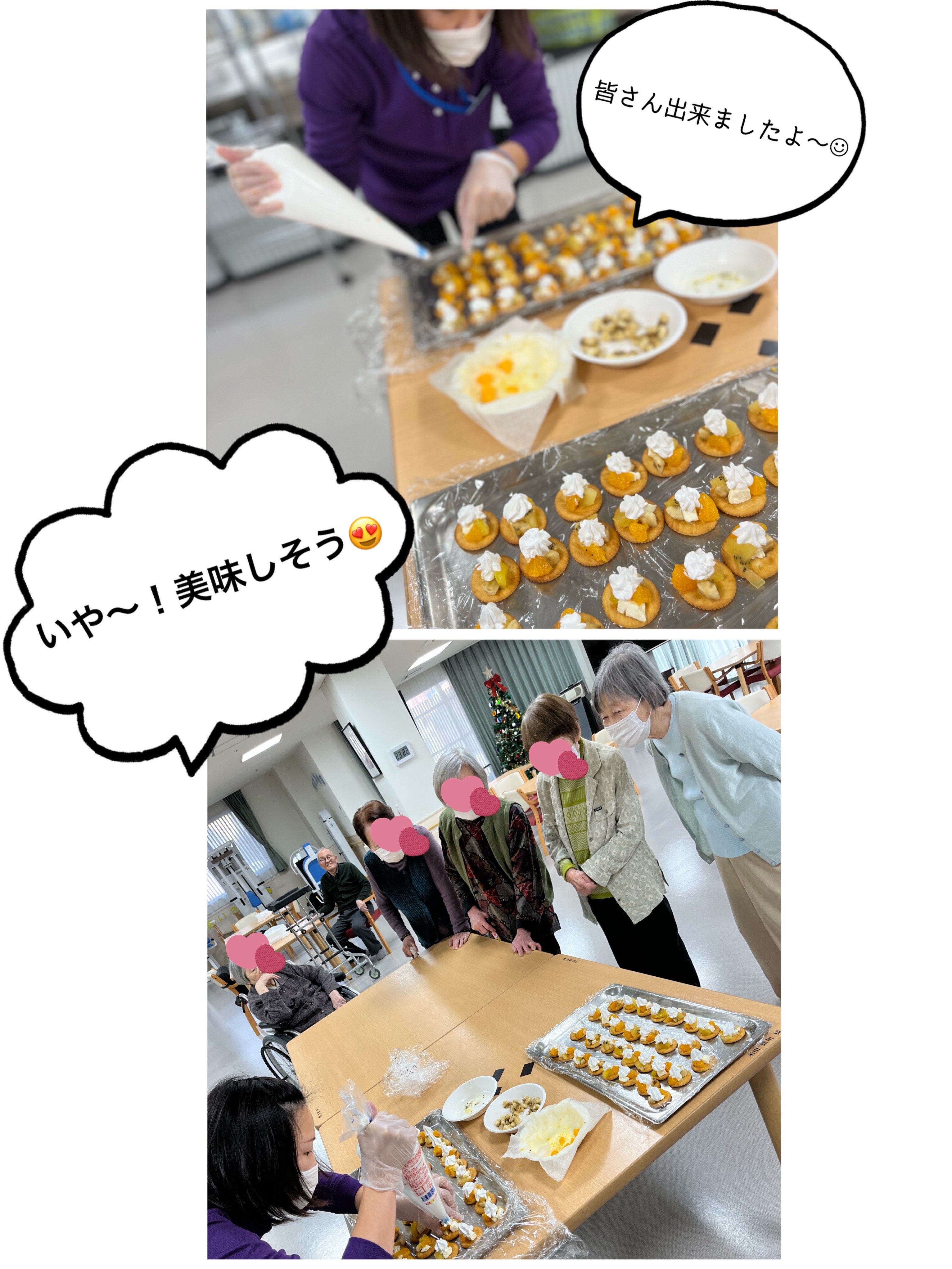 手の込んだスイーツですね♪見ただけで美味しそうですが、ご入居者さんの笑顔でわかりますね!