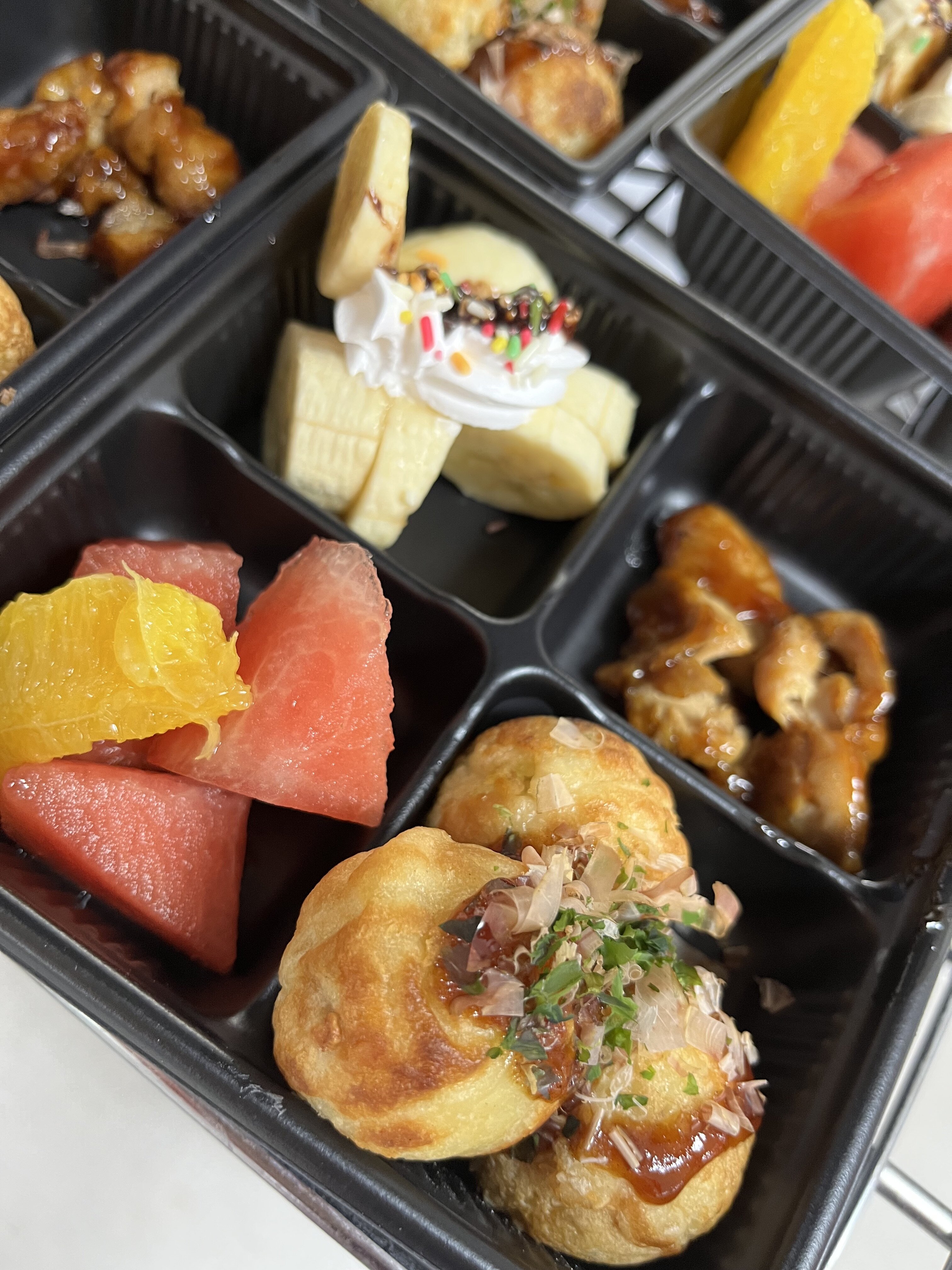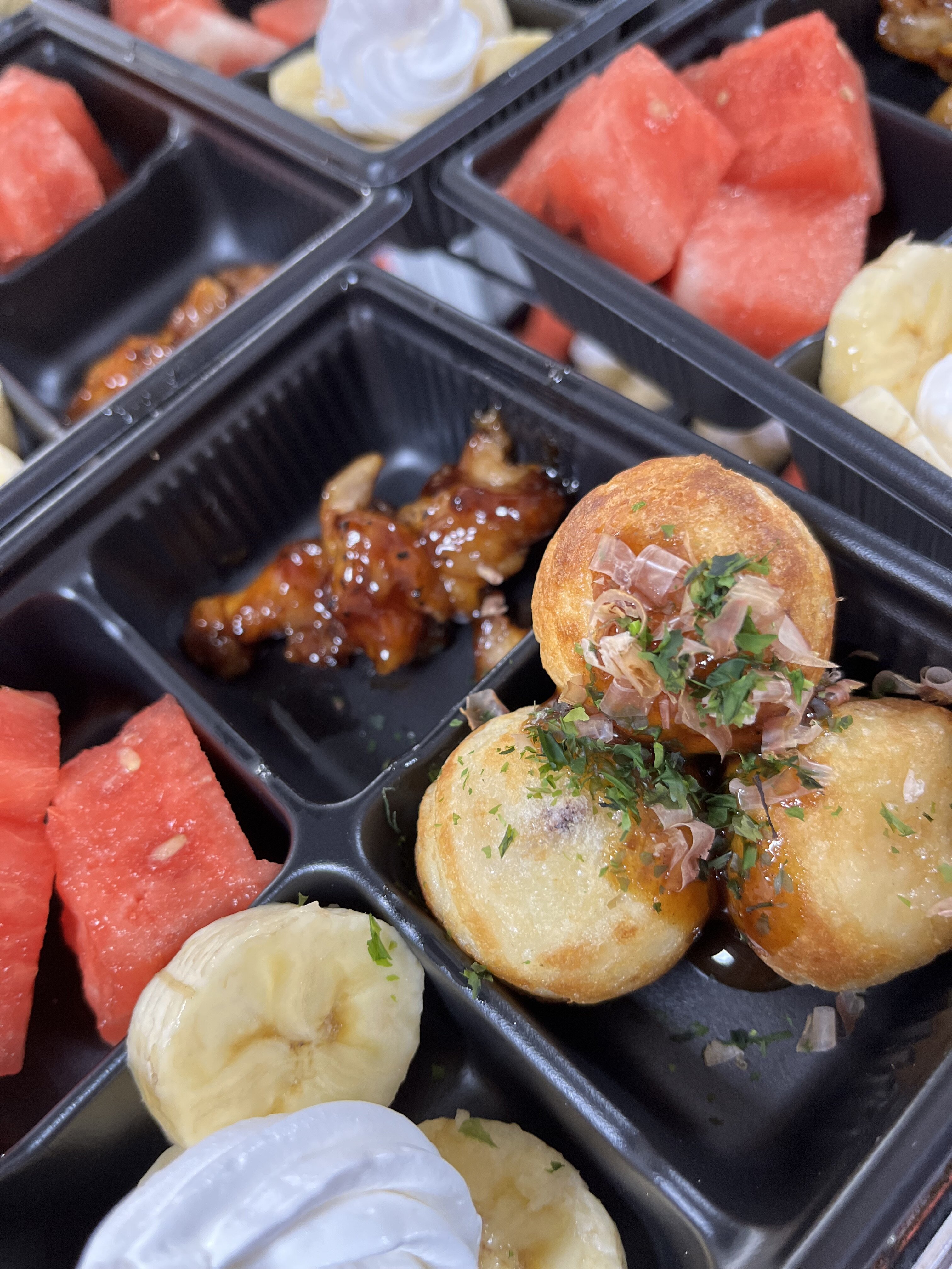 今回のメニューは、たこ焼き・焼き鳥・スイカ・チョコバナナ
