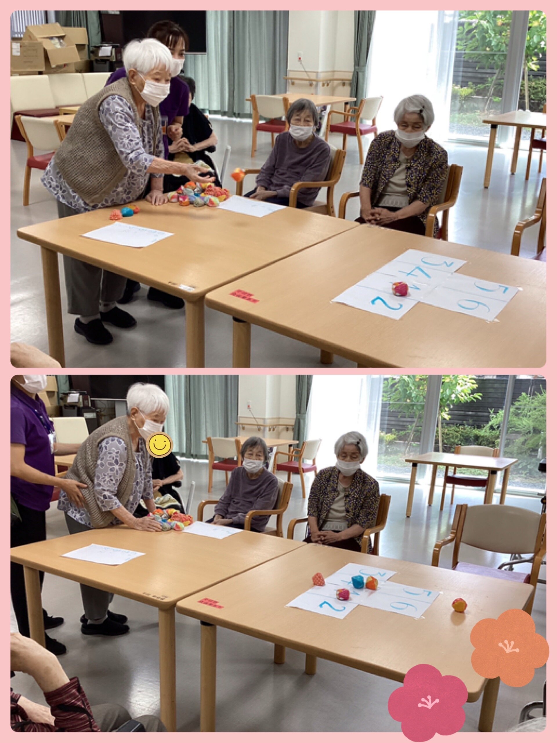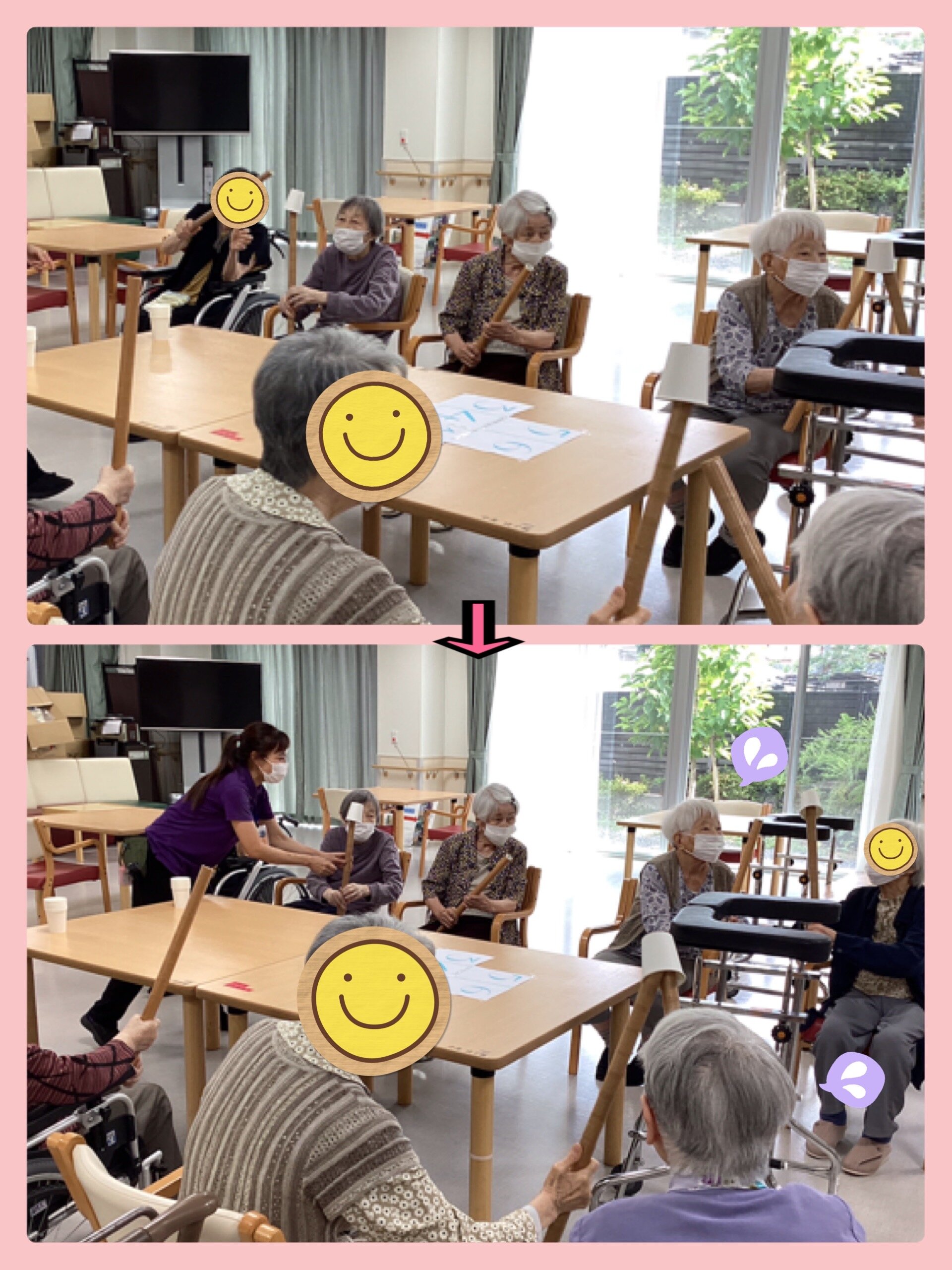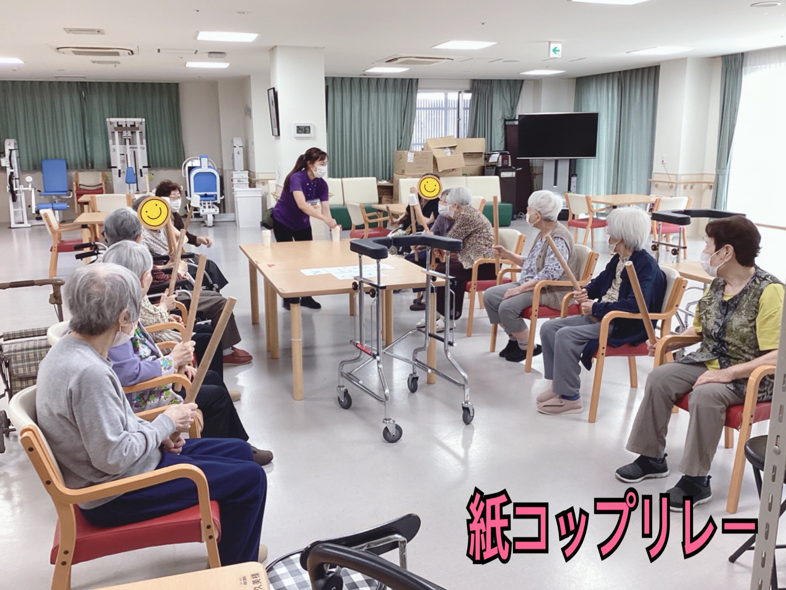 新聞紙で丸めた棒を持ち、紙コップを隣席の方に