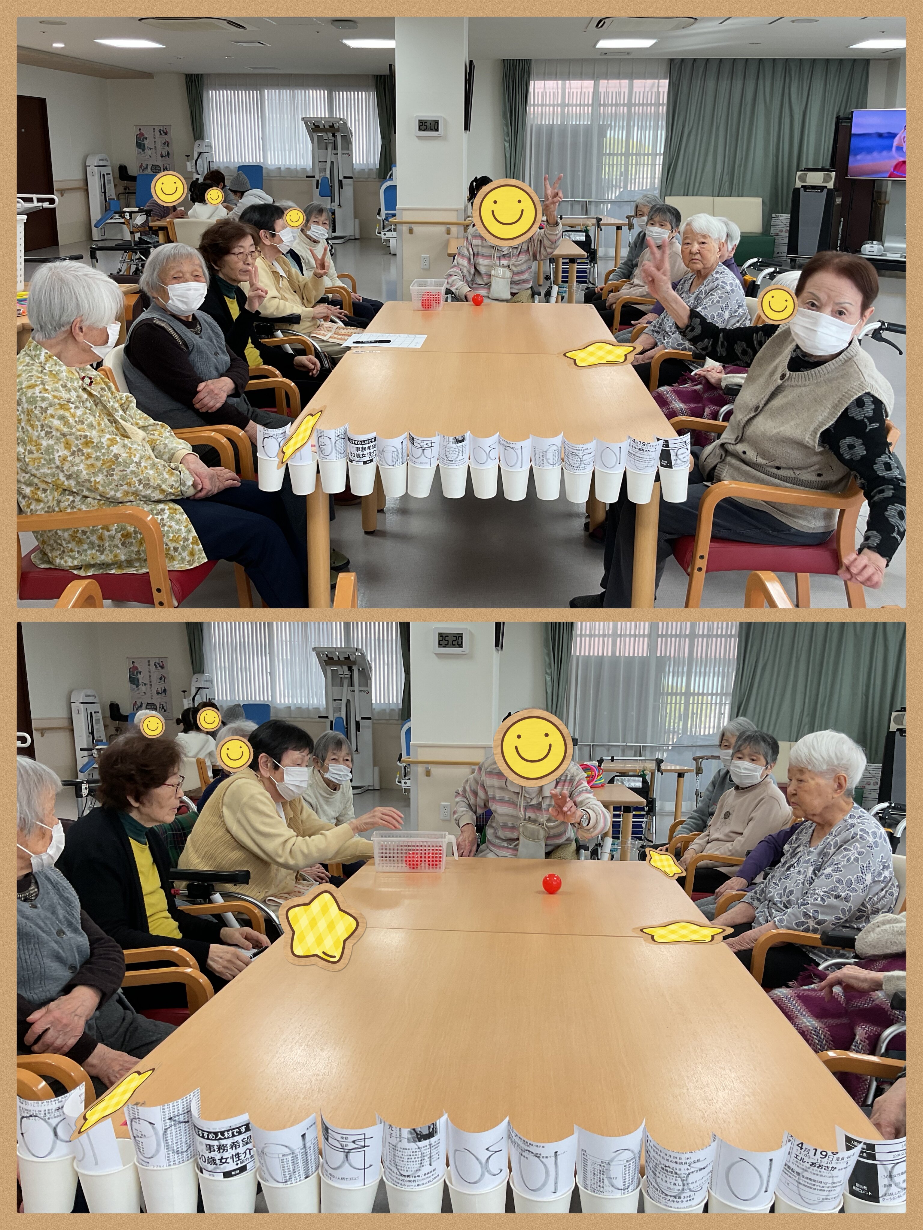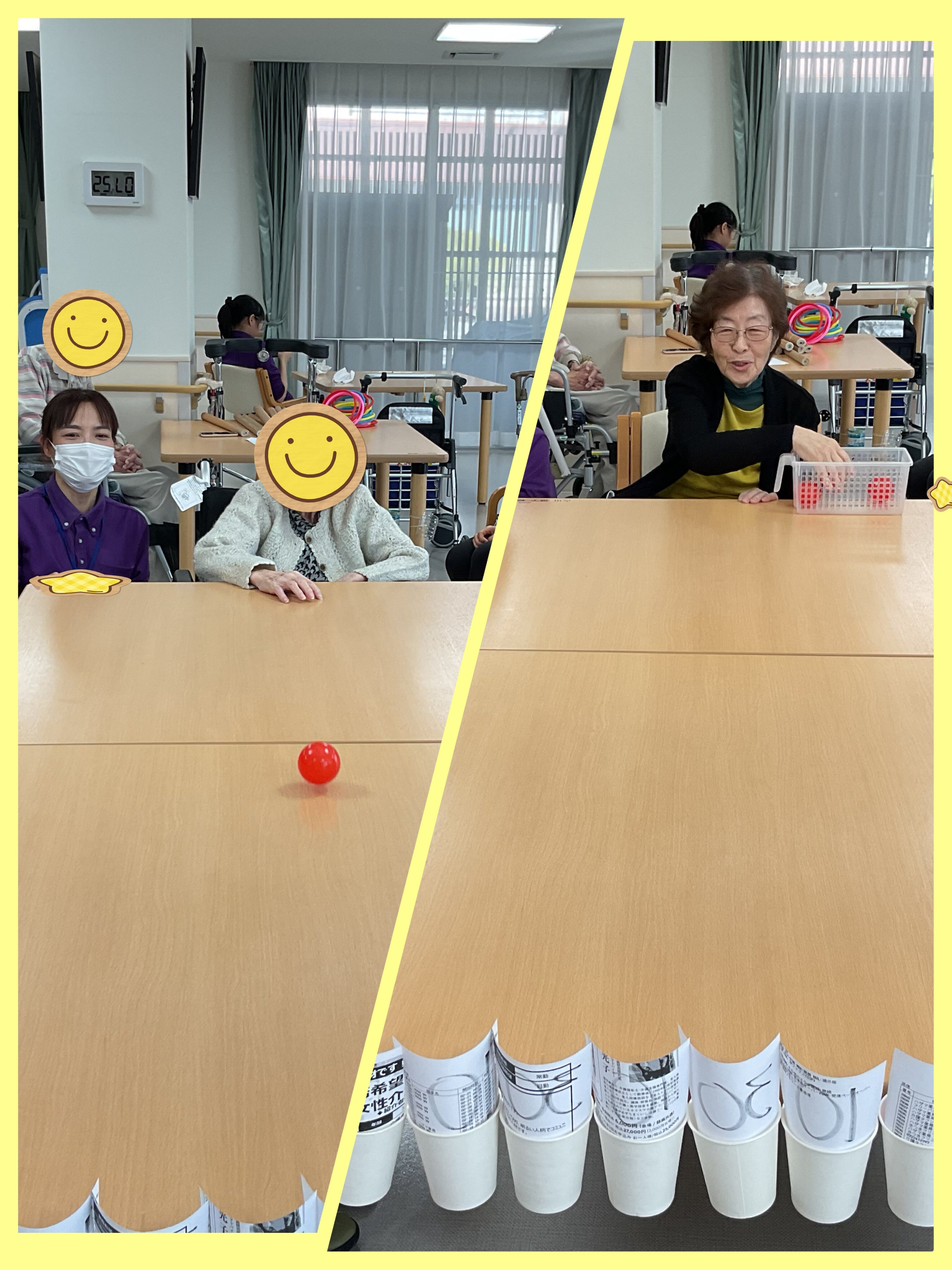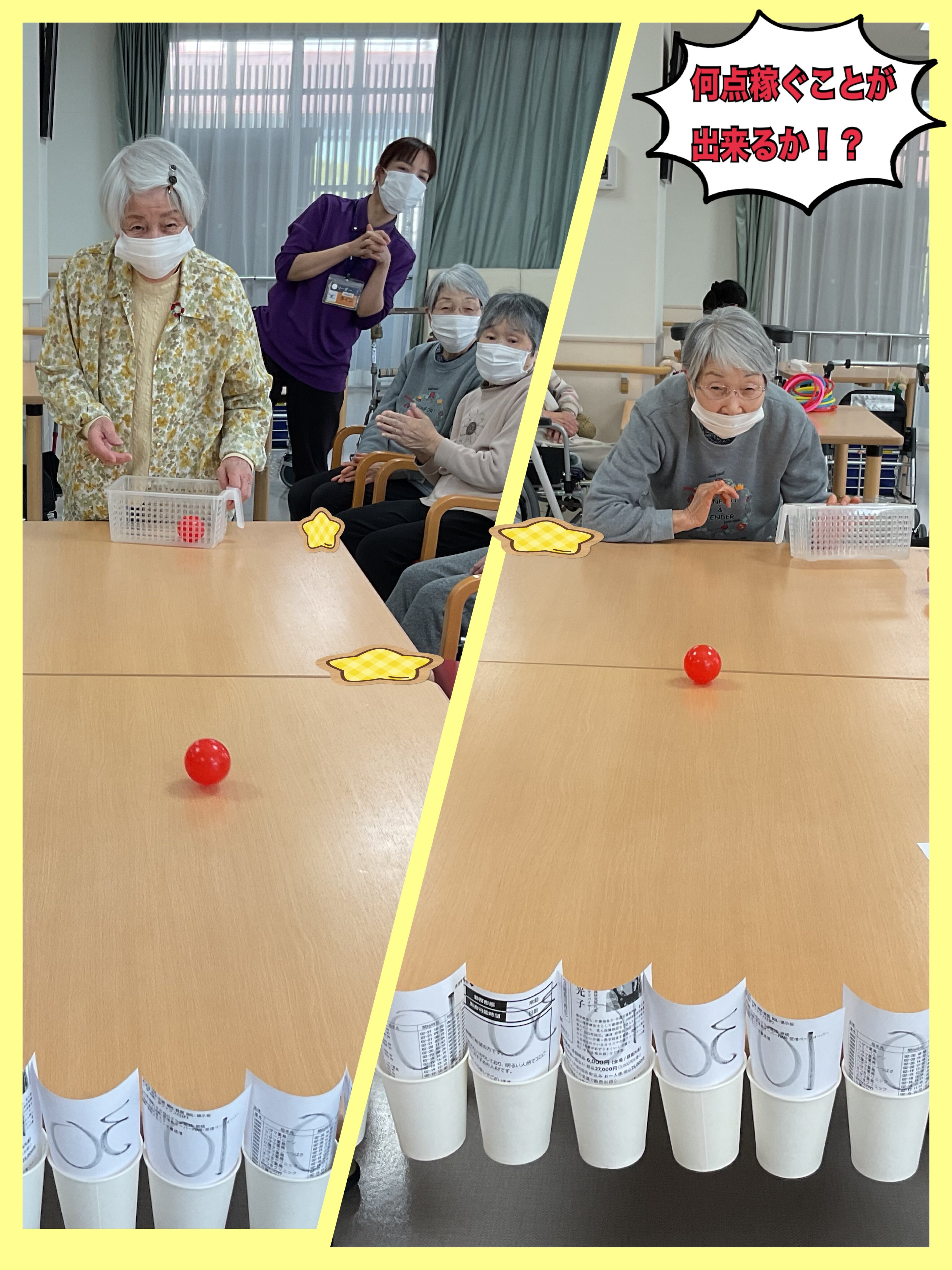 紙コップ上に点数が書いている紙を貼っています。