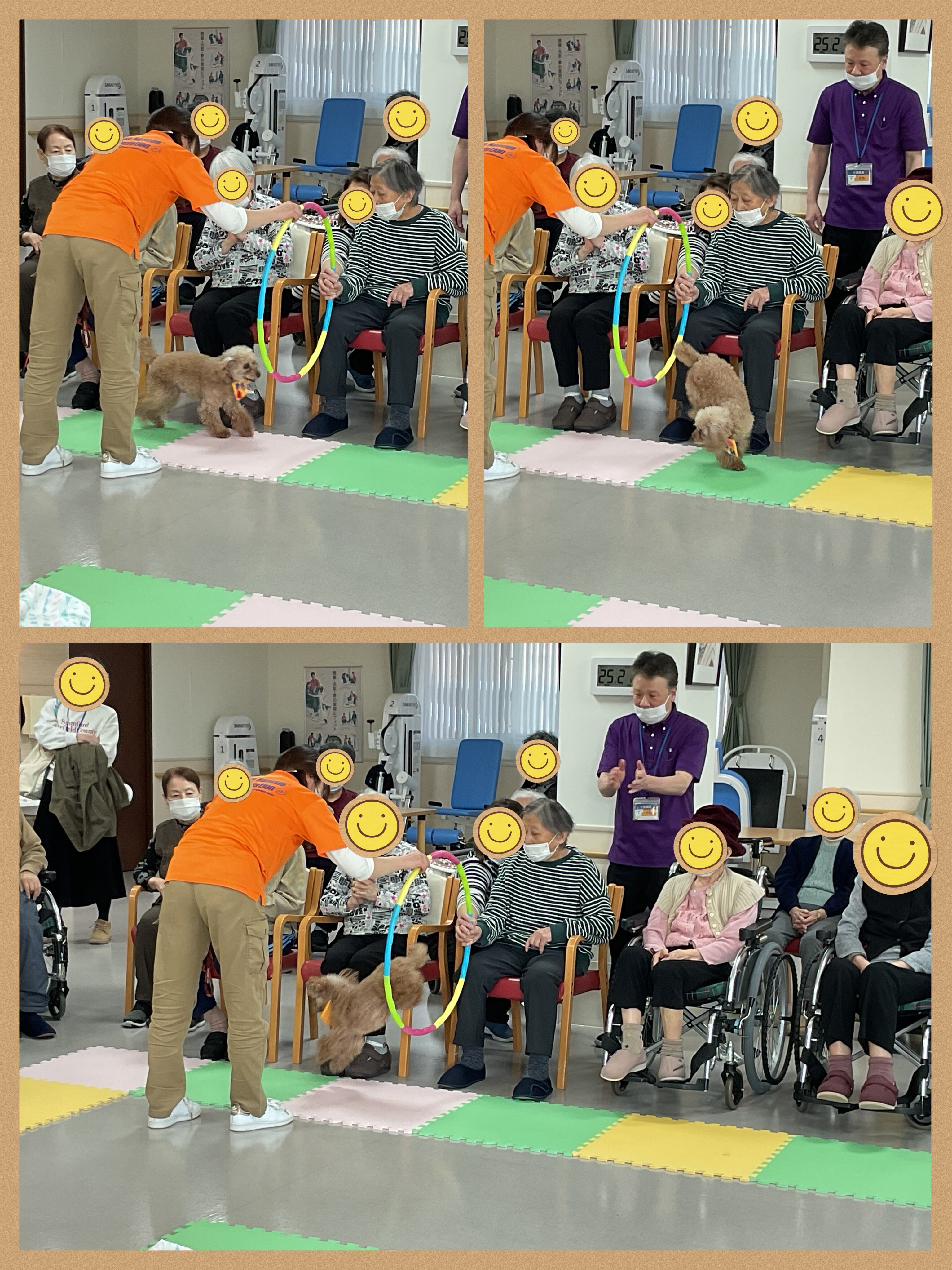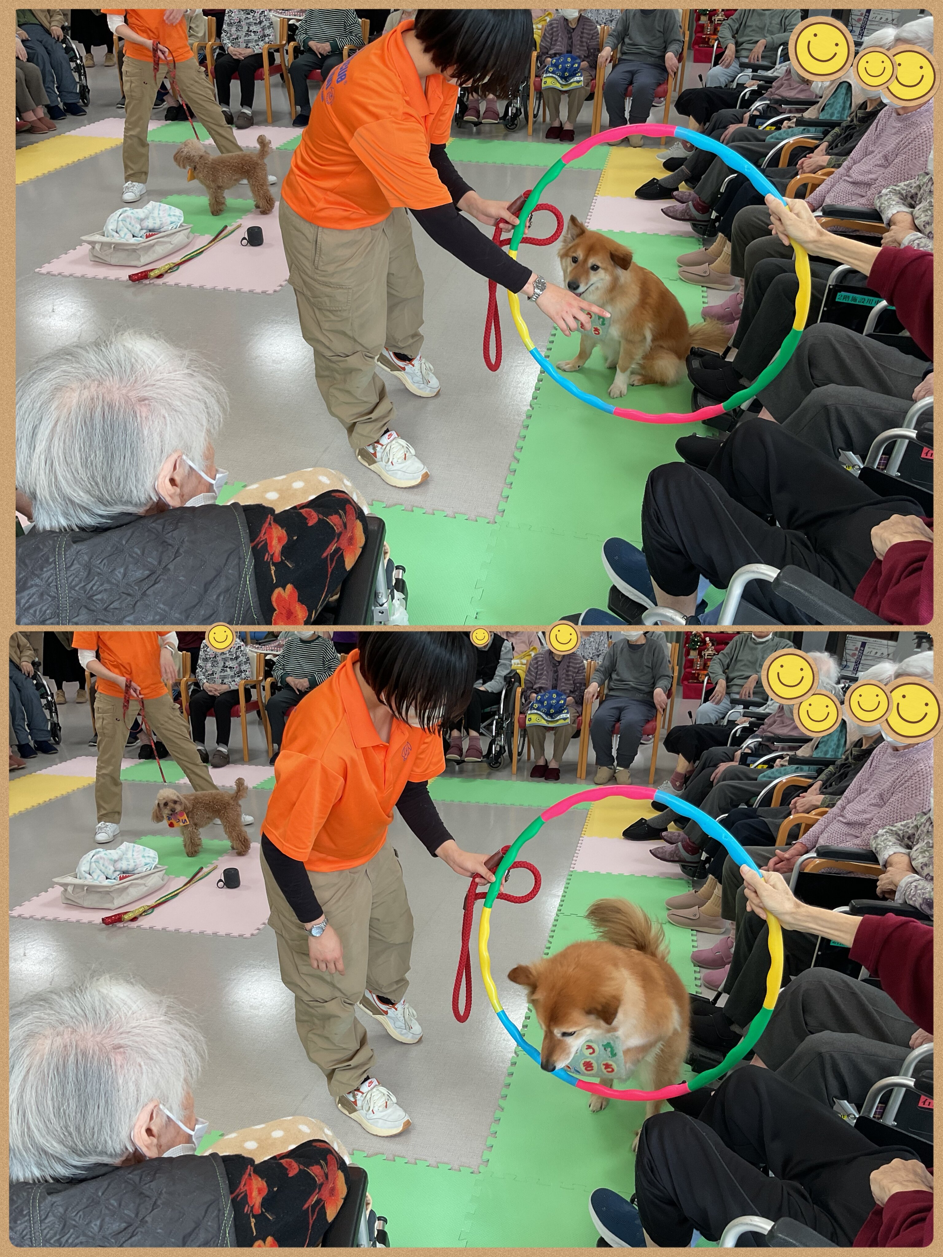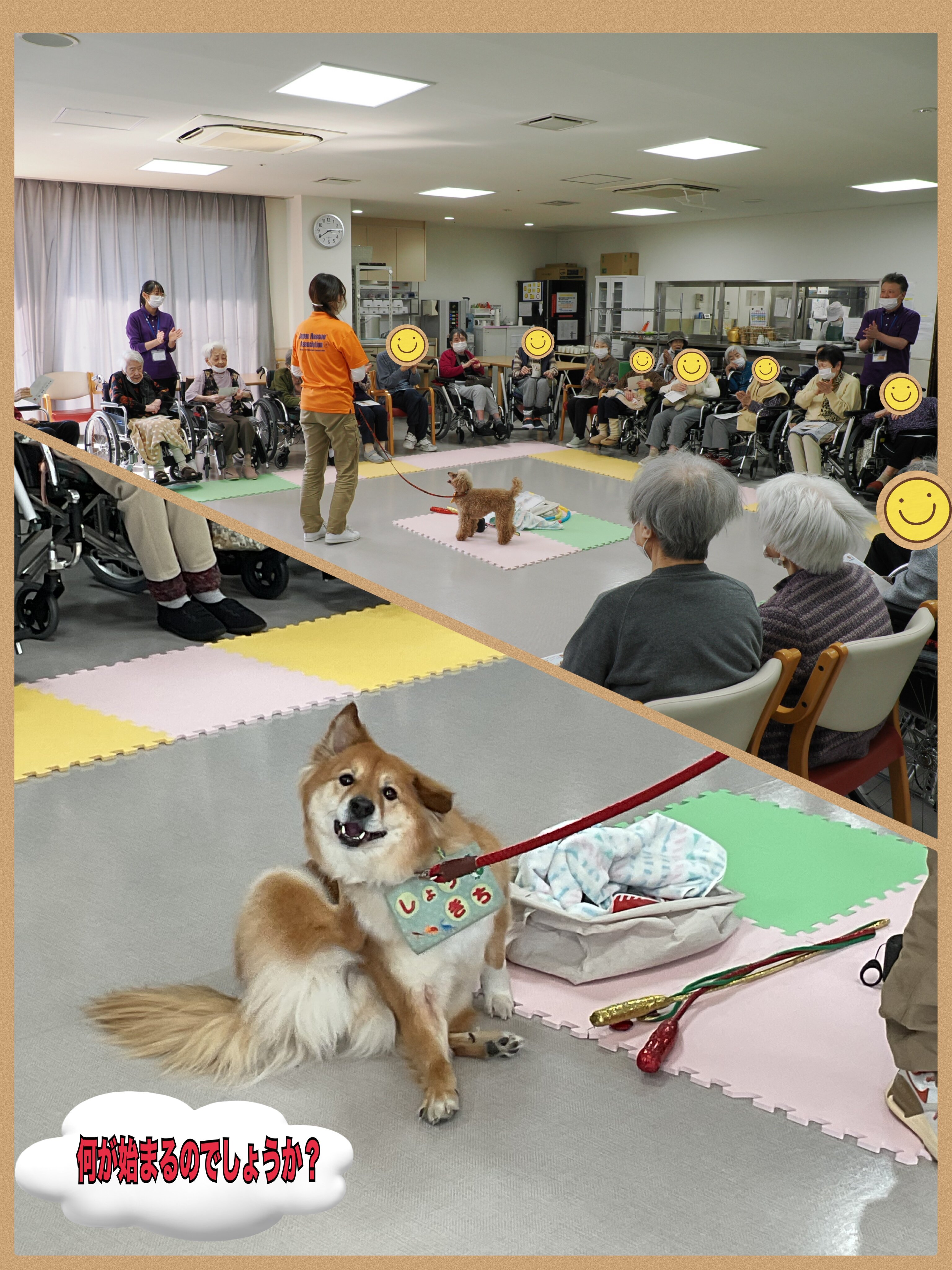 ※わんちゃんとふれあうのが苦手なご入居者様は後列からご覧になりました。※