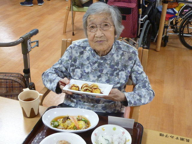たこ焼きは、具材にもちょっと工夫をしてみました! 蛸だと噛み切れなかったら危ないかな?と思い、お麩とチーズにしてふんわり焼き上げました!