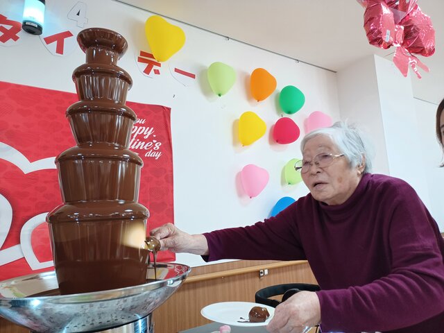 ご入居者の皆様にはチョコレートファウンテンでおやつにチョコをかけて頂き、美味しそうに召し上がって頂きました!