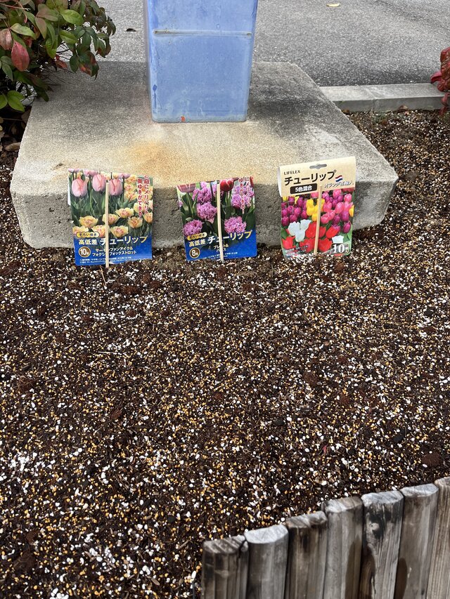 夏は向日葵が咲いていた看板下ですが、現在チューリップの種を植えております♪