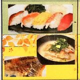 ご飯、お刺身盛り合わせ、炊き合わせ、赤だし、デザートになります。