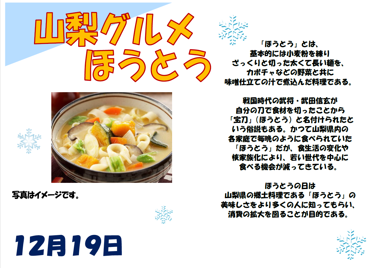 12/19 本日、山梨県の郷土料理「ほうとう」を提供させていただきます。