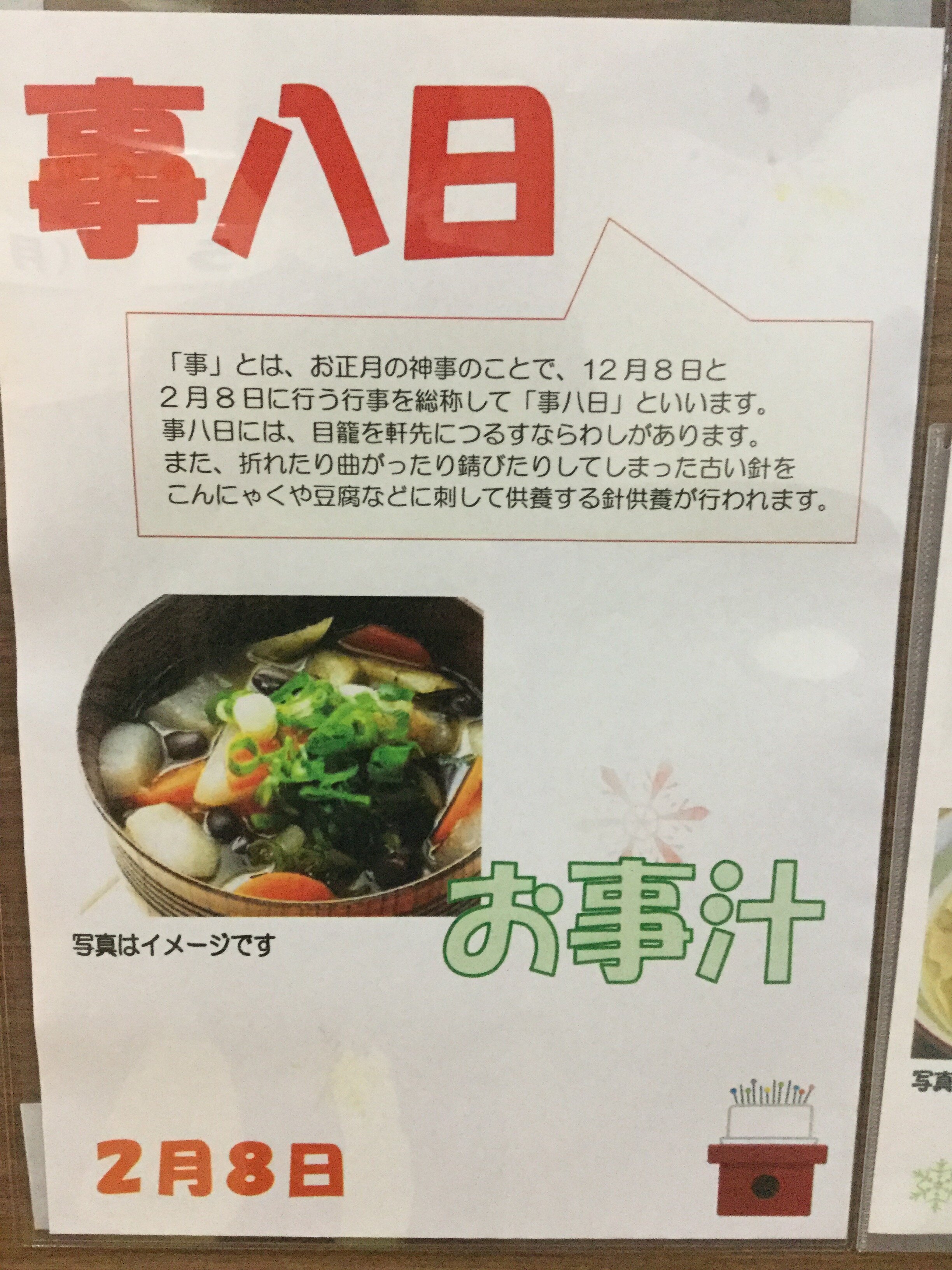 (八日節供 、 八日待 (まち) 、 八日ぞう 、 事始め / 事納め 、 お事始め / お事納め 、 八日吹き 、 八日行 、 節供始め / 節供納め 、 お薬師様 、 恵比寿講 などとも呼ばれるが、 民俗学 上は「事八日」と総称される 。 概要 例外もあるが原則として、 2月8日 と 12月8日 の年2回またはいずれかに行われる、2月8日と12月8日のどちらかを「事始め」、他方を「事納め」と呼ぶことがある) (Wikipediaより)