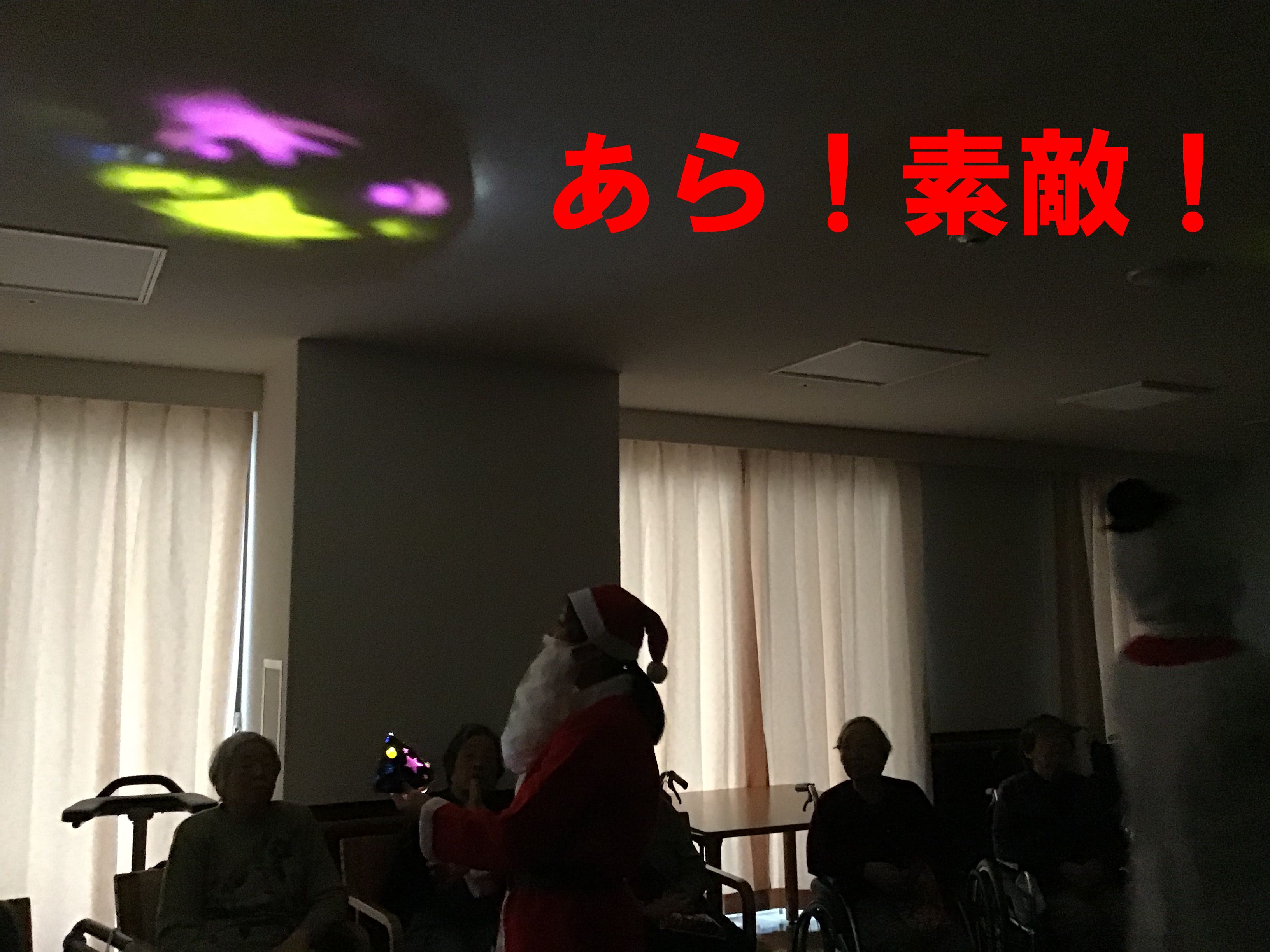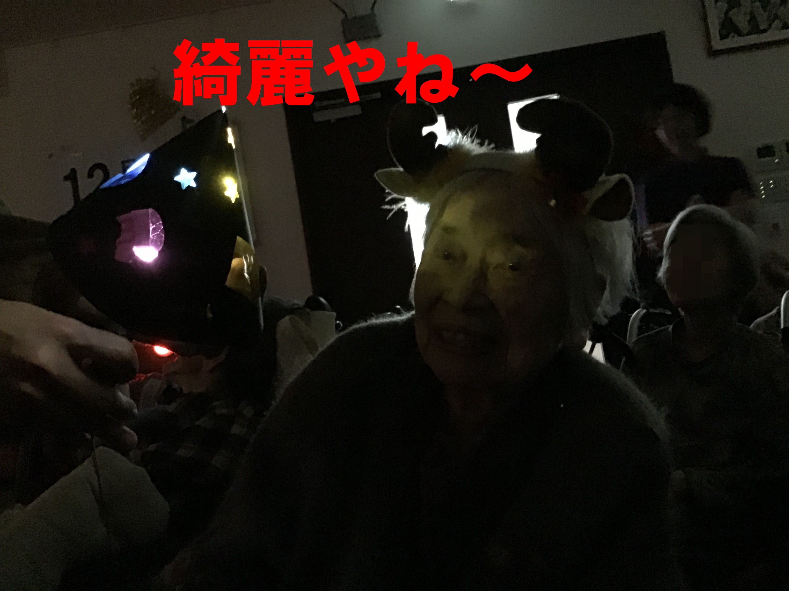 クリスマス会、楽しそういですね。円になって中央が舞台になるのも皆さんが均等に観ることができますね。ライトアップも施設での取り組みは初めて見ました。ご入居者が喜ばれた様子がわかります。