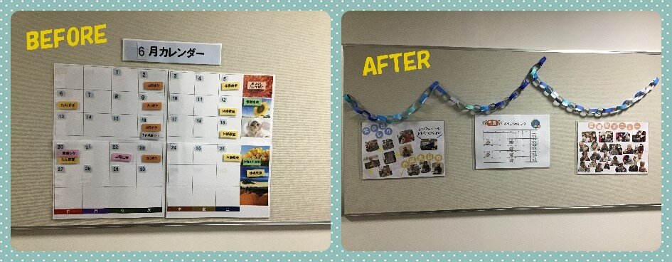 新しいカレンダーでは、前月のレクリエーションの写真や、季節の飾りを掲示しています。