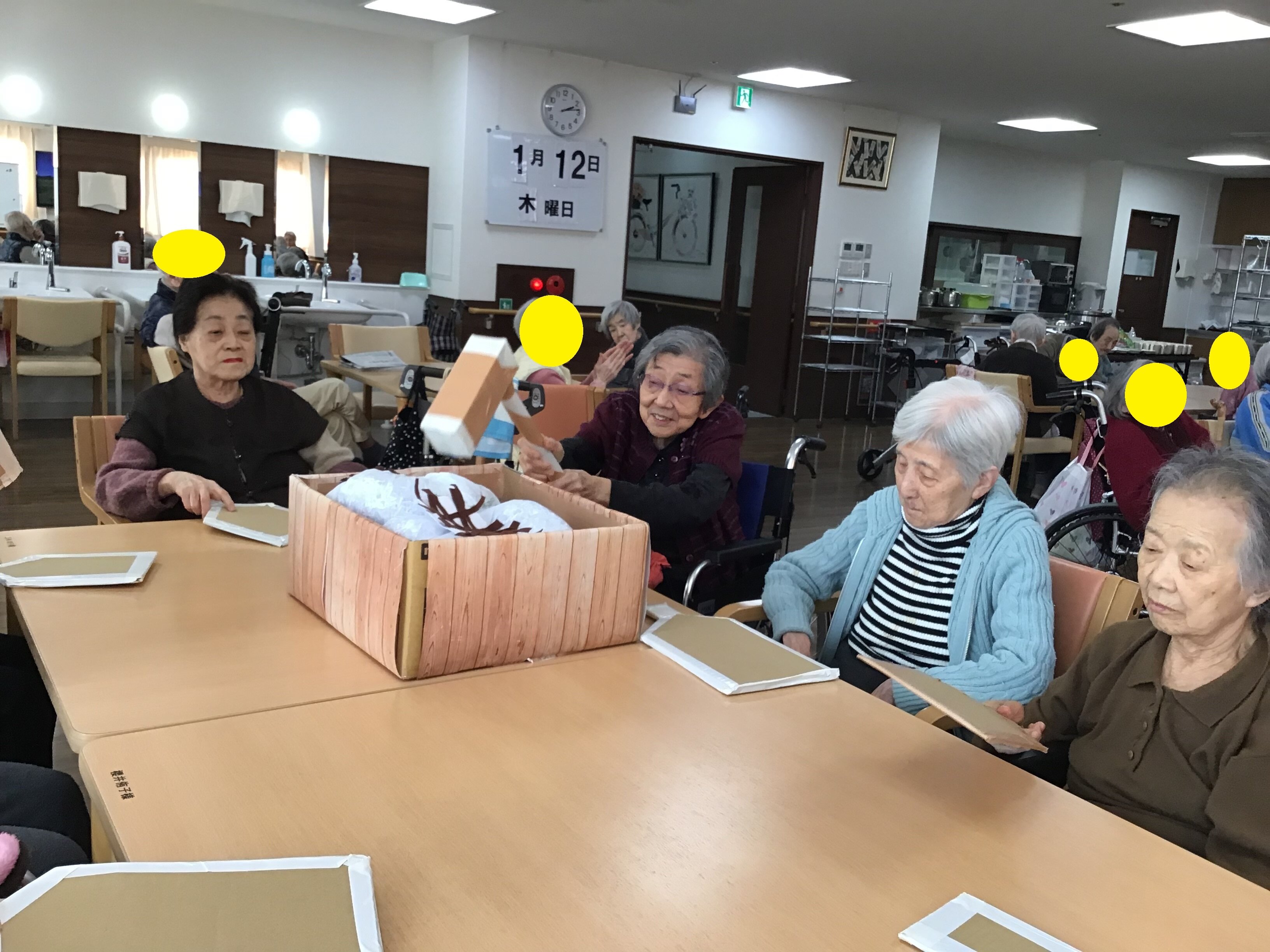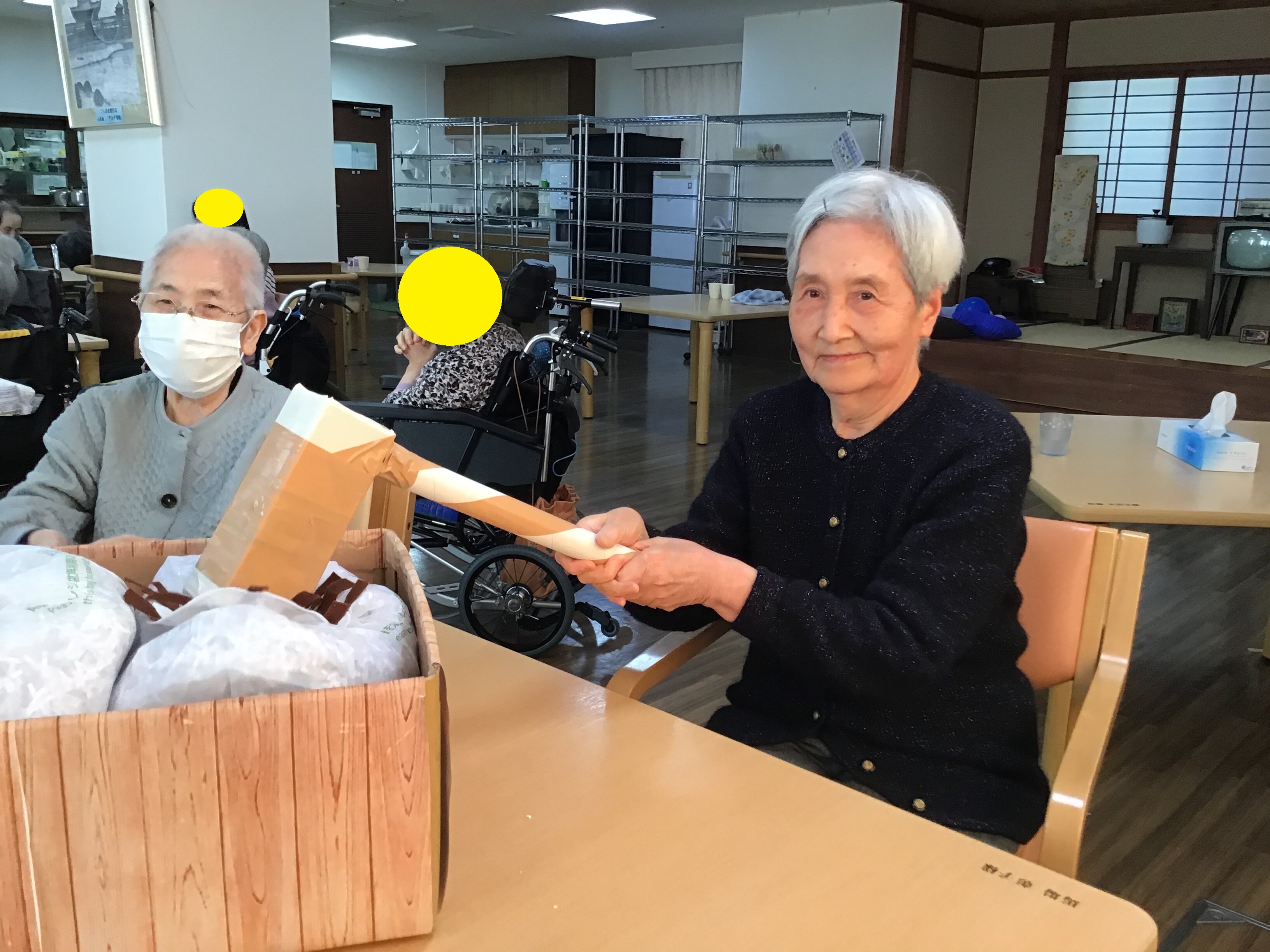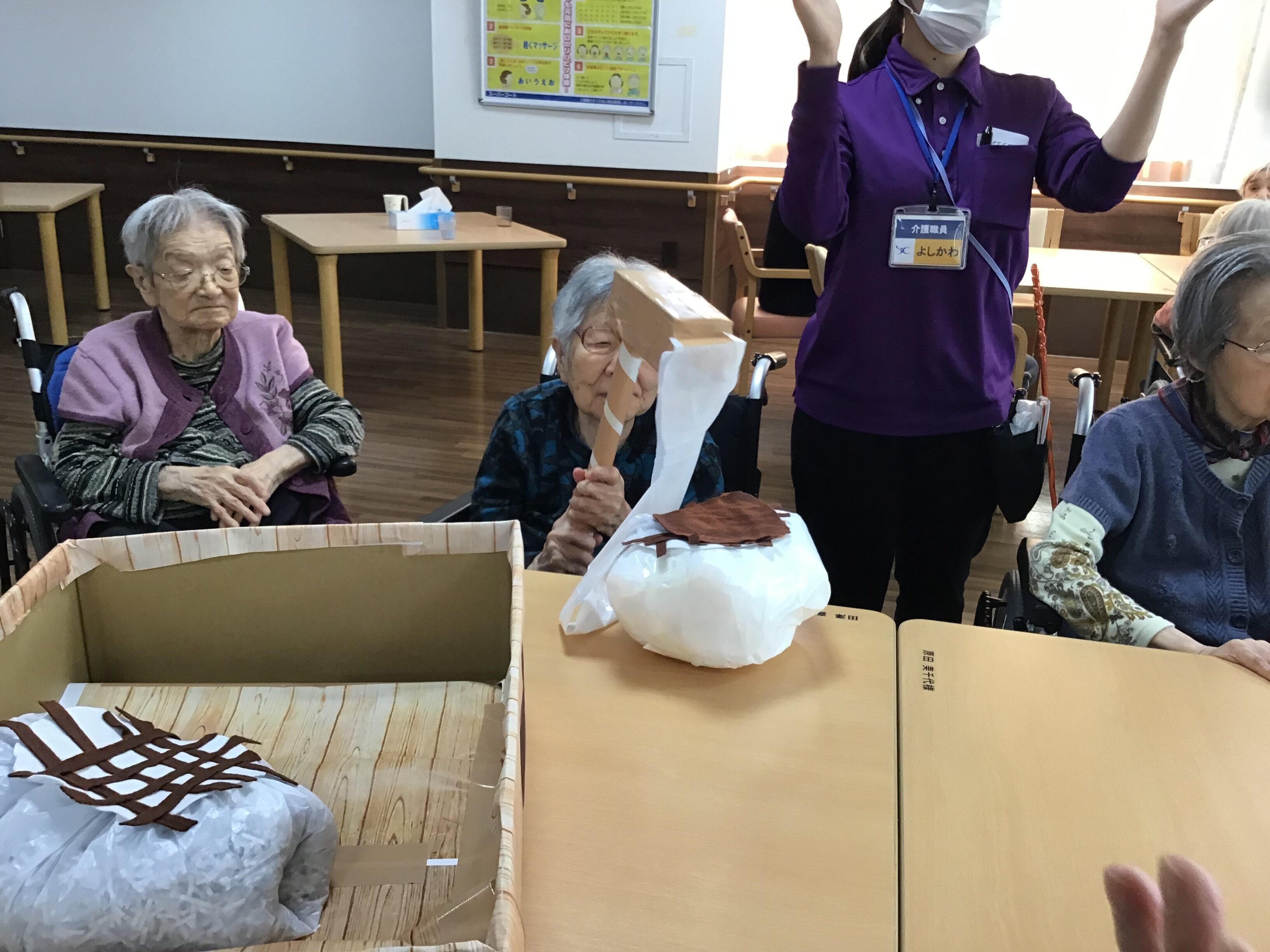 今月はお正月レクとして、段ボールとちり紙を使用して疑似的な餅つきと羽子板をしました。
