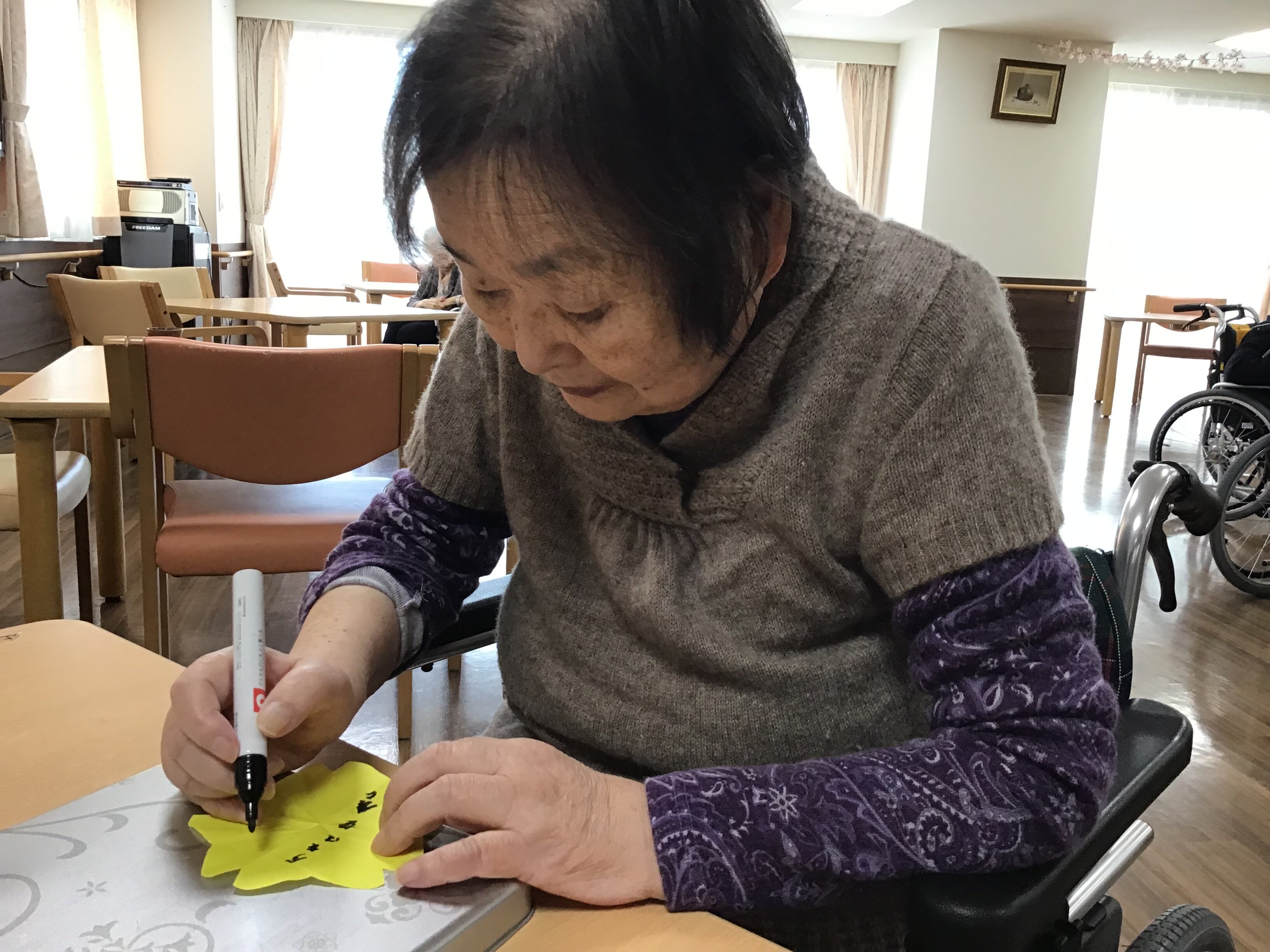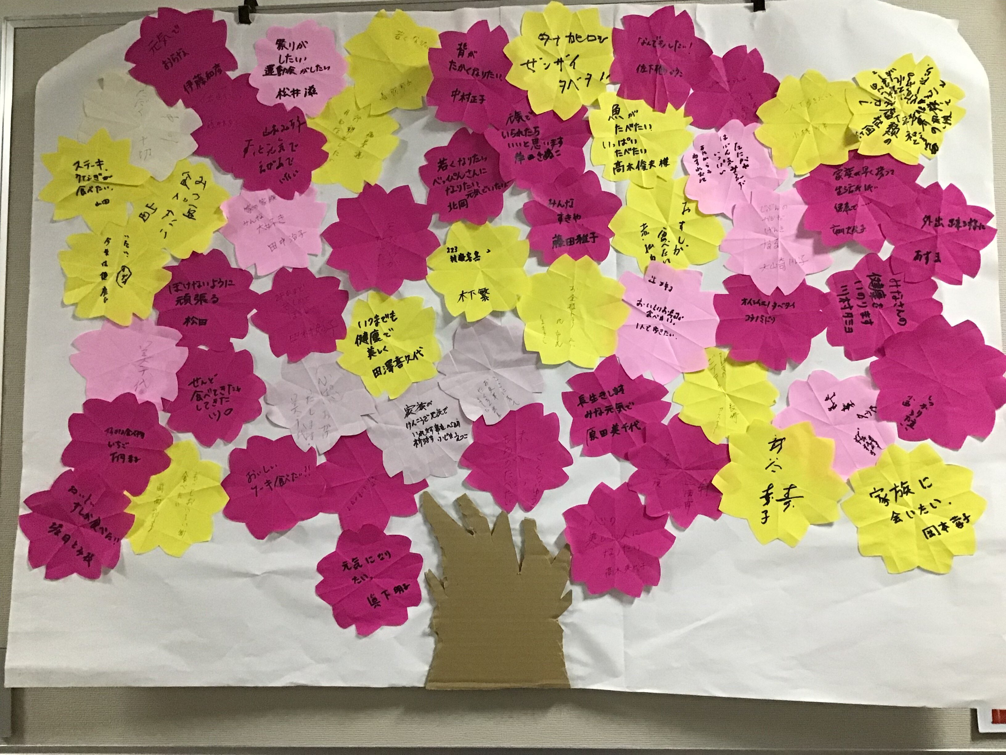 ご入居者の皆様に桜の花びらを模した物に目標などを書いて頂き、桜の木を作成致しました。