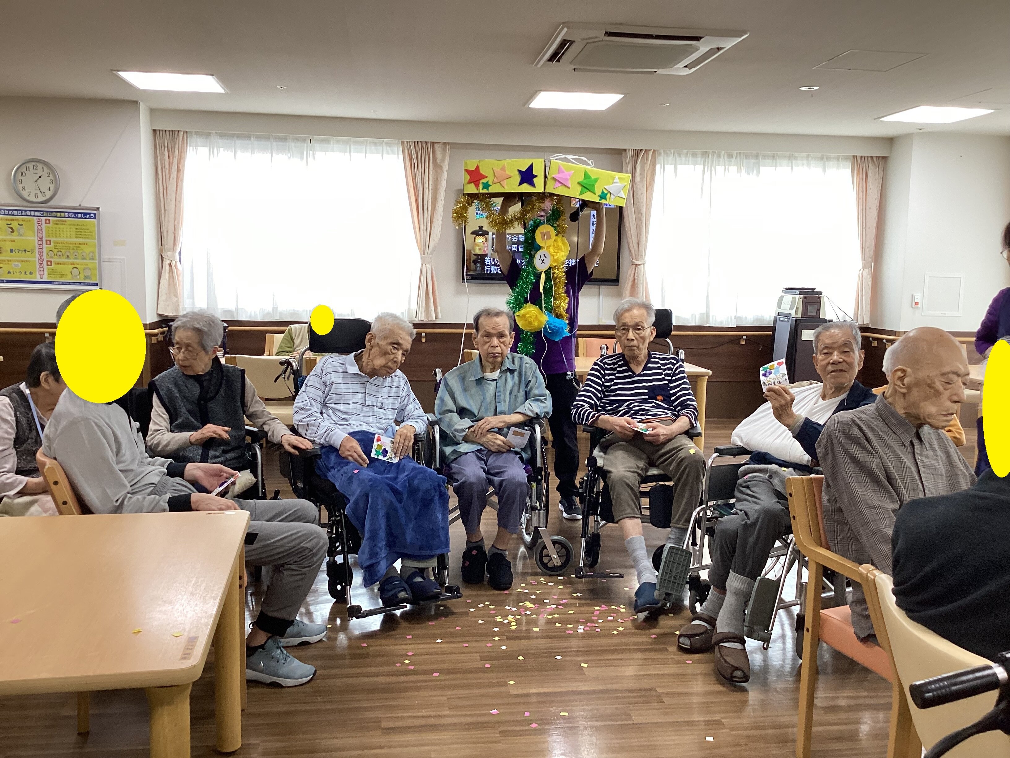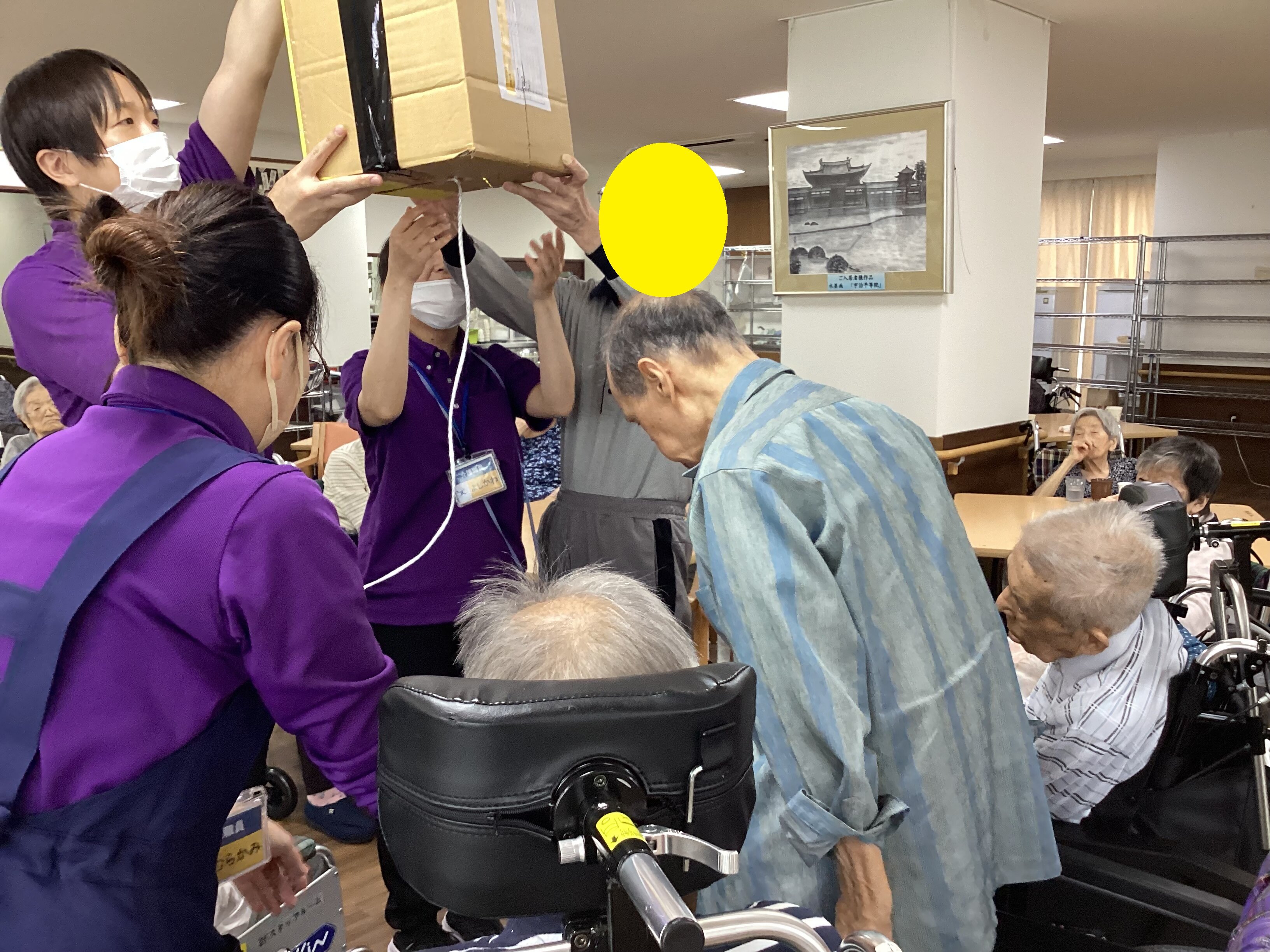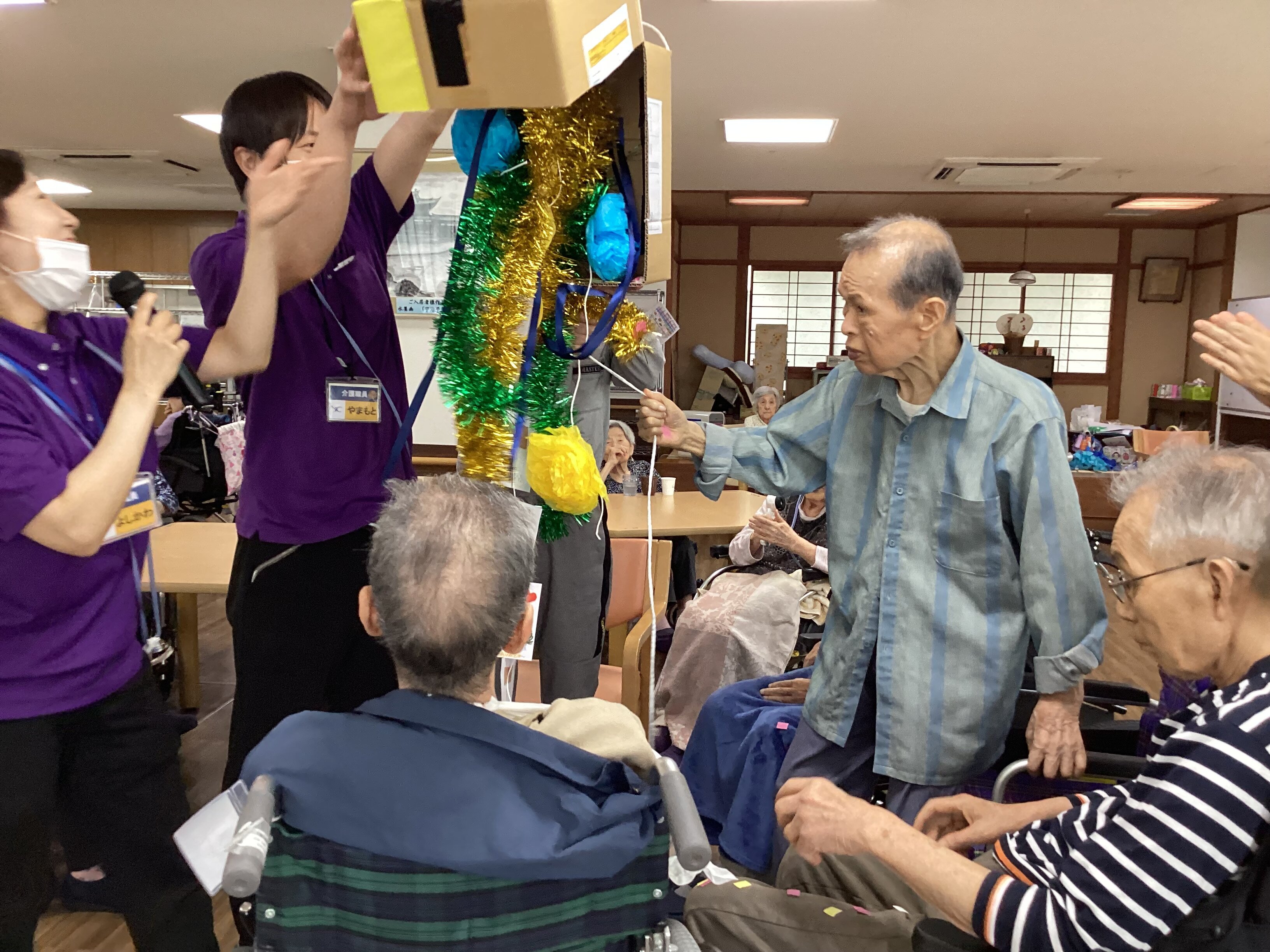 今回の父の日レクでは、職員自作のくす玉を男性ご入居者に割って頂き、