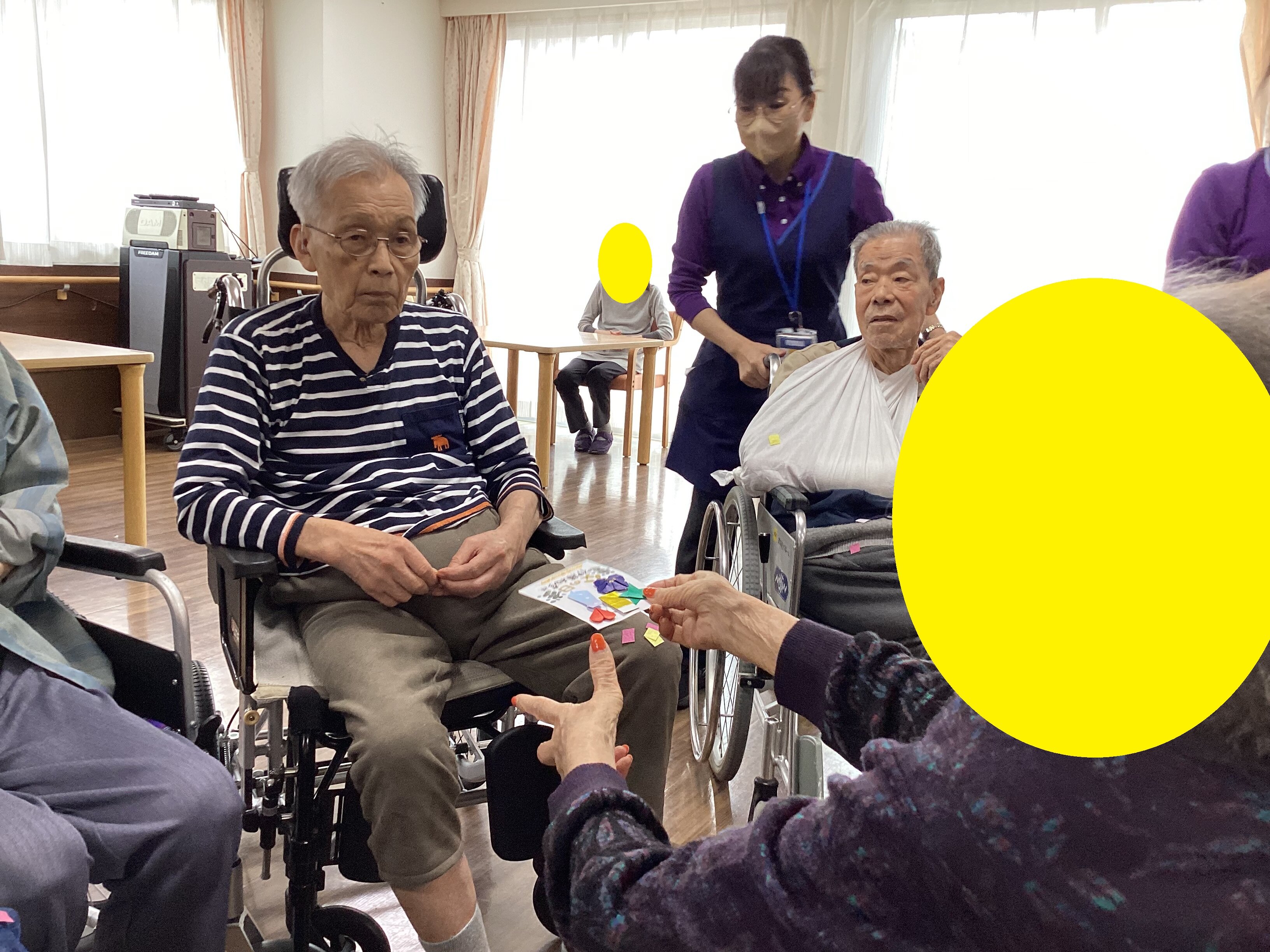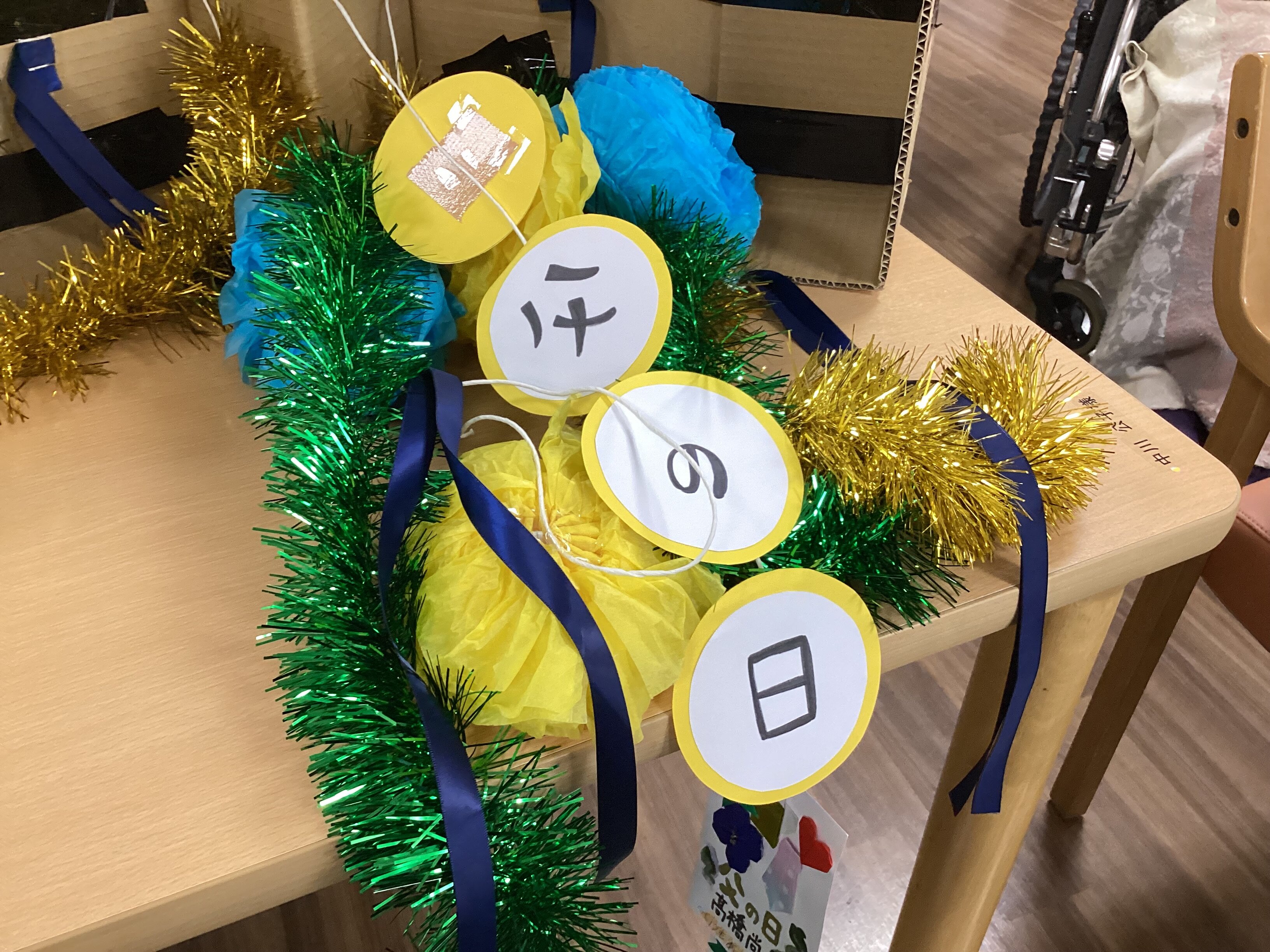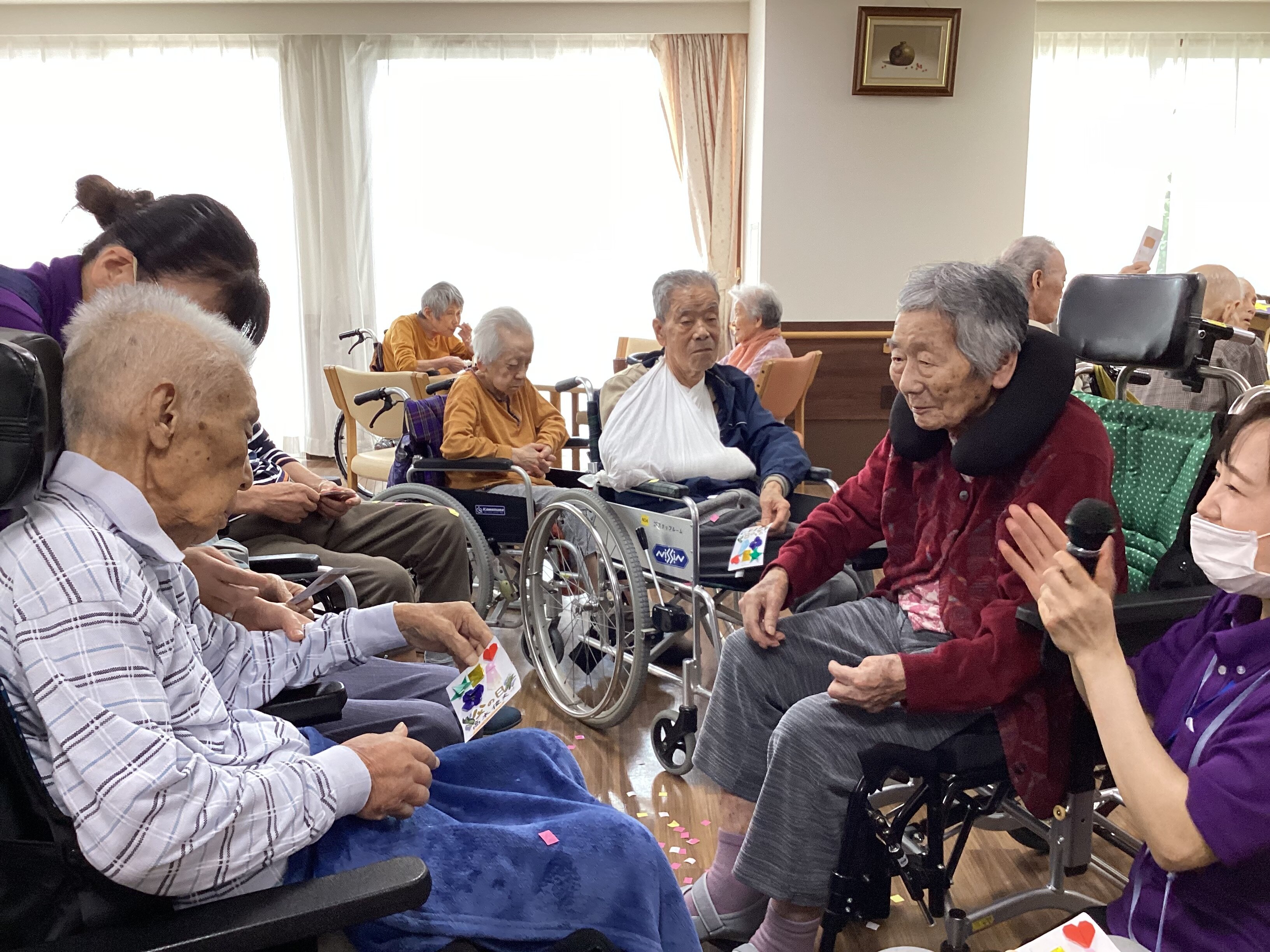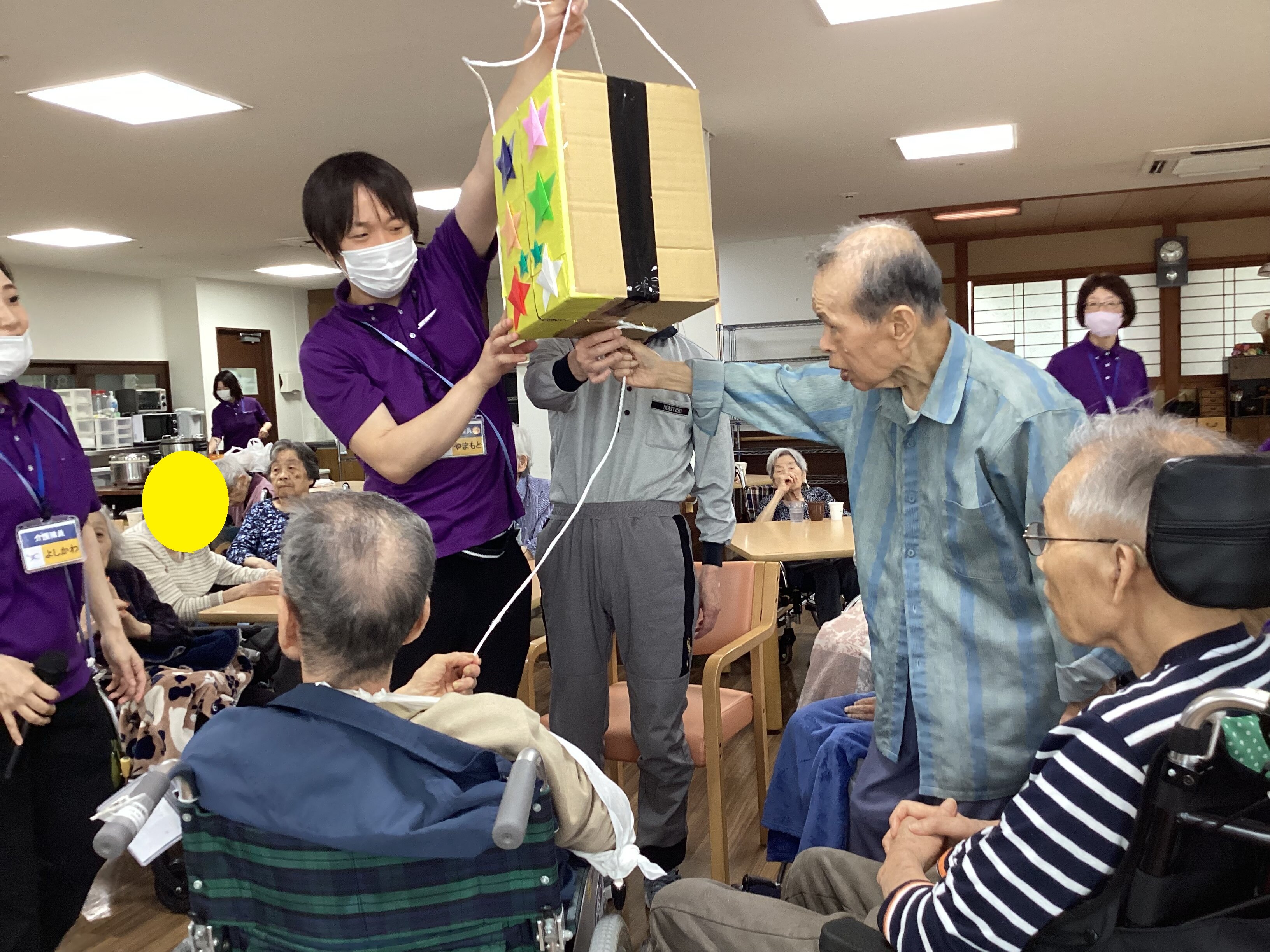 今回の父の日レクでは、職員自作のくす玉を男性ご入居者に割って頂き、