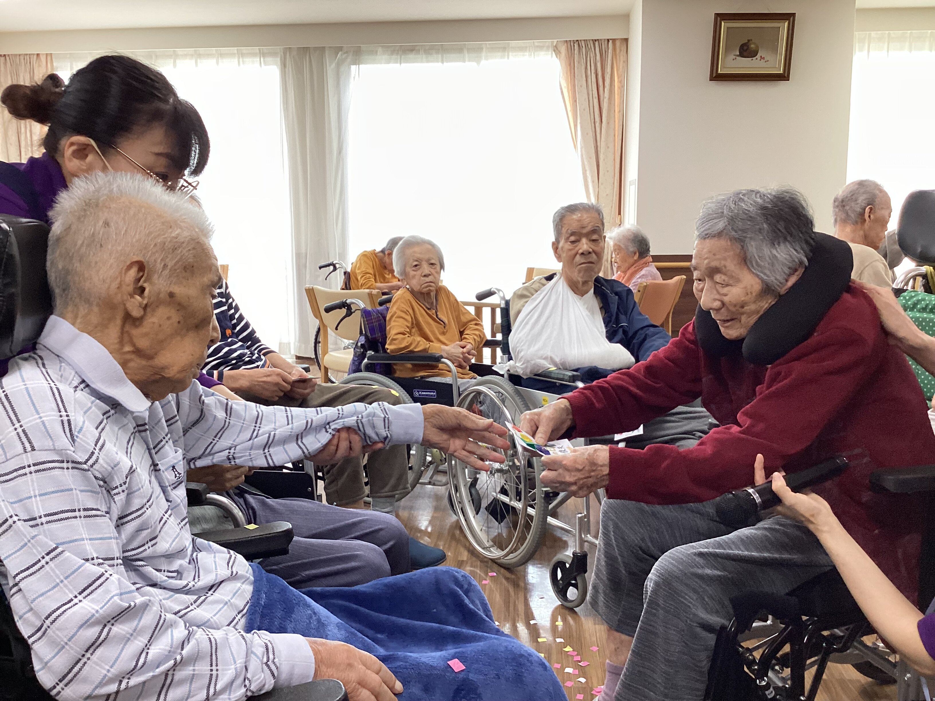 男性ご入居者1人1人に女性ご入居者がメッセージカードを渡す姿を見ていると、