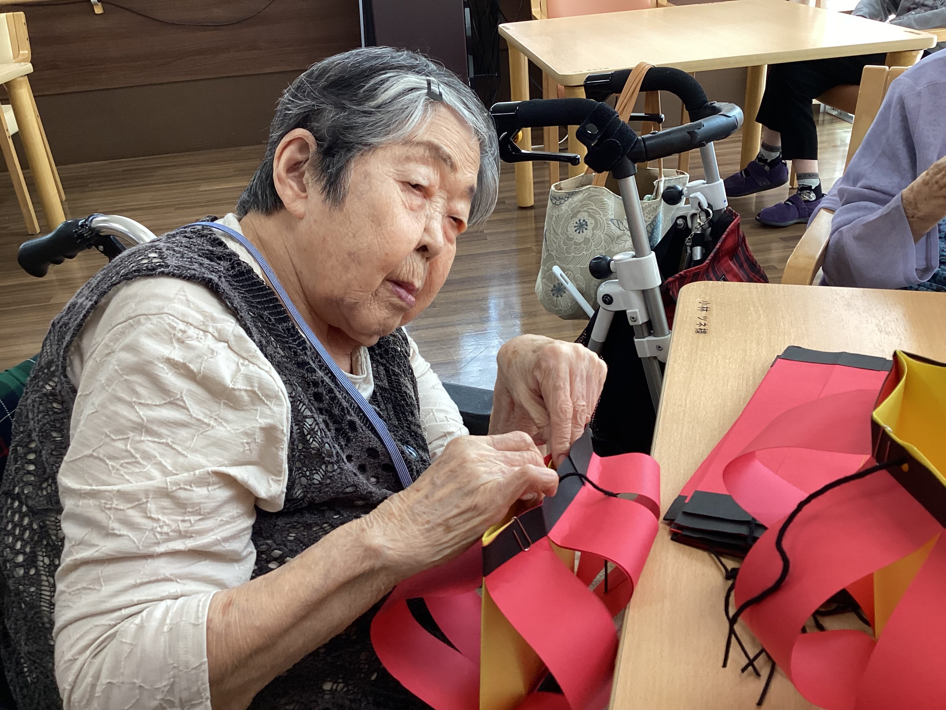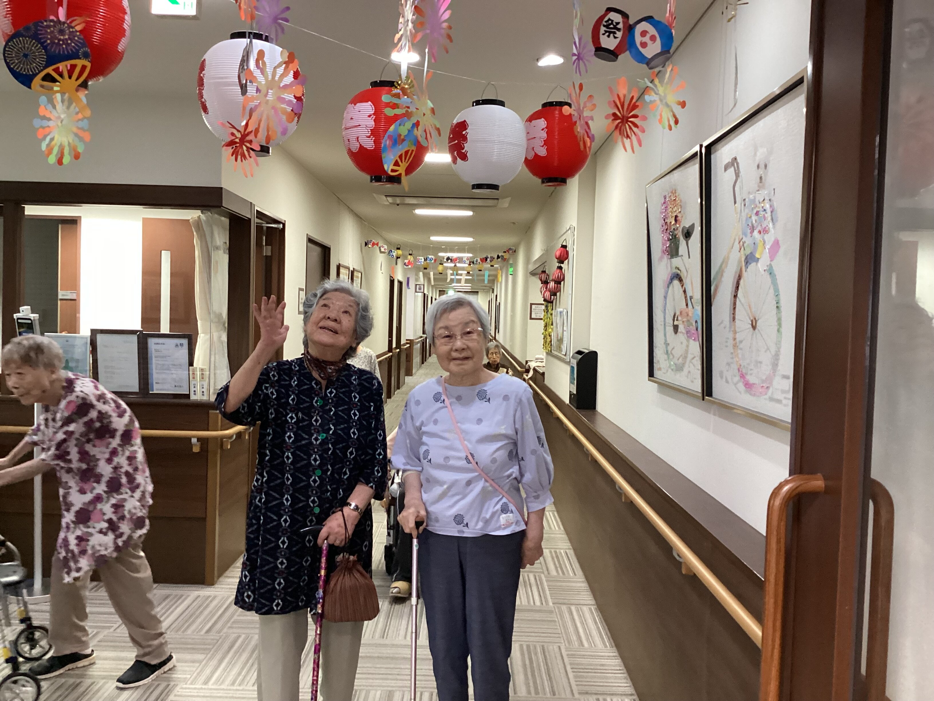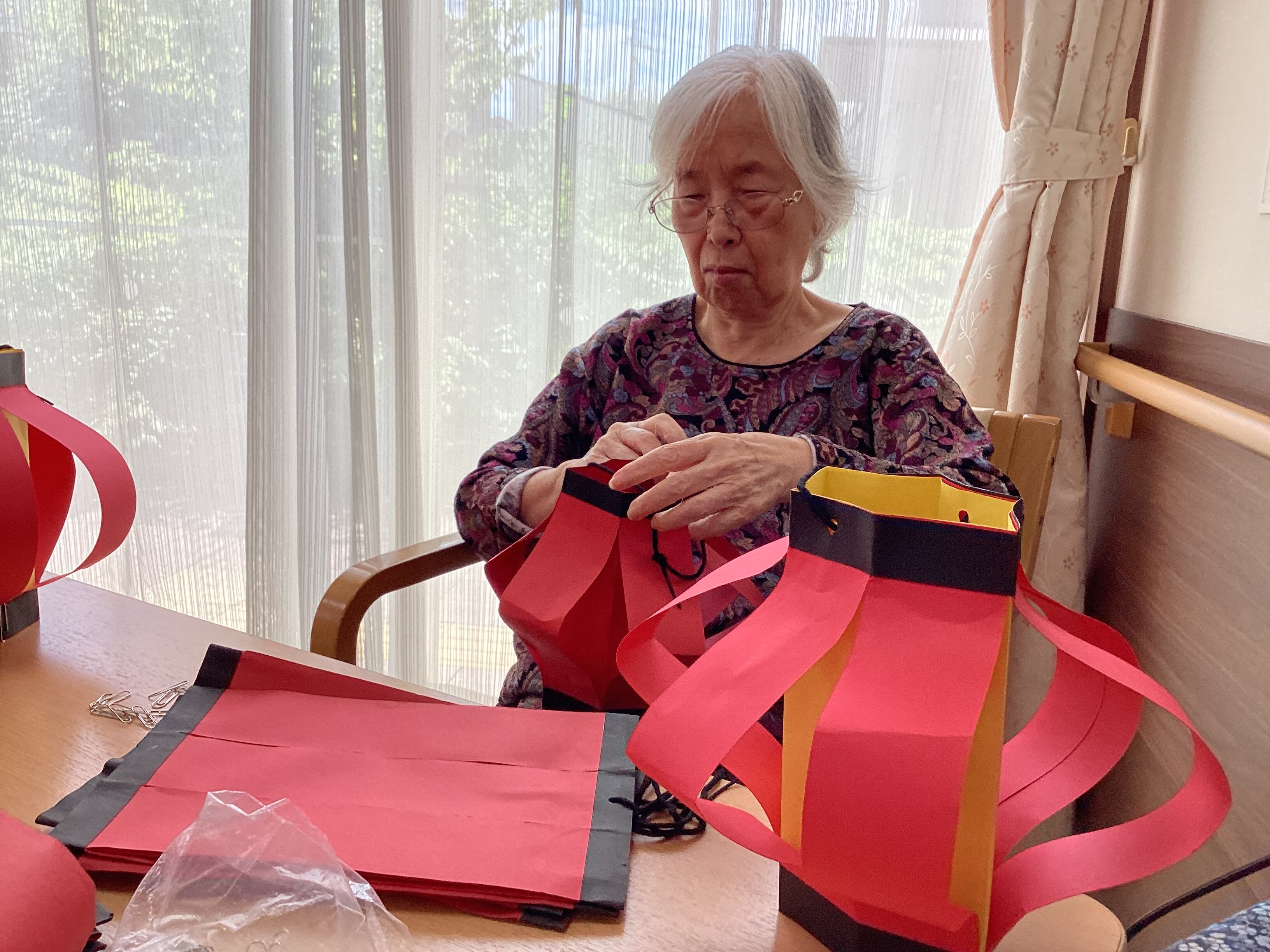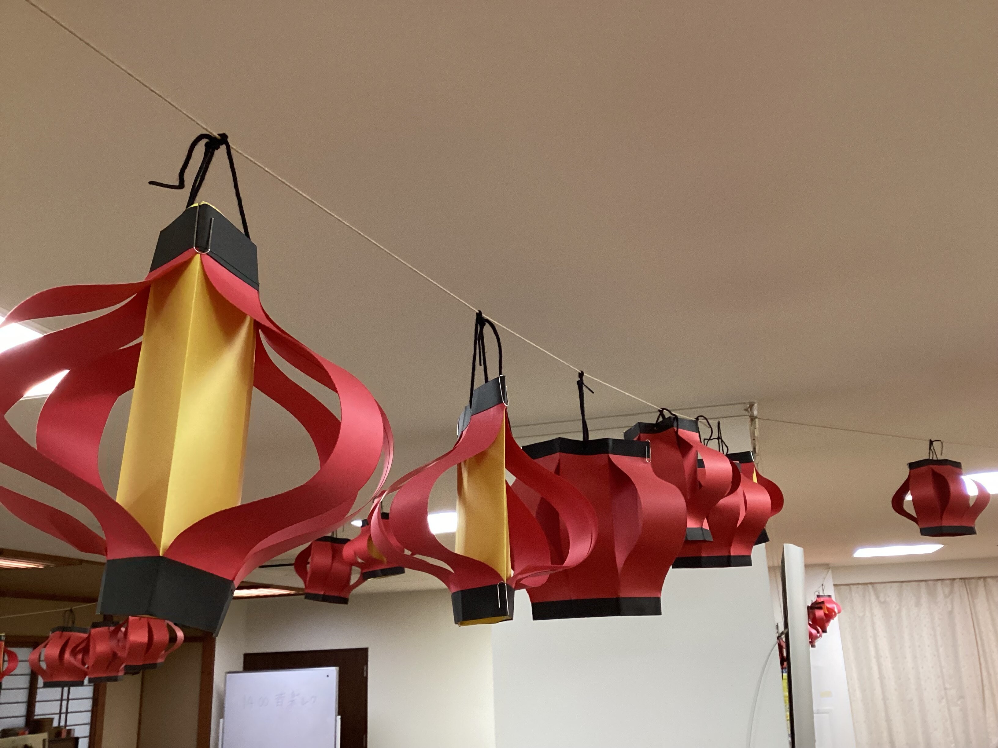 本日は、食堂入口の天井に提灯と花火の飾り付けを行いました!!