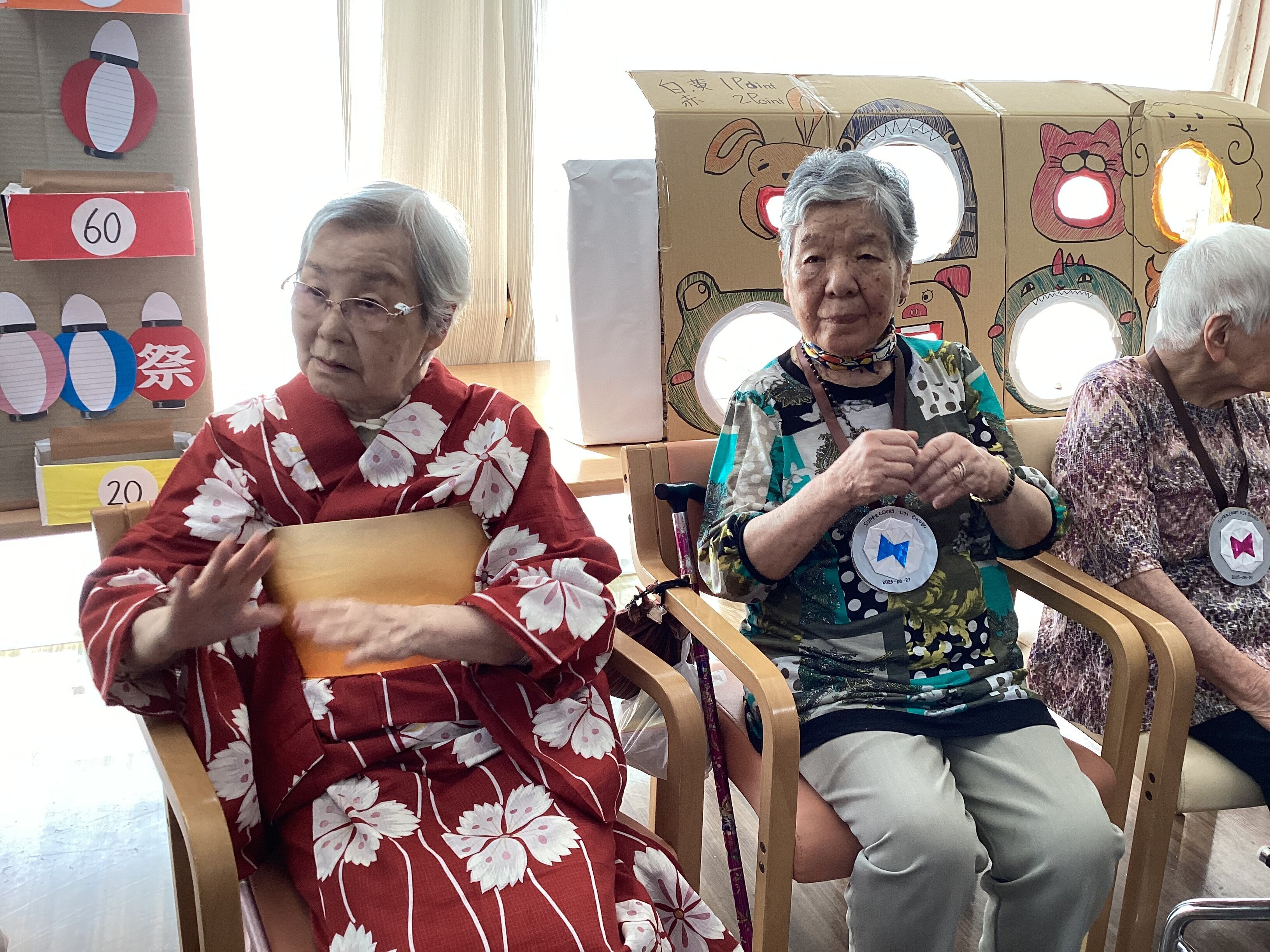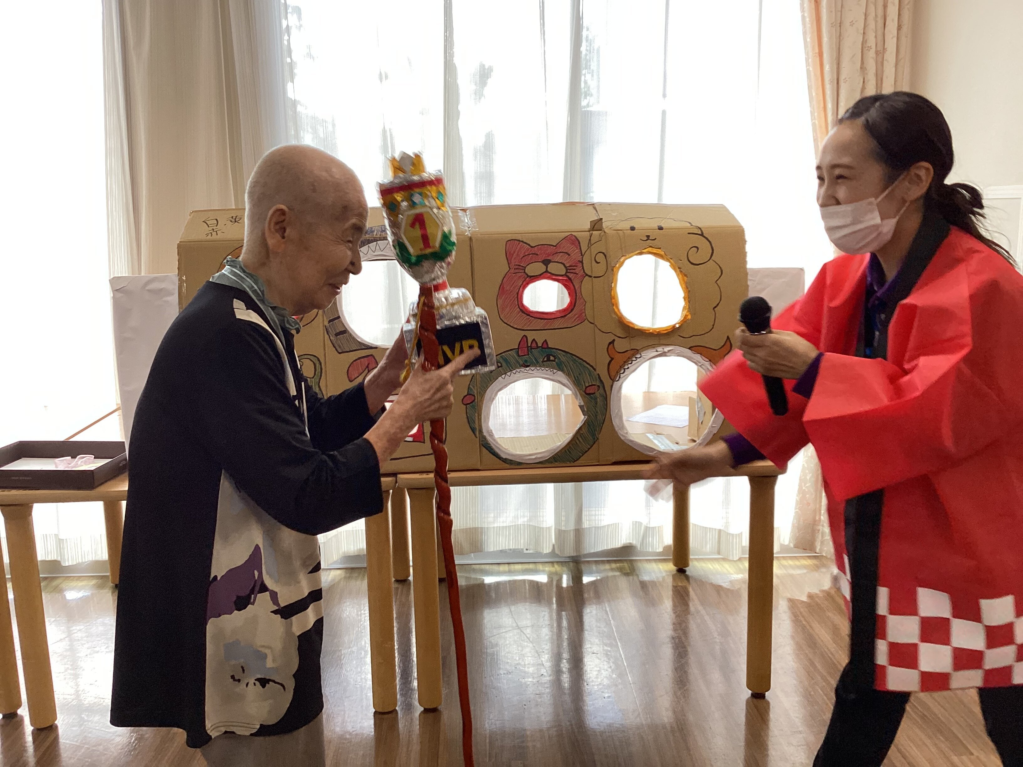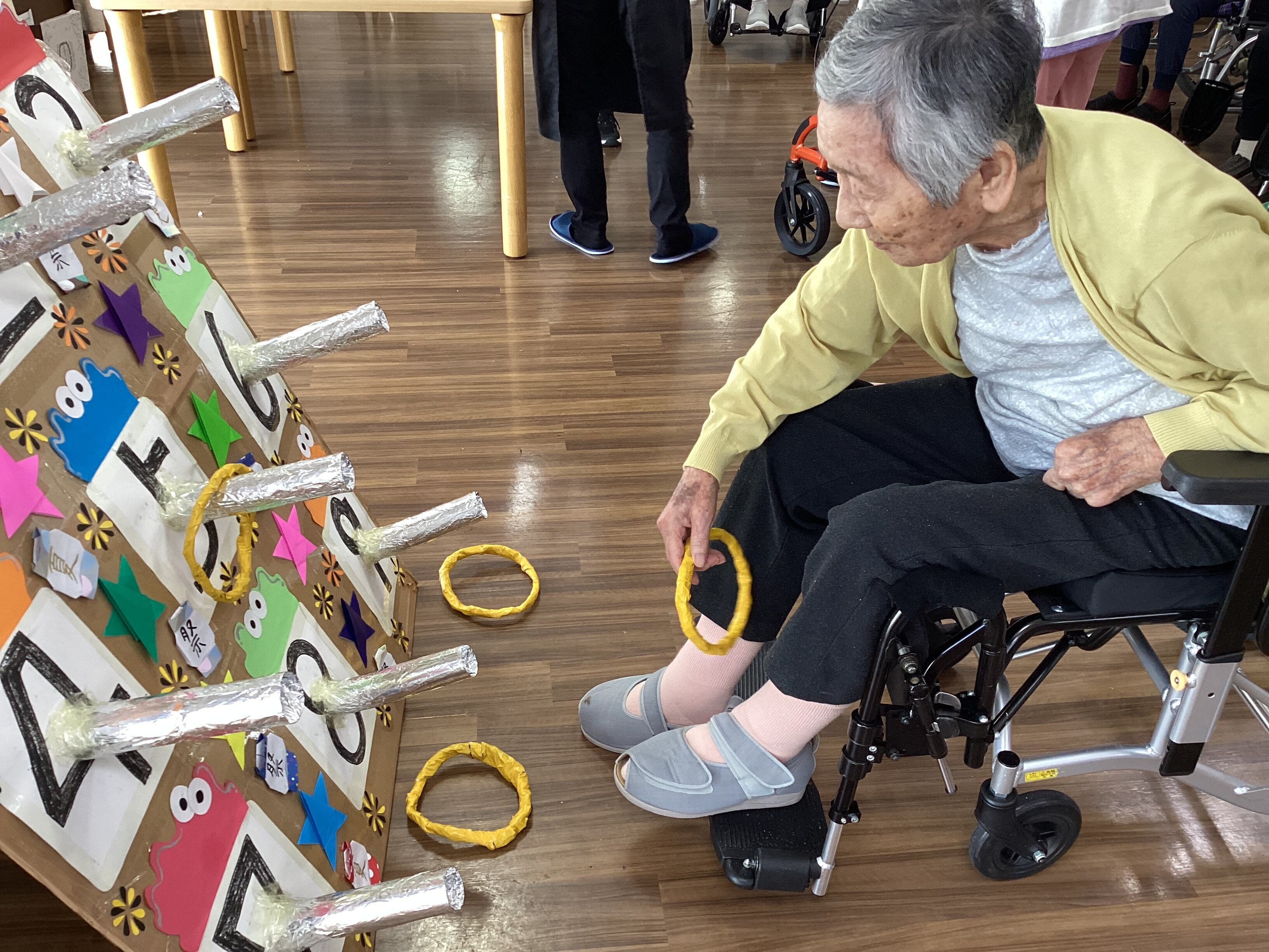 レク委員会が作製した縁日の玉入れ等を皆様、一生懸命にされ