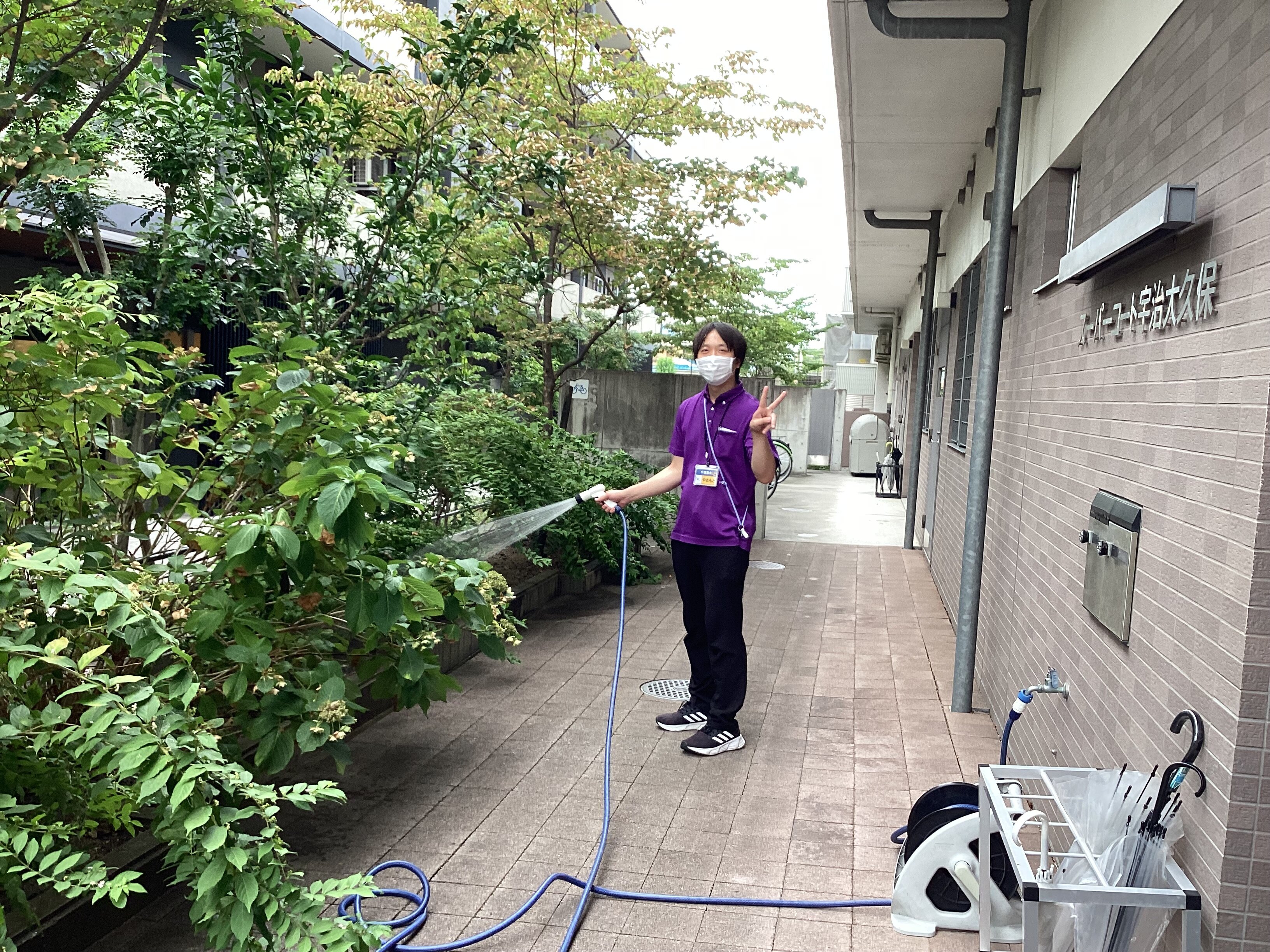 玄関前の花壇の掃除、水やりをしてくださっている所を発見。