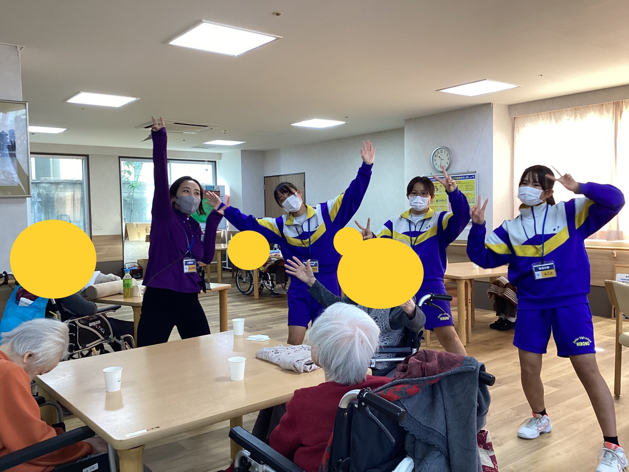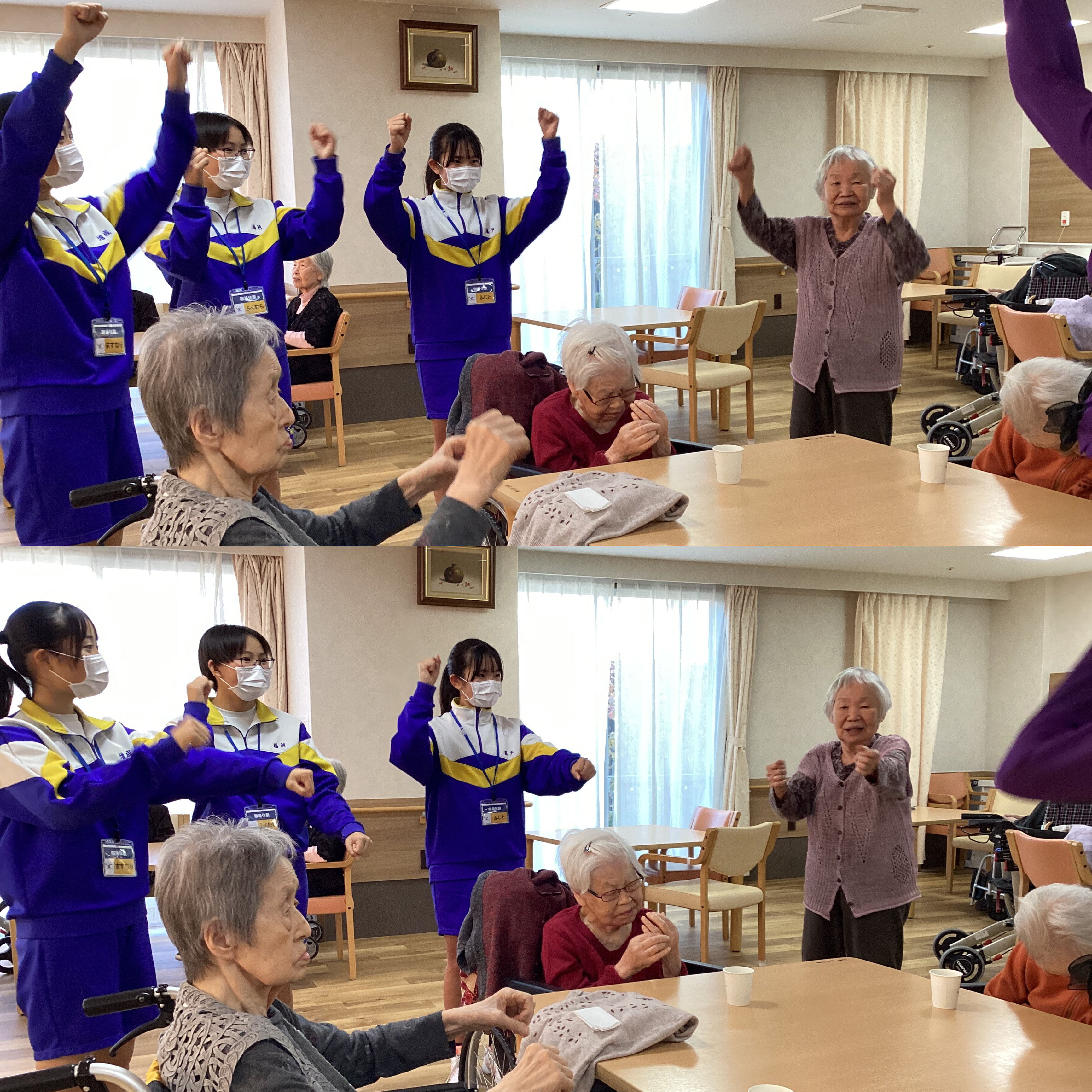 普段行っているチェアリズム体操でご入居者と体を動かし