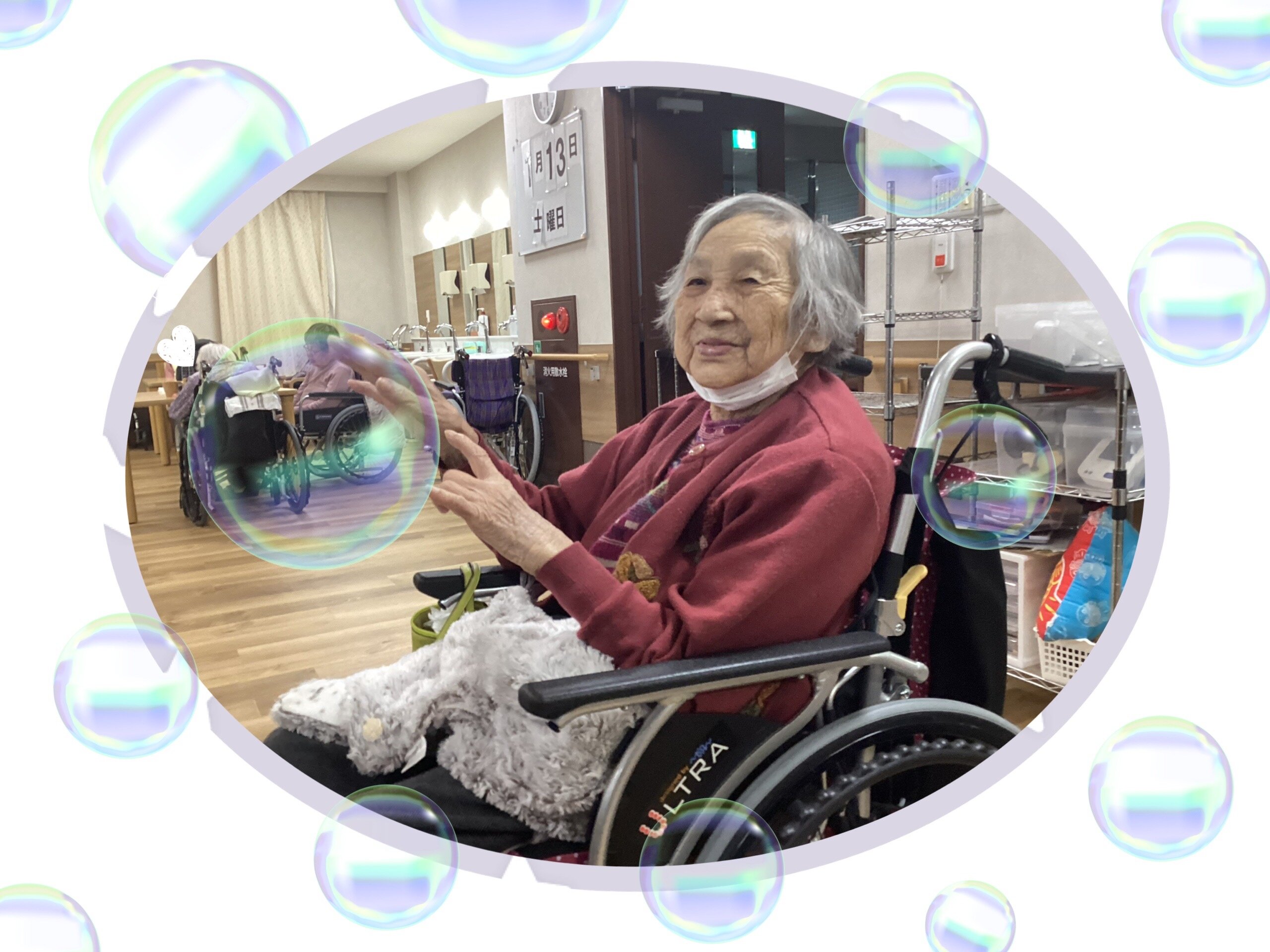 ご入居者様と小さい紙風船を折り、膨らまし、、
