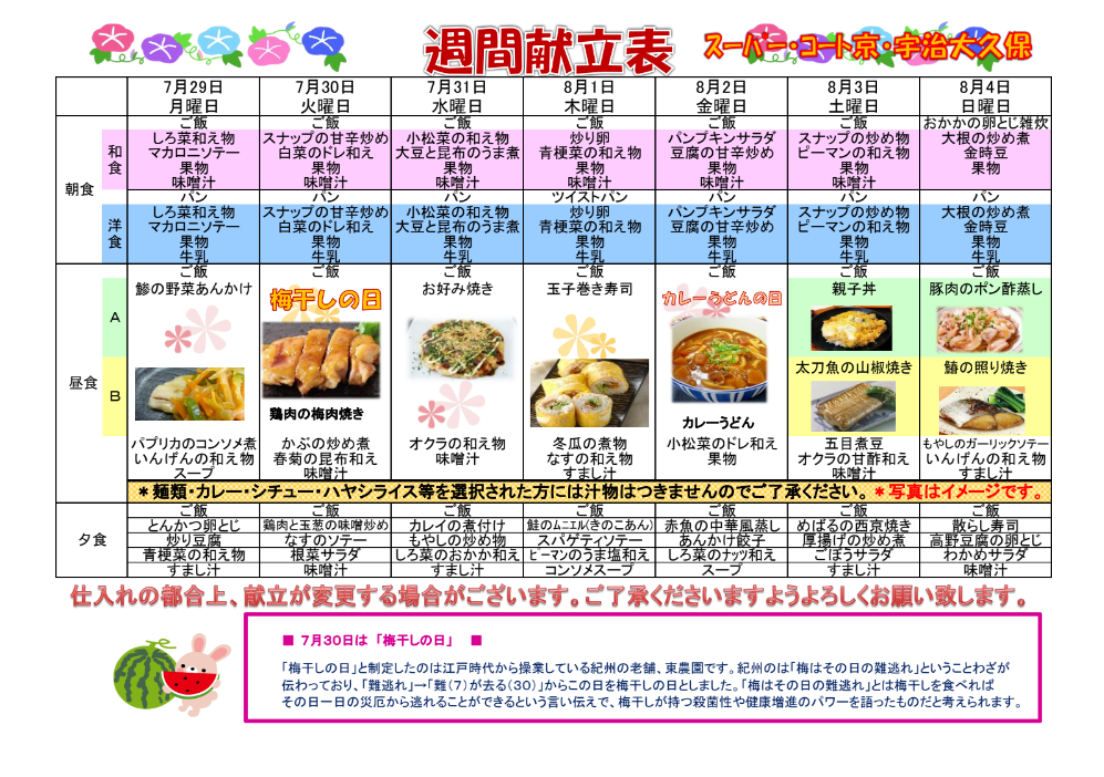 週間献立をお知らせします。