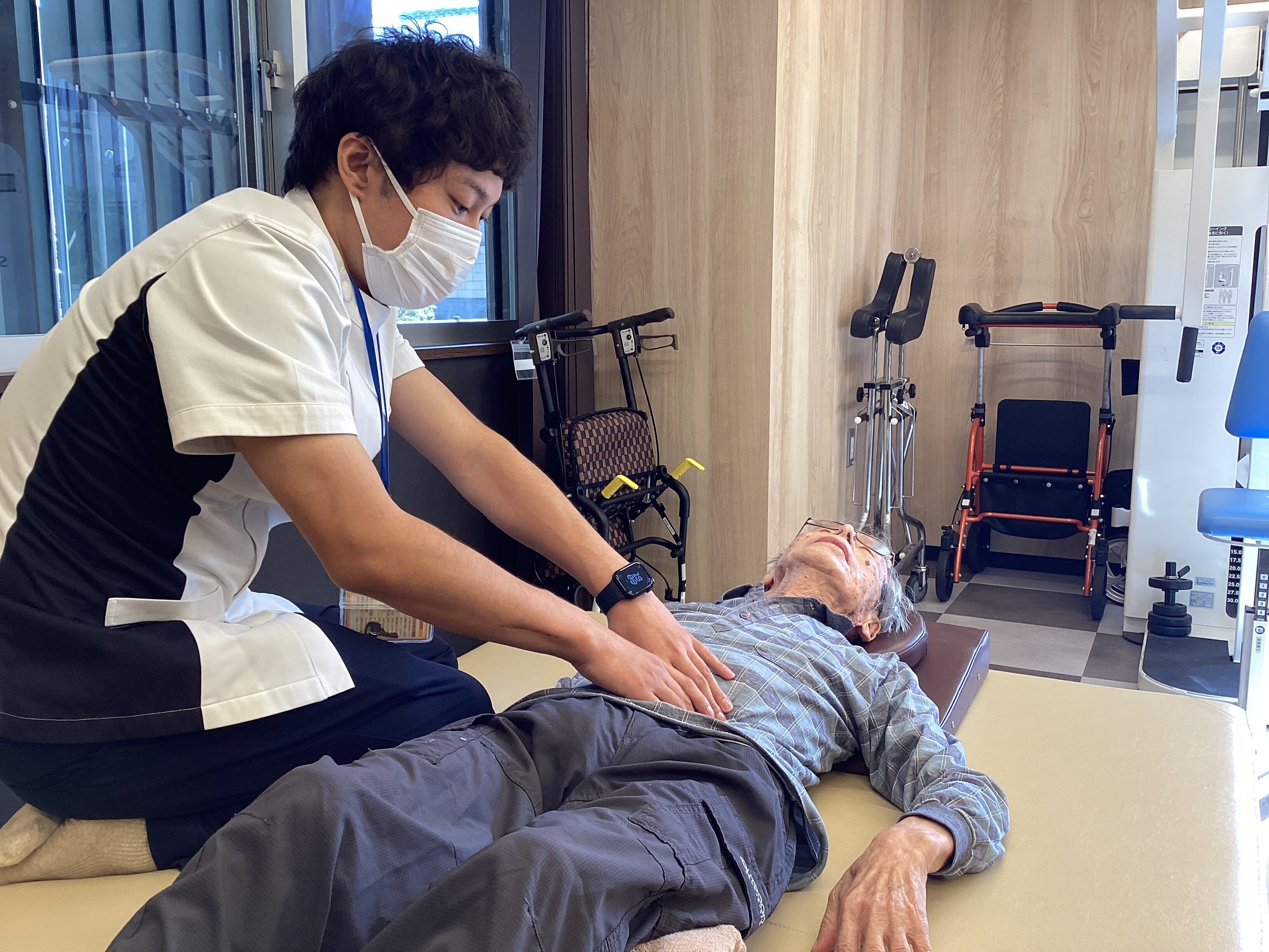 リハビリにて固くなった、お腹の筋肉を柔らかくし、動きやすくすることで、腹筋の活動が高まり、側弯や前傾姿勢が改善されやすくなります。そして、姿勢が整うことで、腰痛などの痛みが改善されることや座位や立位時のバランスが保ちやすくなり、転倒リスクを軽減させることにも繋がります。