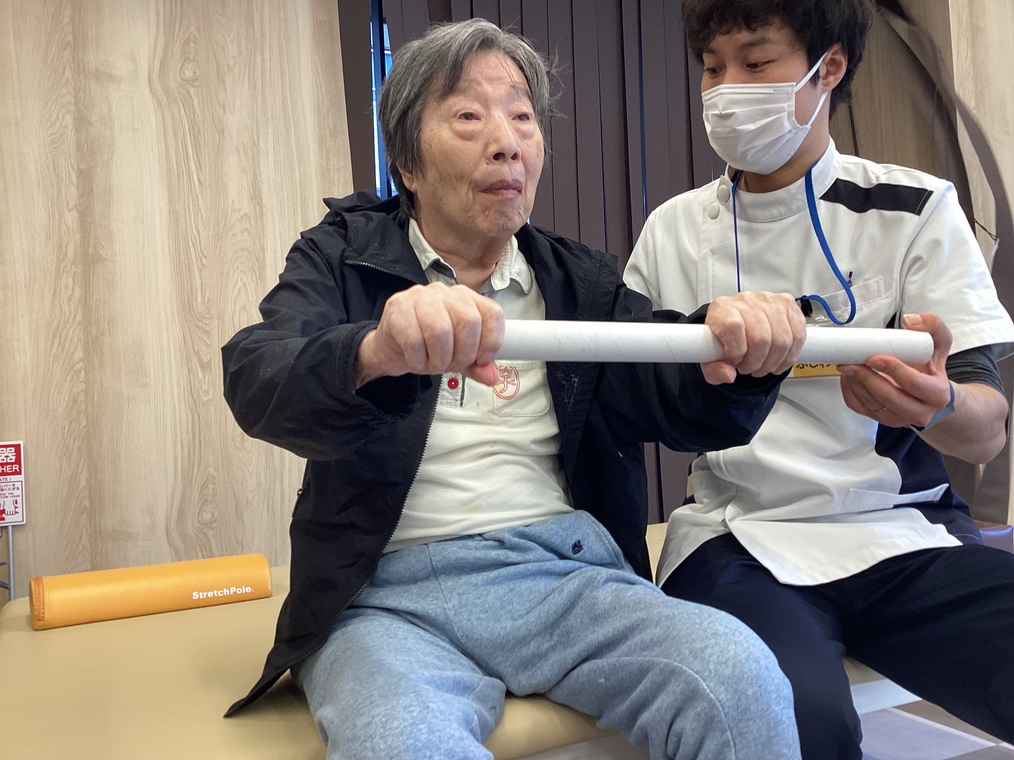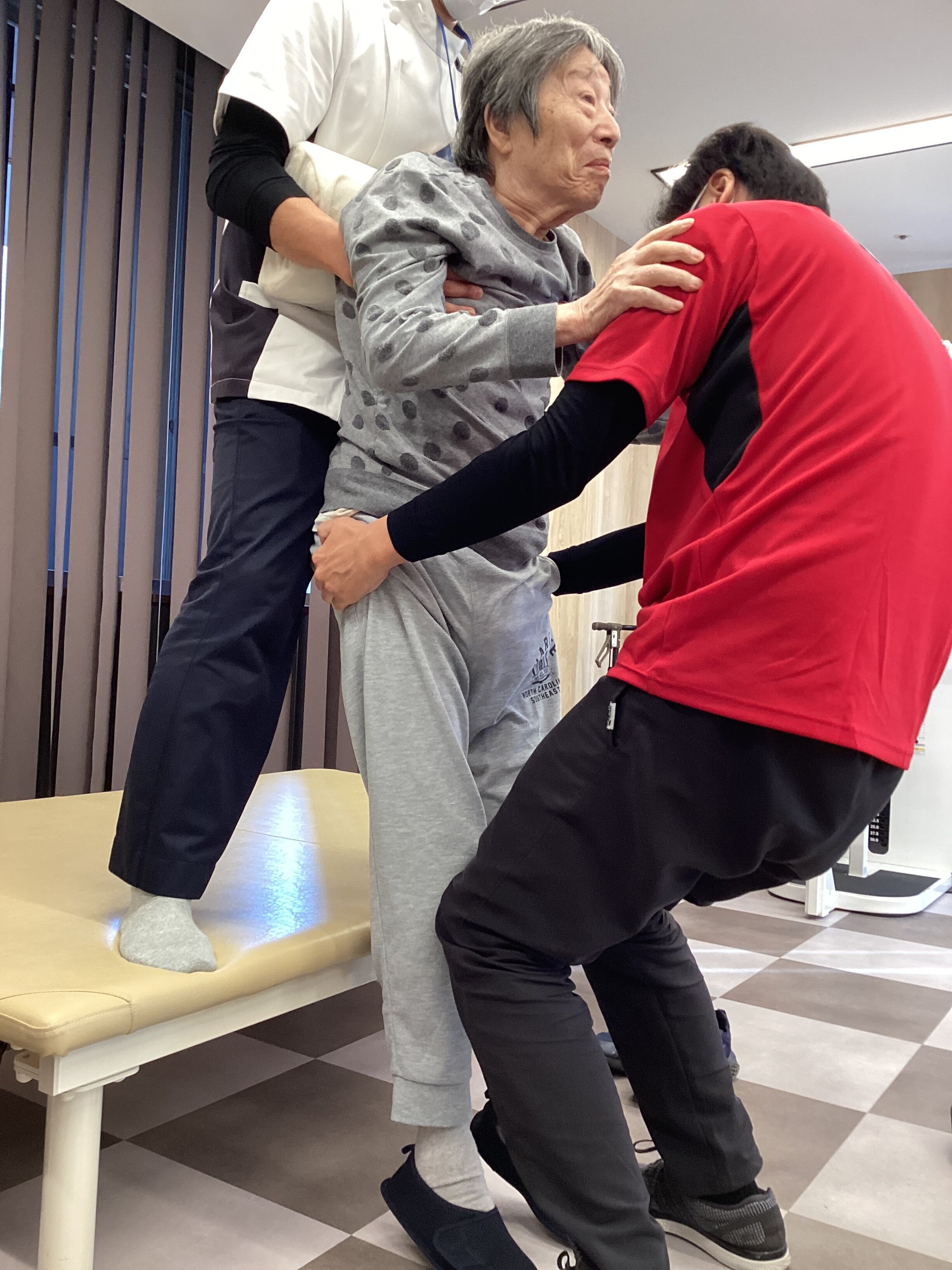 リハビリ前は眠たそうにされている方でも立位練習をすることで、筋肉が働き、目をしっかり開いてシャキッとされる方が多くいます。