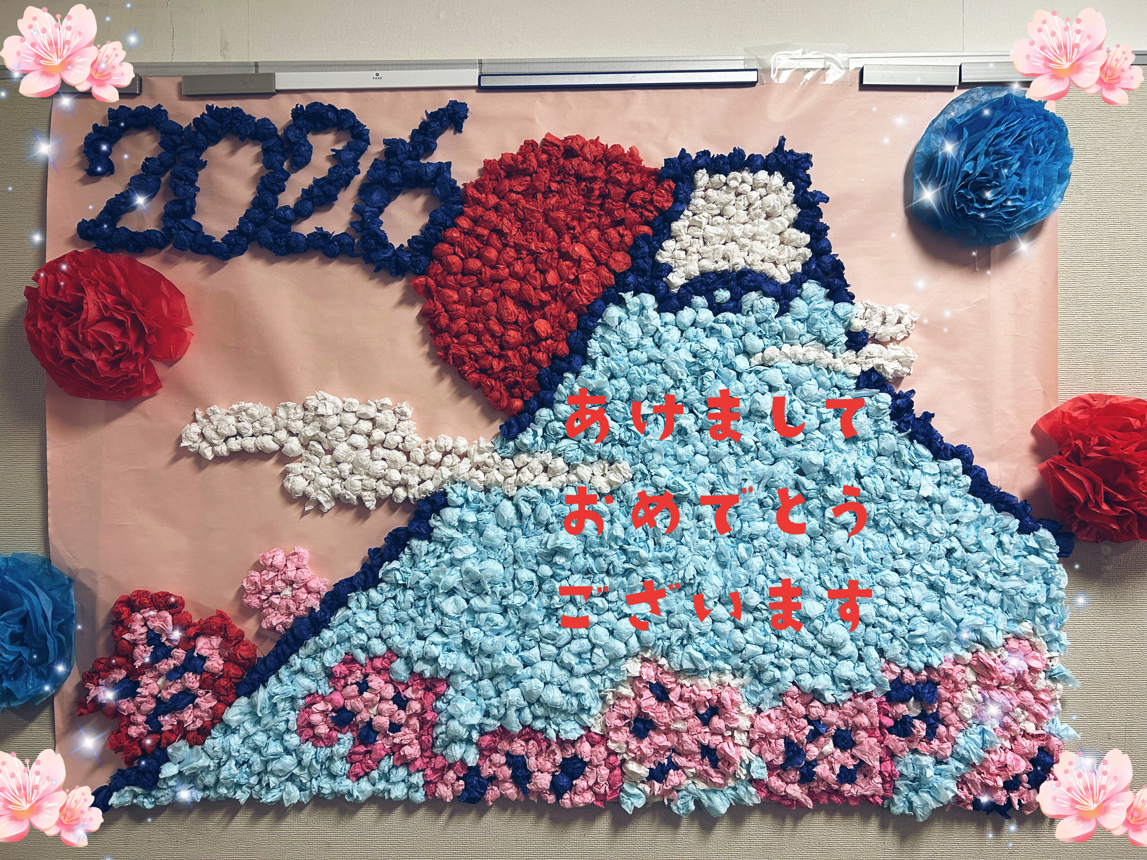 12月末から「ここは青色やね」「次はピンクを貼るよ」と声を掛け合いながら、皆様で一丸となって制作を進めてきました。