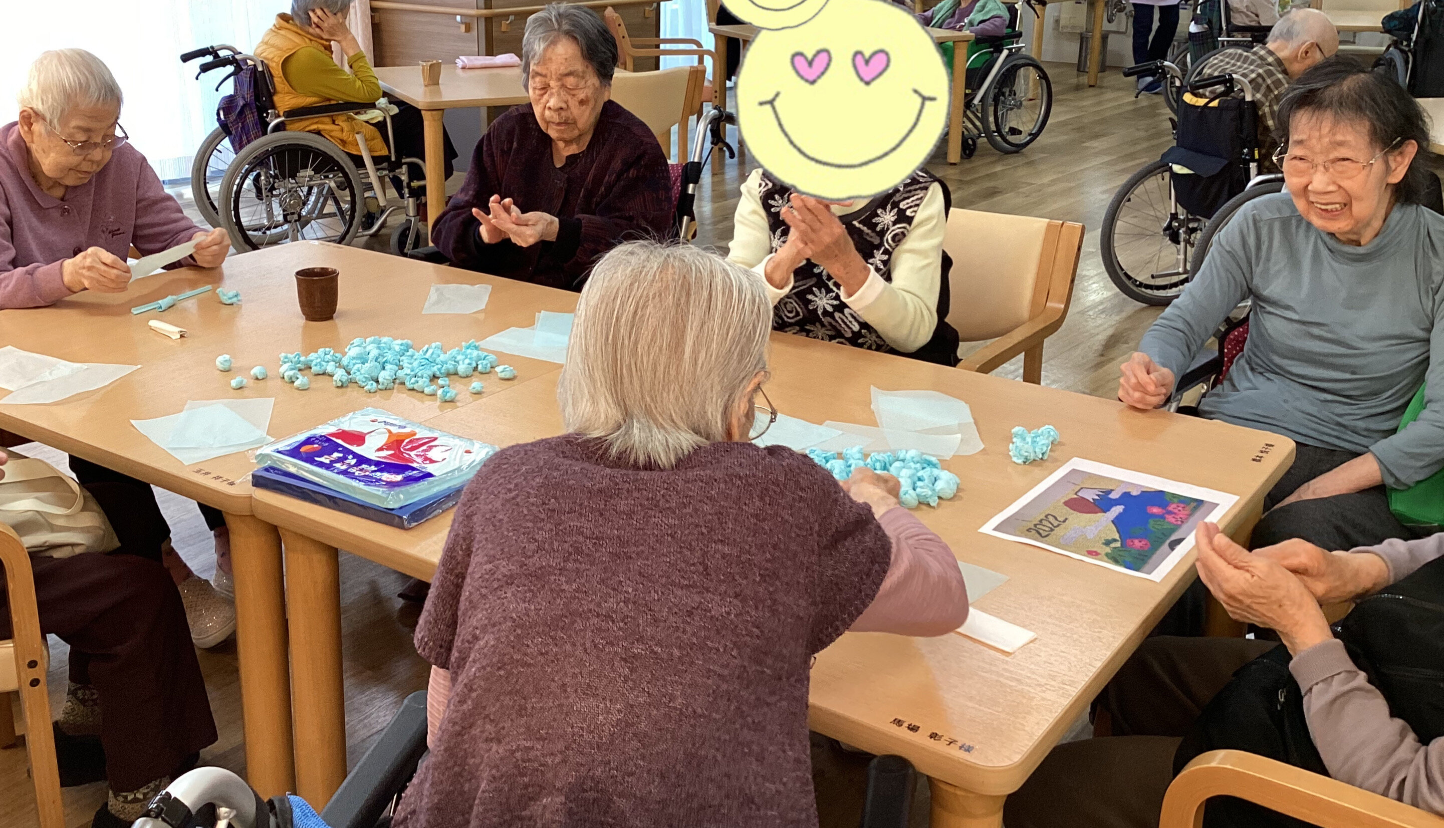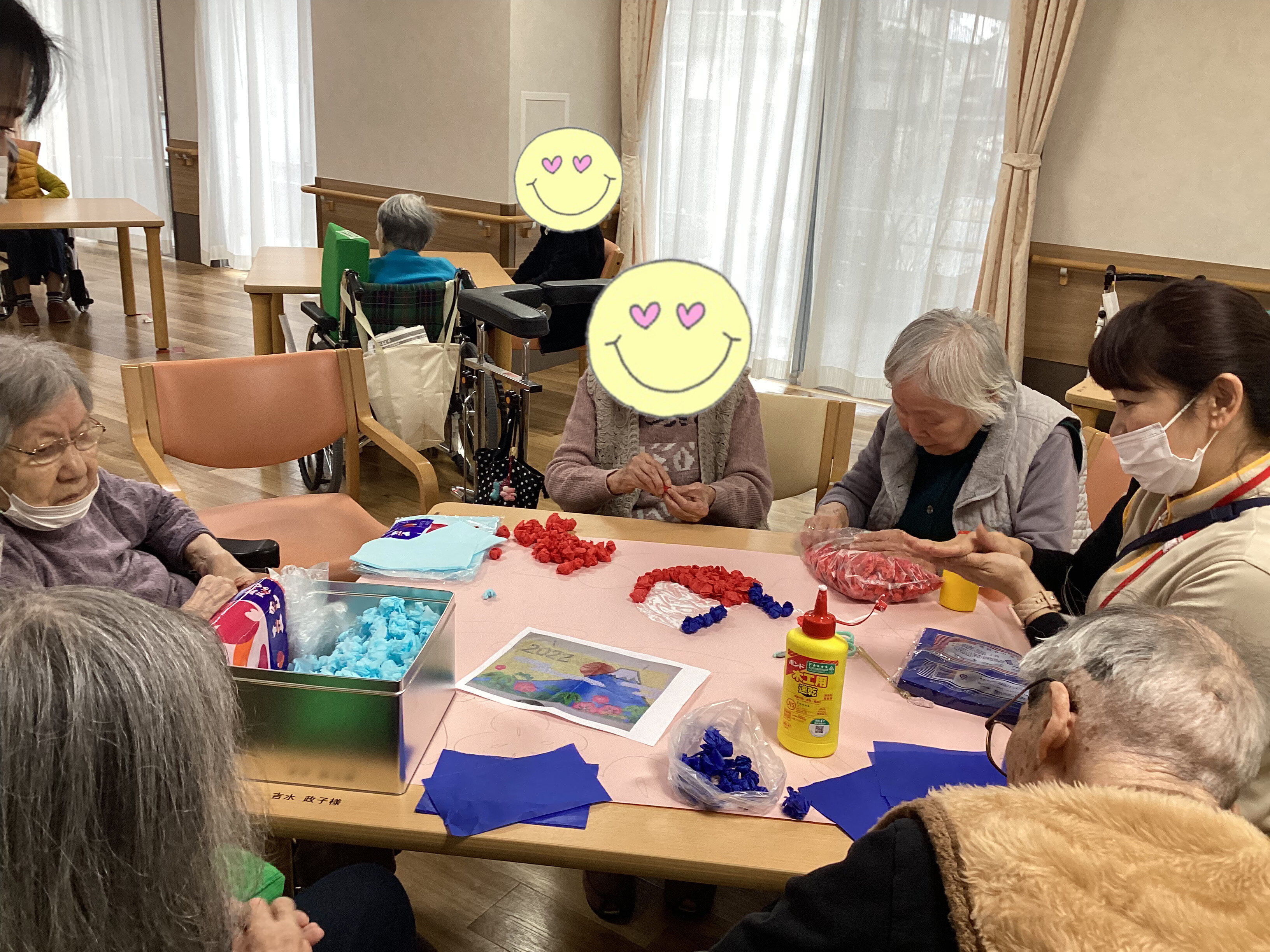 当施設では、こうした創作活動を通じて、季節を感じるだけでなく、手指のリハビリや皆様同士の交流の場を大切にしています。
