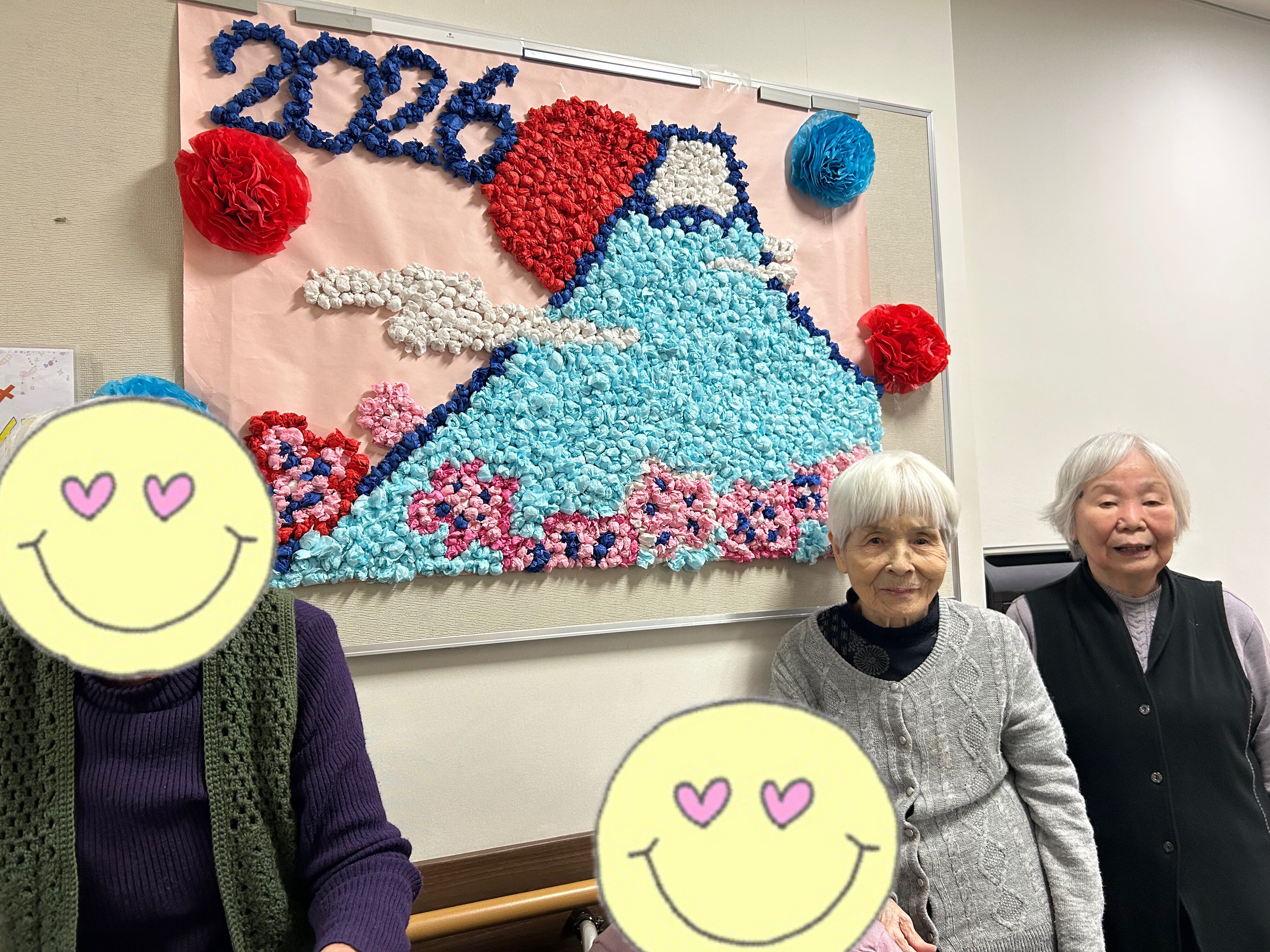お正月のおめでたい雰囲気をより一層盛り上げようと、昨年末からご入居者の皆様とコツコツ取り組んできた「新春の壁画」がついに完成いたしました!